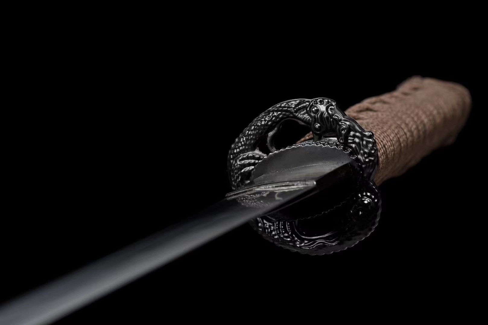 - Stichblatt (Tsuba 鍔): Aufgerollter Drache aus schwarzer Eisenlegierung.