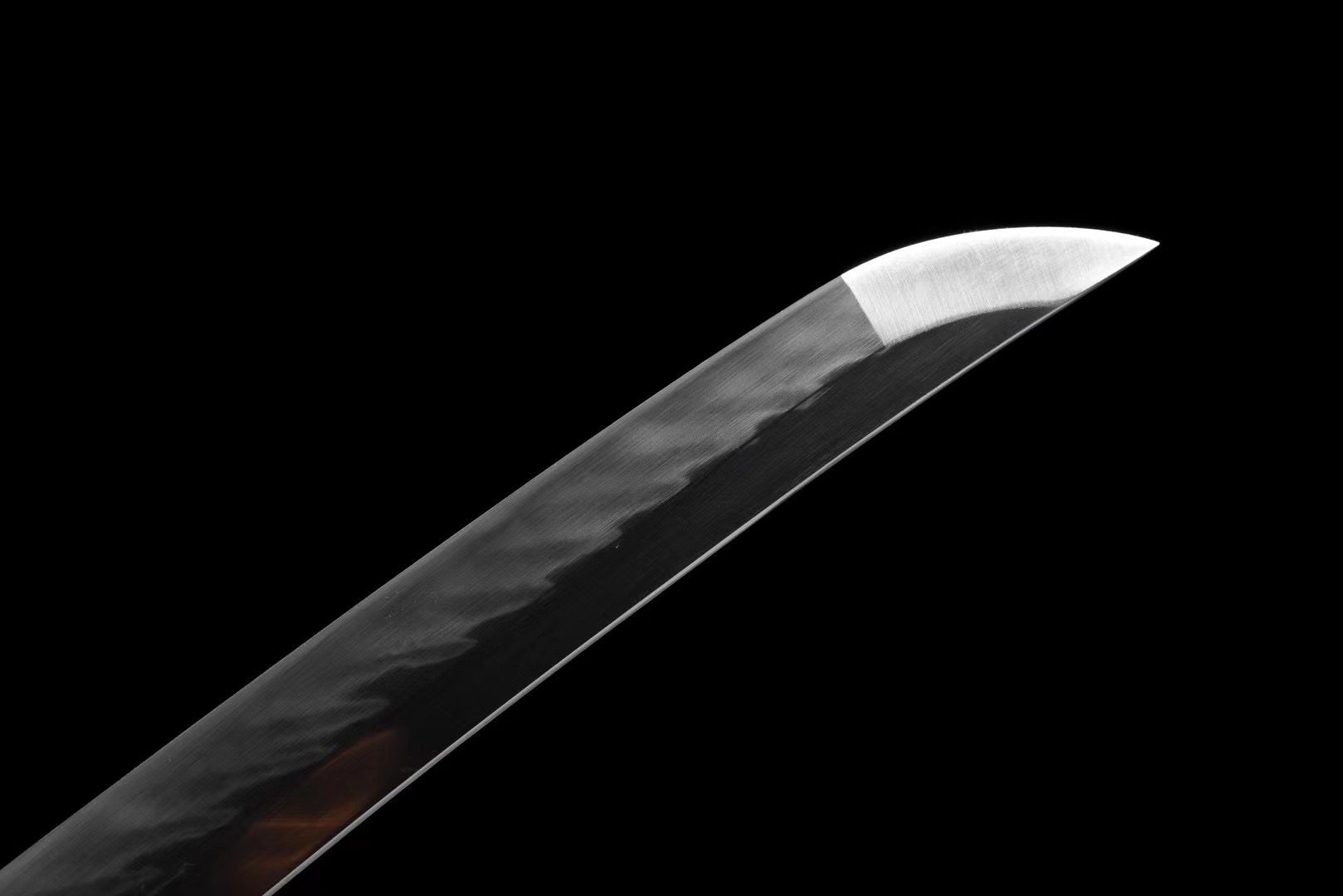 Die Klinge aus T10-Stahl weist ein authentisches Notare Hamon auf, das Ergebnis einer traditionellen unterschiedlichen Härtung, die natürliche Wellen entlang der Schneide erzeugt. Diese alte Technik verleiht der Klinge ihre außergewöhnliche Festigkeit und bewahrt gleichzeitig ihre Flexibilität. Die Tsuba zeigt einen Drachen, der sich in einer schwarzen Eisenlegierung windet, dessen fließende Kurven die dunkle Ästhetik des Ganzen perfekt ergänzen. Der Griff kombiniert harmonisch Holz und schwarze Kunstrochenhaut, während die braune, mit Rautenmuster verzierte Umwicklung (Tsuka-Ito) einen kontrastierenden Hauch von Wärme verleiht. Die Menuki sind mit kleinen schwarzen Drachen verziert, die die Hand des Trägers zu bewachen scheinen. Die schwarz lackierte Schwertscheide ist mit einem goldenen Drachen verziert, einem himmlischen Wesen, das majestätisch aus der dunklen Oberfläche emporsteigt und das Gleichgewicht zwischen Schatten und Licht symbolisiert.