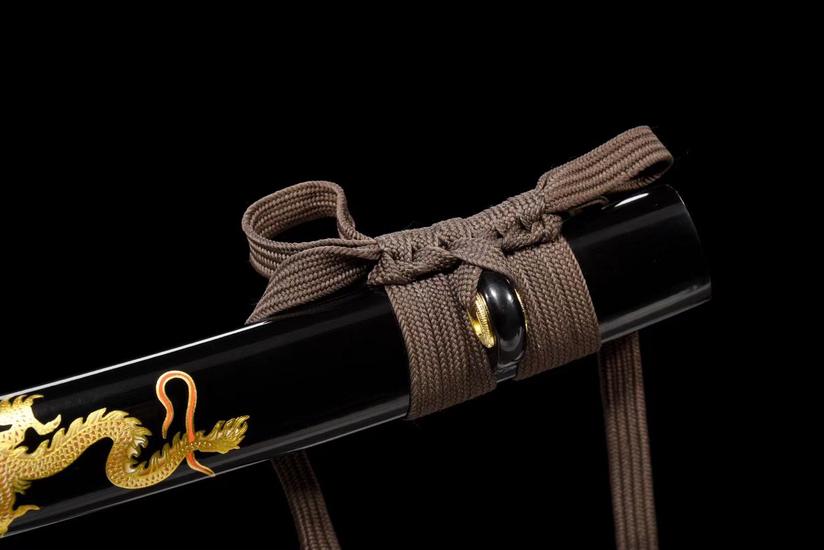 - Schwertscheide (Saya 鞘): Schwarz lackierte Holzscheide mit aufgemaltem goldenem Drachen.