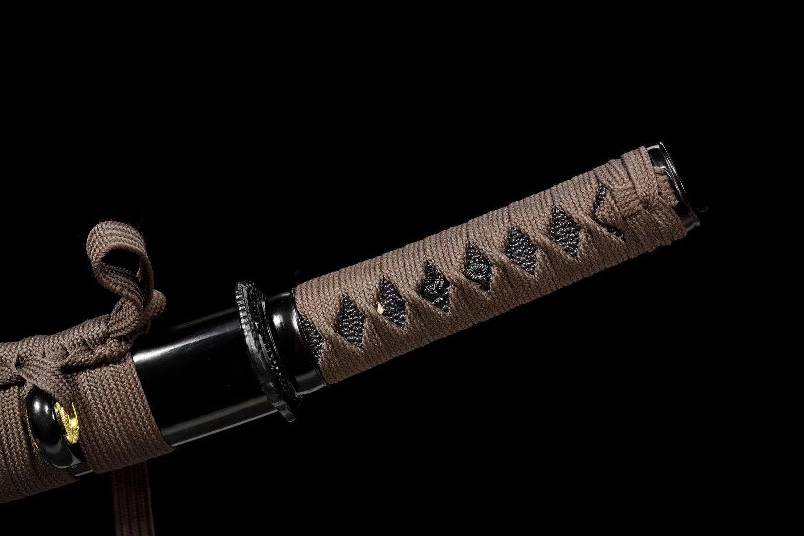 - Tsuka-ITO (柄糸): Braunes Diamantmustergewebe über dem Griff.
