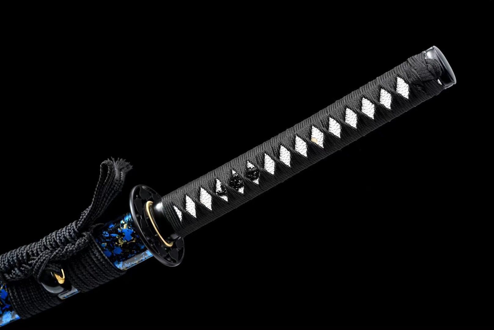 Seine Klinge aus T10-Stahl zeichnet sich durch einen auffälligen Blauton aus, der durch fein gravierte weiße Kamon-Symbole, die einen Kontrast zum metallischen Glanz bilden, noch verstärkt wird. Der runde schwarze Handschutz (Tsuba) aus einer Legierung ist mit präzise gemeißelten Stiftsymbolen verziert, die ein raffiniertes Spiel aus Licht und Schatten erzeugen. Der Griff (tsuka) kombiniert harmonisch weiße Imitationsrochenhaut und schwarzes Geflecht (tsuka-ito) in einem Rautenmuster, während die Menuki einen schwarzen Drachen darstellen, ein Symbol für Macht und Weisheit. Die schwarz lackierte Holzscheide (saya) ist mit blauen und gelben Flecken verziert, die an himmlische Wolken erinnern, ergänzt durch einen schwarzen Sageo und passende Beschläge (kojiri, koiguchi).