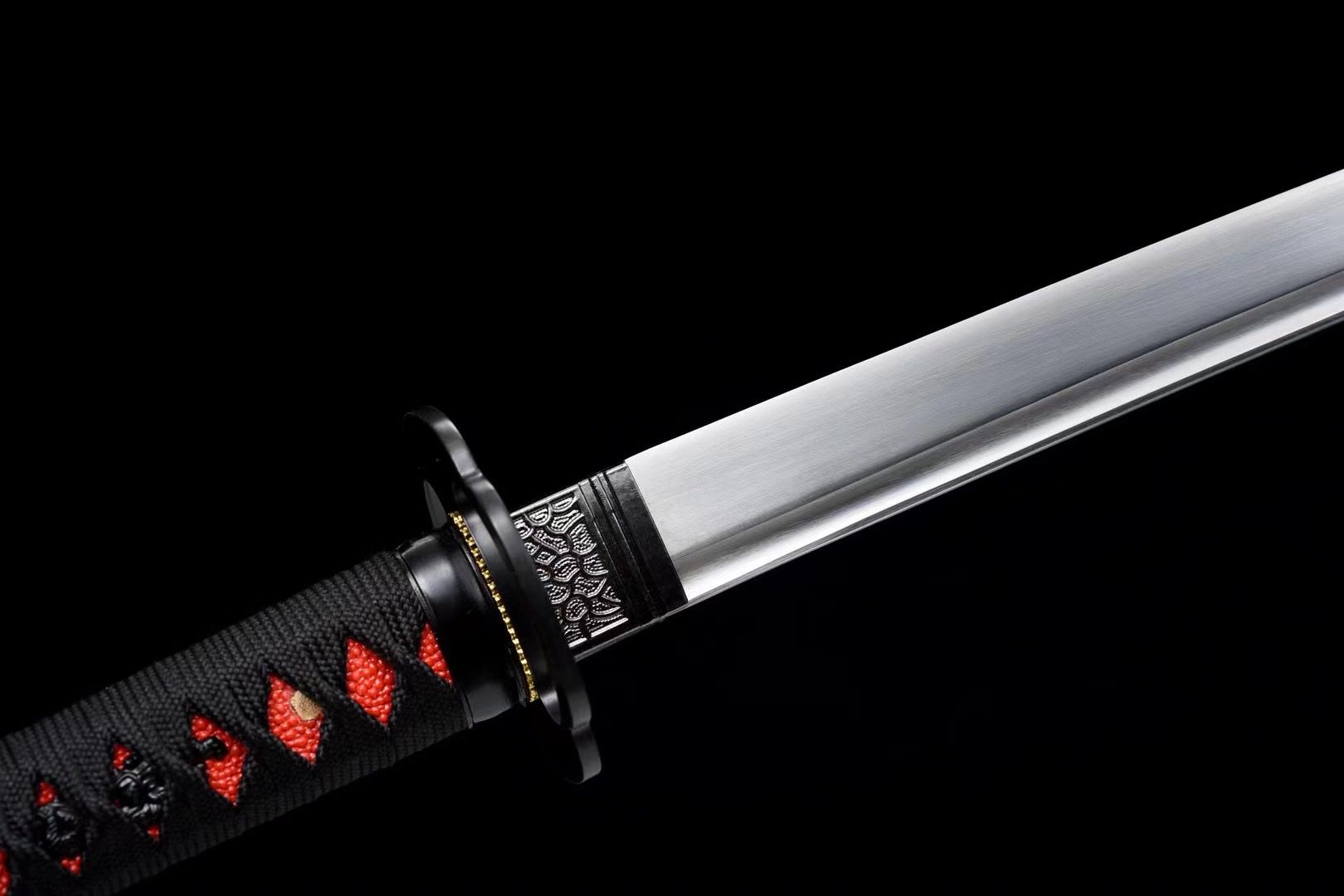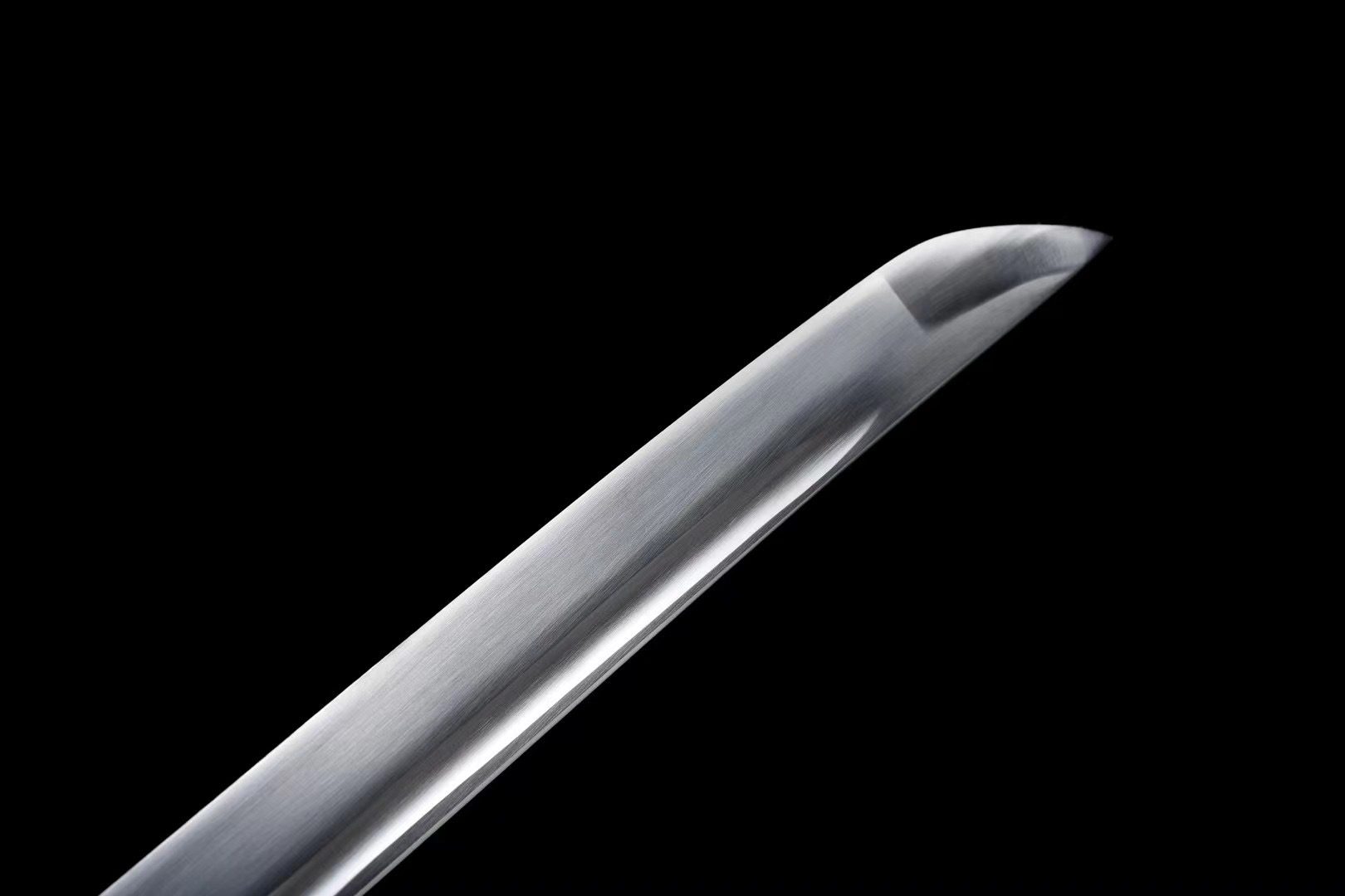 Die naturfarbene Klinge aus T10-Stahl verfügt über eine polierte Oberfläche, die das Licht subtil einfängt, während die in die Oberfläche geschnitzte Bo-Hi den Gesamteindruck aufhellt und beim Bewegen einen charakteristischen Pfeifton erzeugt. Der schwarze Handschutz (Tsuba) aus einer Legierung hat eine hohle, kreuzförmige Blumenform. Der Griff (Tsuka) kombiniert die raue Textur von rotem Imitations-Stachelrochenleder mit schwarzem, diamantförmigem Geflecht (Tsuka-Ito) und sorgt so für einen festen Halt. Die Menuki stellen einen schwarzen Drachen dar. Die weiß lackierte Holzscheide (Saya) mit schwarzen Punkten erinnert an einen sternenklaren Nachthimmel und wird durch ein schwarzes Sageo ergänzt.