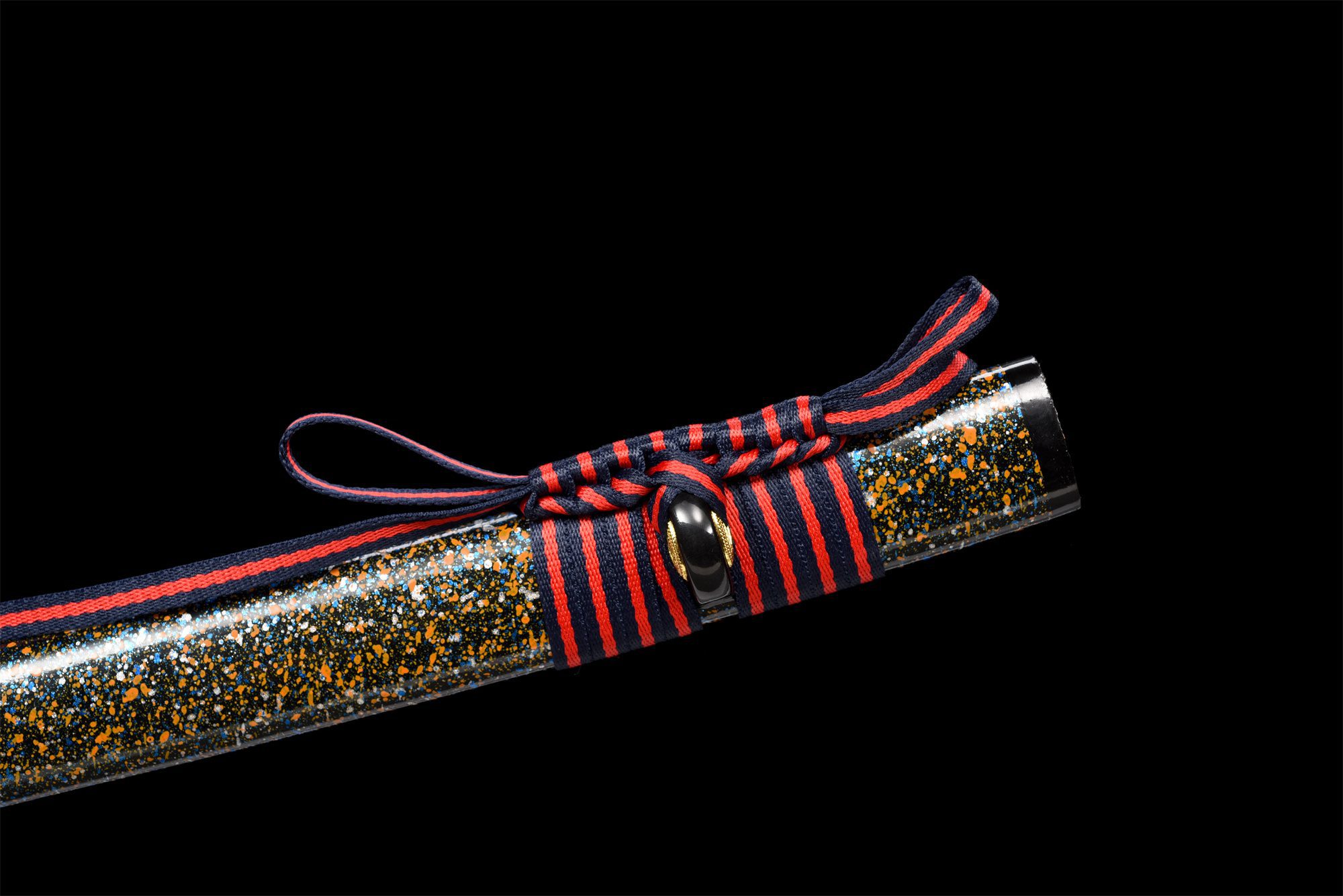 - Schwertscheide (Saya 鞘): Lackiertes Holz mit orangefarbener, schwarzer und blauer körniger Farbe, schwarze Spitzen.