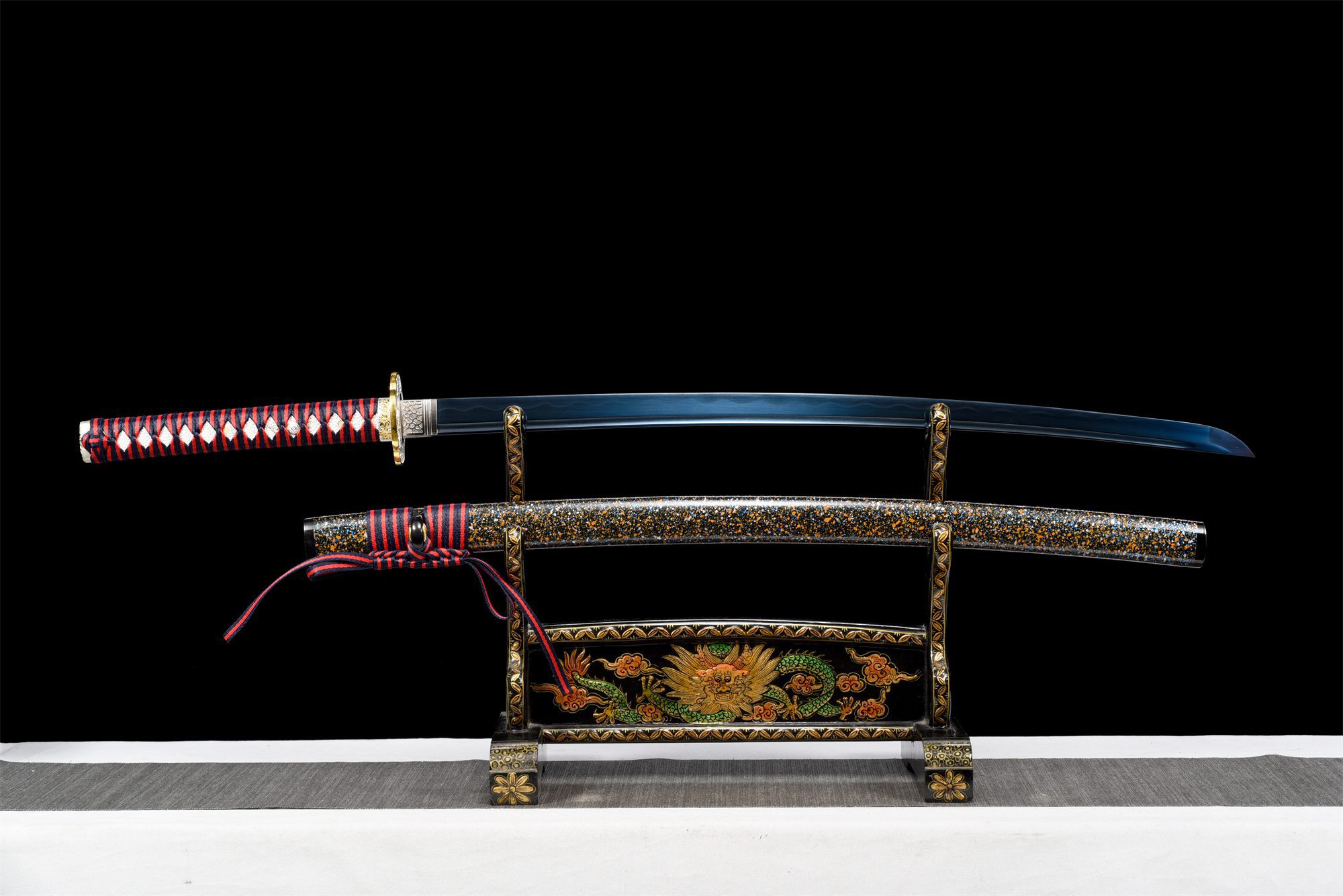 Die Klinge aus 1060er Stahl hat einen tiefblauen Farbton, der einen schönen Kontrast zu dem durch unterschiedliche Härtung entstandenen echten Notare Hamon bildet. Die Bo-Hi lockert die Struktur auf und erzeugt beim Schneiden den charakteristischen pfeifenden Klang. Die goldene Tsuba in Form eines abgerundeten Kreuzes ist mit einer Vielzahl von silbernen Chrysanthemen mit einer bemerkenswerten Präzision graviert und erzeugt ein Kontrastspiel zwischen den Edelmetallen. Der Griff kombiniert die Textur von weißem Kunst-Stachelrochenleder mit roten und blauen Tsuka-Ito-Flechtungen, die elegante geometrische Rauten bilden. Die silbernen Menuki fügen sich harmonisch in diese chromatische Komposition ein, während die Fuchi und Kashira aus Silber und Goldlegierung die Blumenmotive der Parierstange widerspiegeln. Die lackierte Holzscheide hat eine körnige Oberfläche in Orange-, Schwarz- und Blautönen, die an Sonnenuntergänge über japanischen Gärten erinnert.