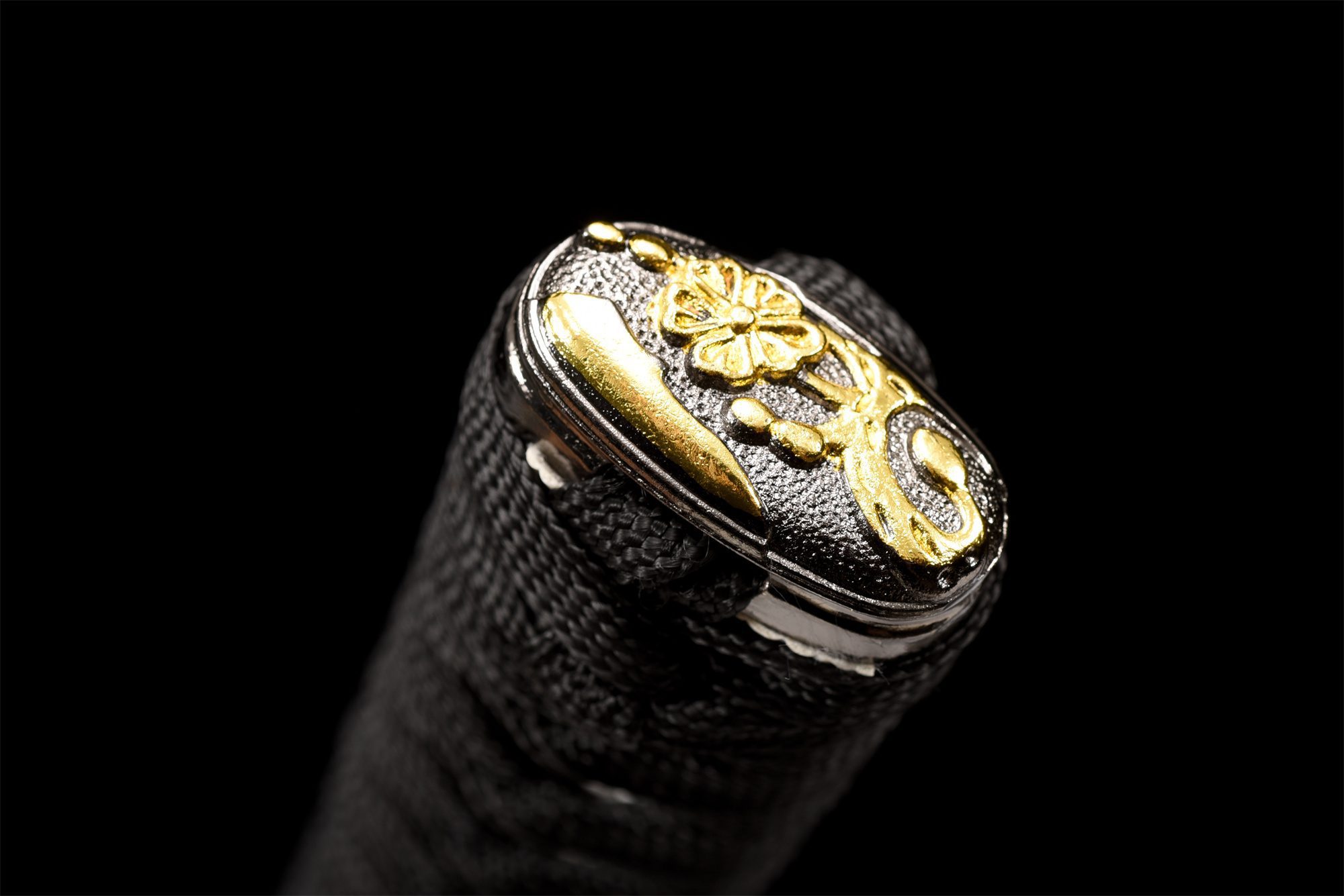 - Kashira (頭): Silber-Gold-Legierung mit floralen Gravuren.