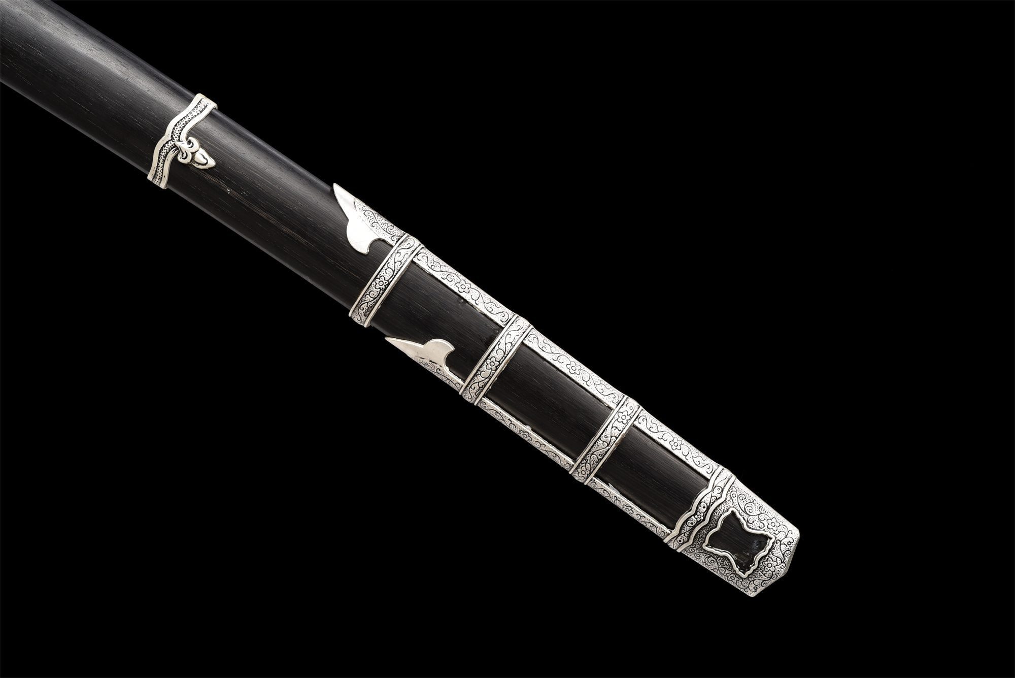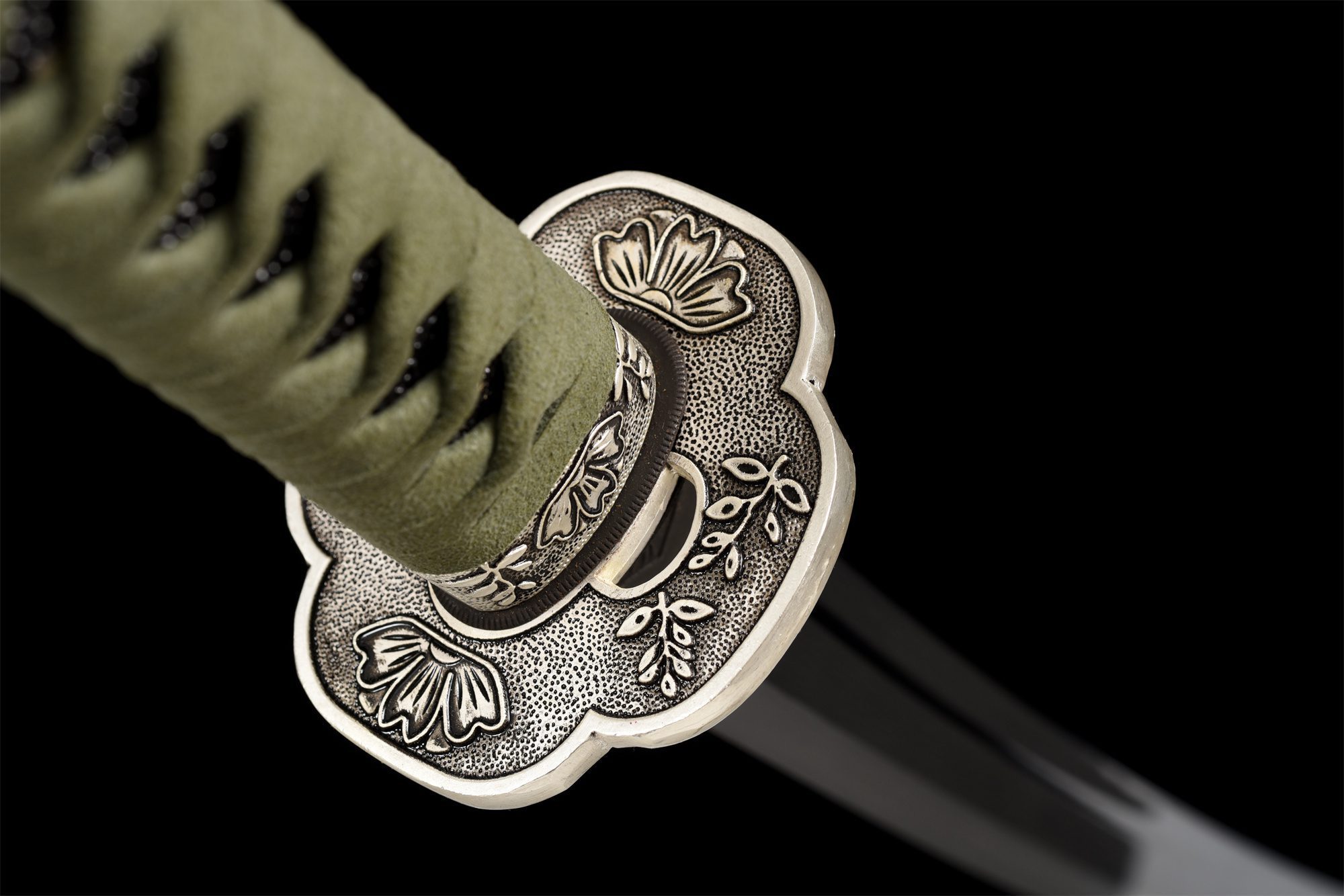 Die Klinge aus Manganstahl besticht durch ihre auffällige schwarze Oberfläche, die durch eine echte gerade Hamon-Linie verstärkt wird, die durch unterschiedliche Härtung erzielt wird und eine klare Grenze zwischen der gehärteten Schneide und dem flexibleren Rücken zieht. Die in das Metall geschnitzte Bo-Hi macht die Klinge leichter und erzeugt bei Bewegungen den berühmten „Gesang des Katana“. Die abgerundete, kreuzförmige Tsuba aus einer Silberlegierung ist mit zarten Blumen Gravuren versehen, die sich harmonisch auf Fuchi und Kashira wiederholen und eine bemerkenswerte dekorative Einheit bilden. Der Griff zeugt von sorgfältiger Handwerkskunst mit seiner schwarzen Basis aus künstlicher Stachelrochenhaut, die mit grünem Tsuka-Ito in Rautenmuster umwickelt ist, während die vergoldeten Menuki, die Drachen darstellen, einen Hauch von Noblesse verleihen. Die Schwertscheide aus Rosenholz mit ihren versilberten Enden, die mit Blumenmotiven graviert sind, die mit denen auf der Parierstange identisch sind, vervollständigt diese Harmonie und verfügt über einen grünen Ring, der zur Umwicklung passt.