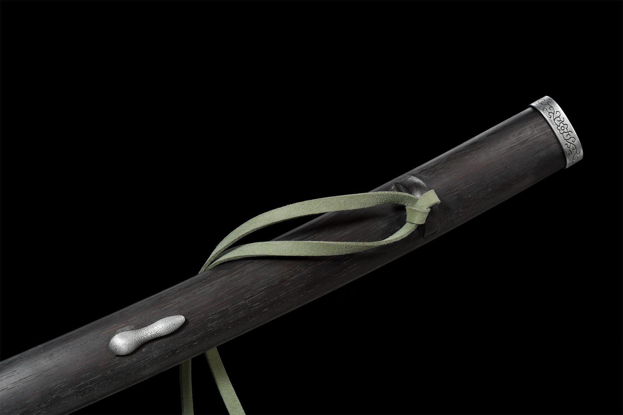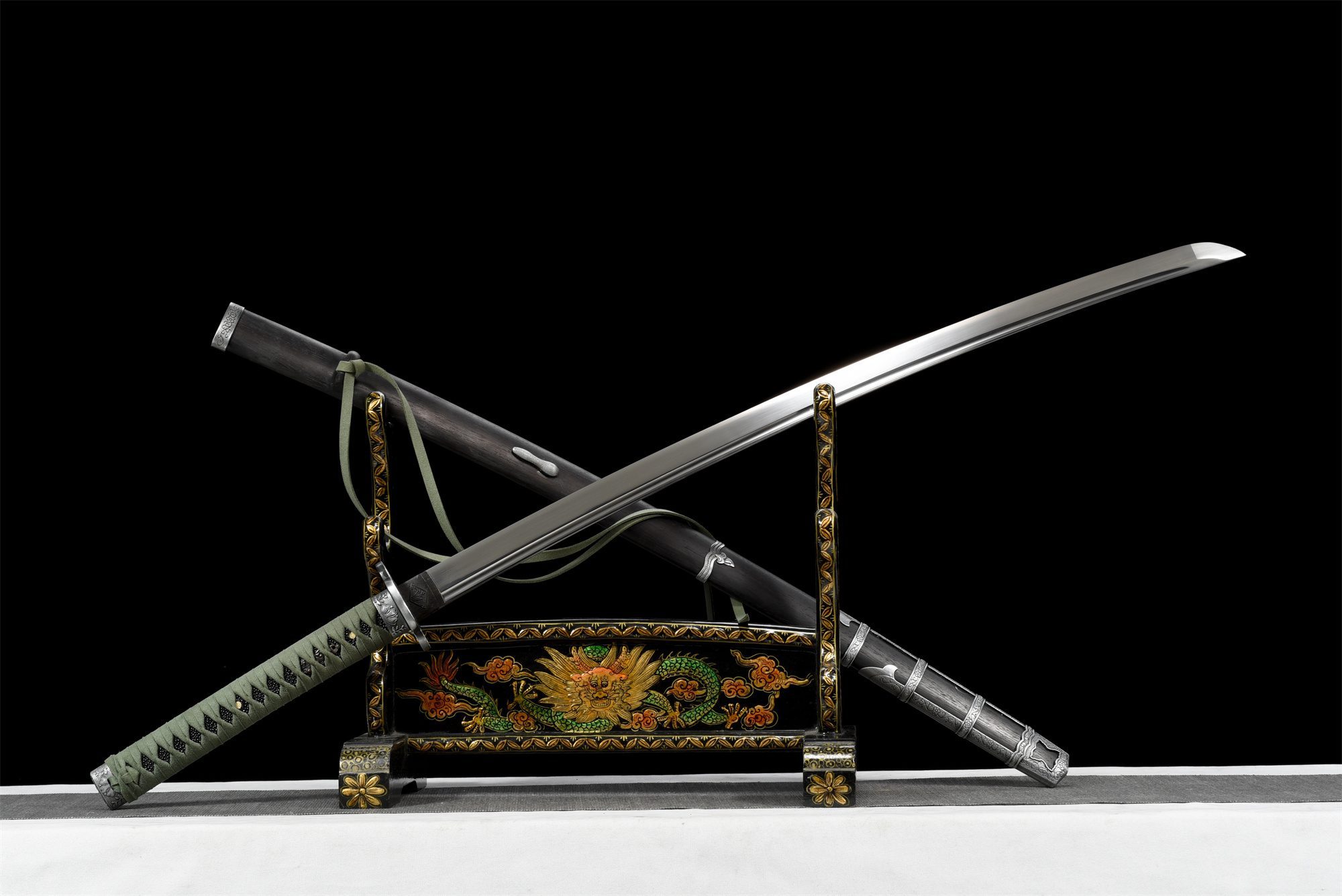 Die Klinge aus Manganstahl hat eine polierte Oberfläche, die die subtilen Nuancen des Metalls zum Vorschein bringt, während die Bo-Hi die Struktur auflockert und beim Bewegen einen charakteristischen Pfeifton erzeugt. Die abgerundete, kreuzförmige Tsuba aus einer Silberlegierung ist mit fein gravierten Blumenmotiven verziert, die einen Kontrast zum Kozuka-Hitsu bilden und die Handwerkskunst unterstreichen. Der Griff kombiniert die authentische Textur von schwarzem Stachelrochenleder mit edlem Holz und ist mit einem grünen Tsuka-ito umwickelt, der in einem Rautenmuster geflochten ist und einen festen Halt gewährleistet. Die Menuki stellen einen goldenen Drachen dar, ein Symbol für Macht und Schutz, während Fuchi und Kashira harmonisch die Blumenmotive der Parierstange widerspiegeln. Die mit Silberornamenten verzierte Schwertscheide aus Rosenholz endet mit einem Kojiri und einem Koiguchi, die mit Gravuren von Blumen verziert sind und ein stimmiges Ensemble von auffallender Schönheit bilden.