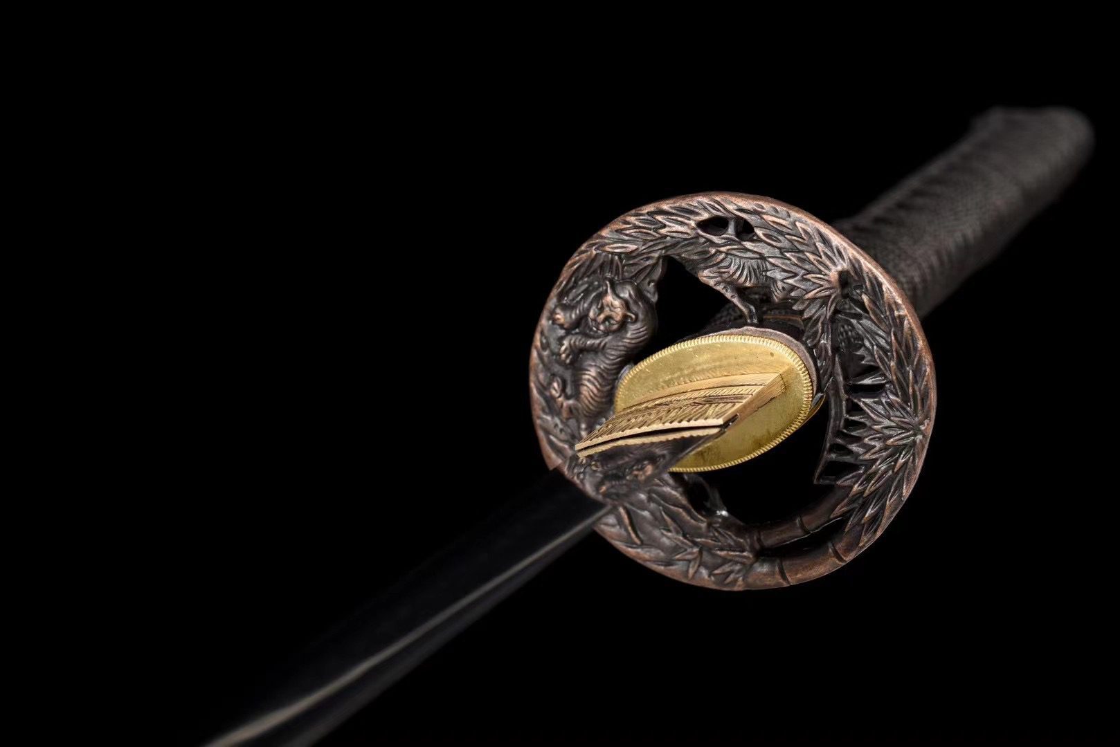 - Stichblatt (Tsuba 鍔): reich verzierte runde Stichblatt aus Kupfer mit Tigermotiven inmitten üppiger Vegetation.