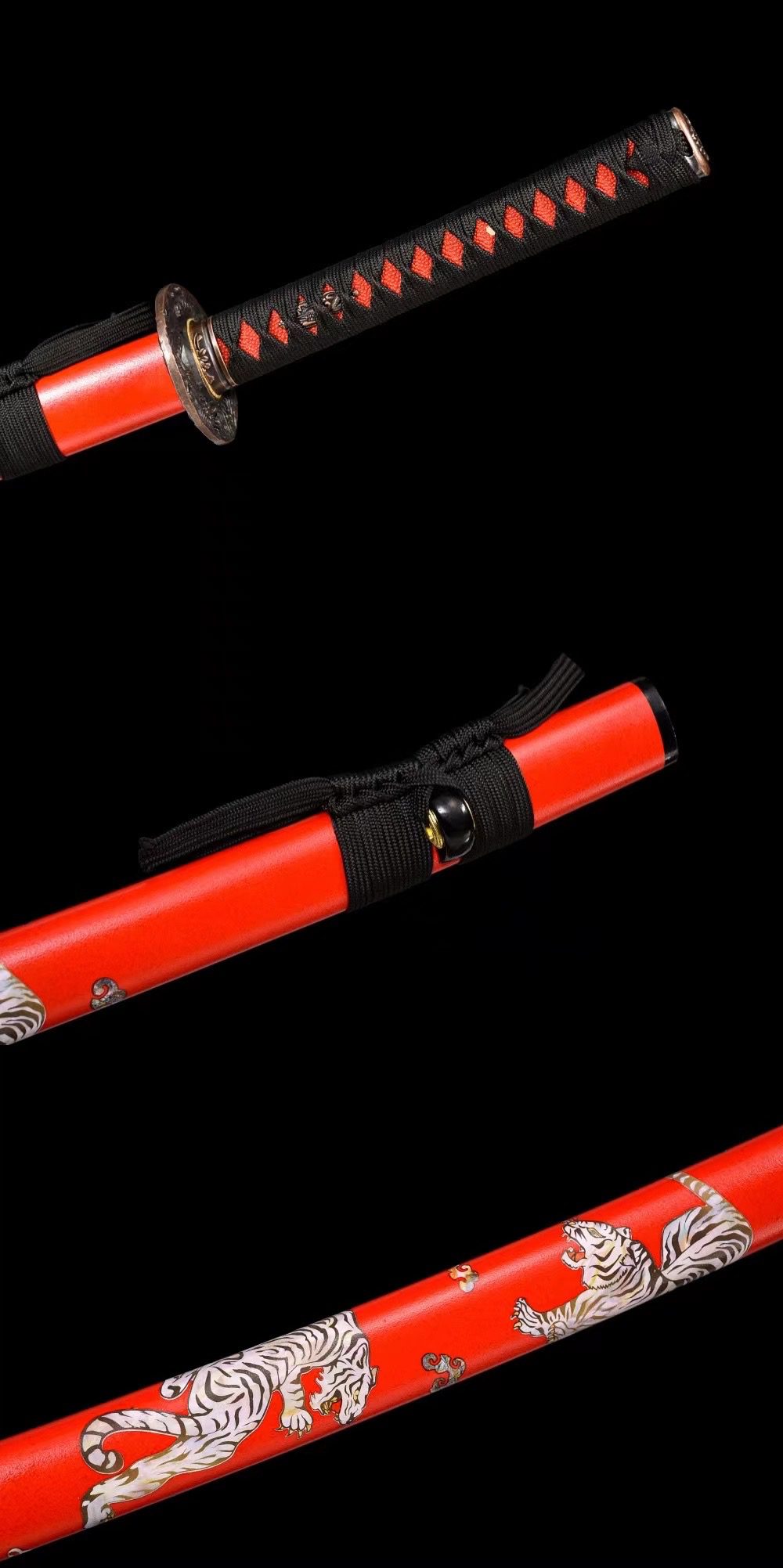 - Schwertscheide (Saya 鞘): rot lackiertes Holz mit aufgemalten weißen Tigern, schwarzem Kojiri und Koiguchi.