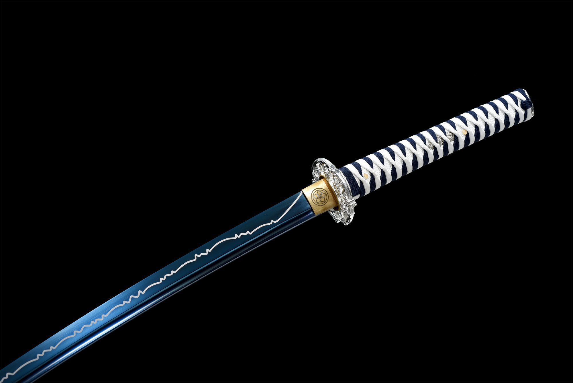 - Tsuka-ITO (柄糸): Weiß und blau geflochten über dem Griff.