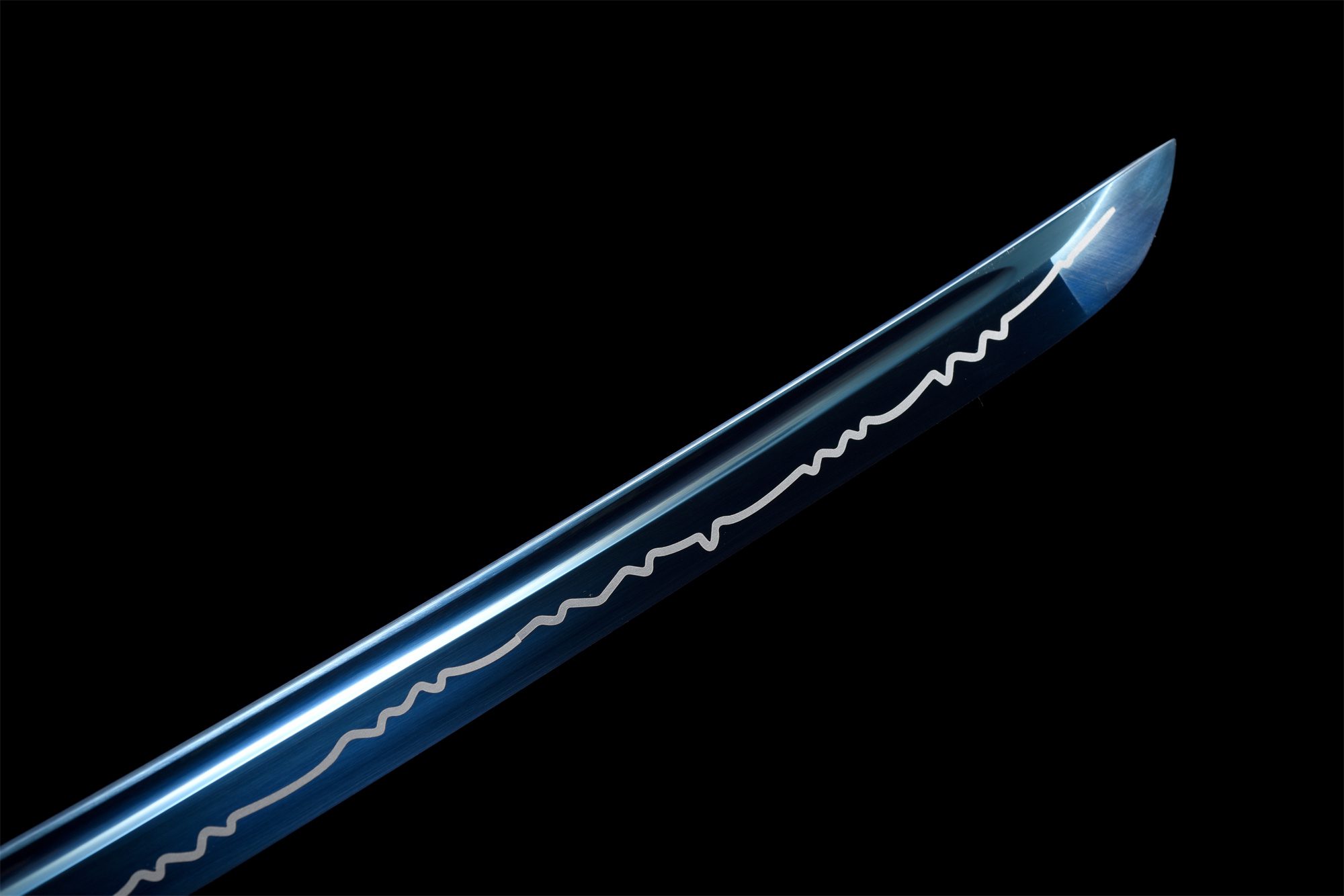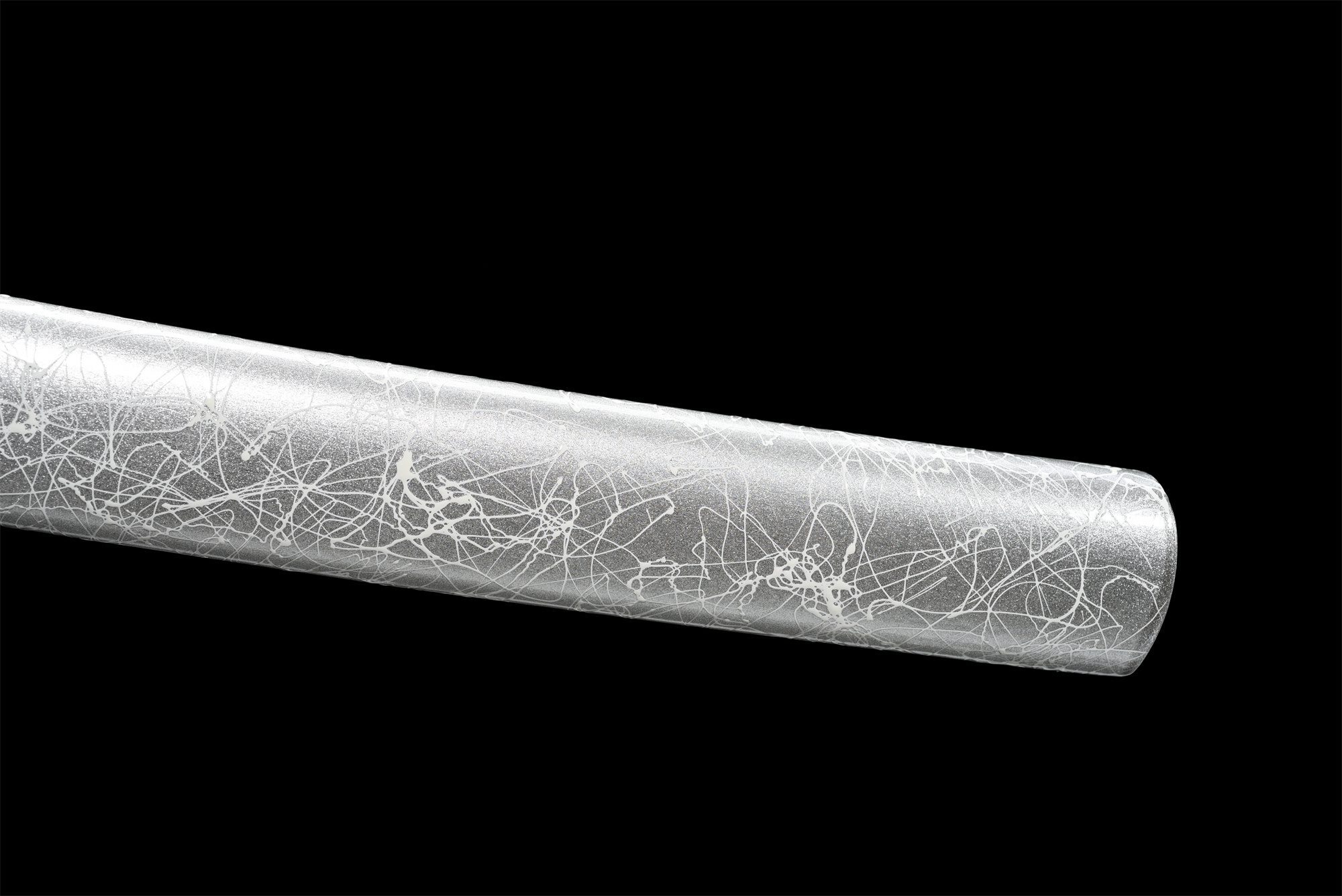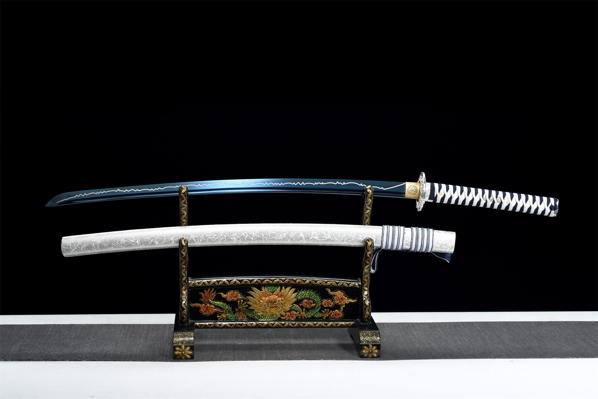 Die Klinge aus Manganstahl hat einen tiefblauen Farbton, der an einen stürmischen Himmel erinnert, während ihre polierte Oberfläche das Licht mit der Intensität eines morgendlichen Blitzes reflektiert. Der Handschutz (Tsuba) aus einer Silberlegierung ist mit zarten, geschnitzten Blumen verziert, die einen harmonischen Kontrast zur schlichten Gesamtgestaltung des Schwertes bilden und einen raffinierten Effekt aus Licht und Schatten erzeugen. Der Griff (Tsuka) kombiniert massives Holz, das mit weißer Stachelrochenimitation überzogen ist, mit weiß-blauen Flechtwerken (Tsuka-Ito), die sich elegant um ihn winden, während die Menuki, die einen silbernen Drachen darstellen, an die mythische Kraft von Stürmen erinnern. Die graue Schwertscheide (Saya) mit Blitzstreifen setzt diese himmlische Ästhetik fort und wird durch ein weiß-blaues Sageo ergänzt, das an Sturmwolken erinnert.