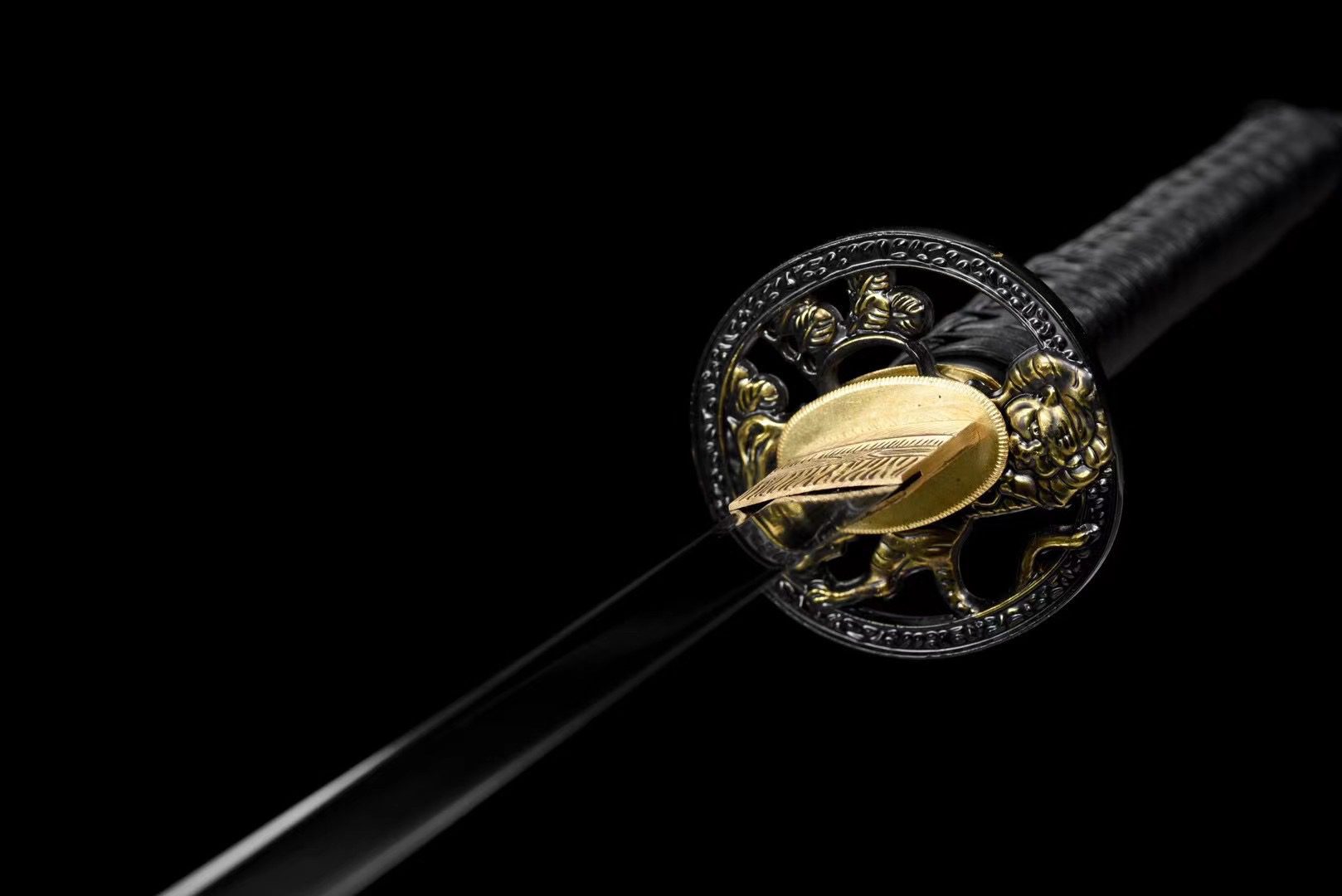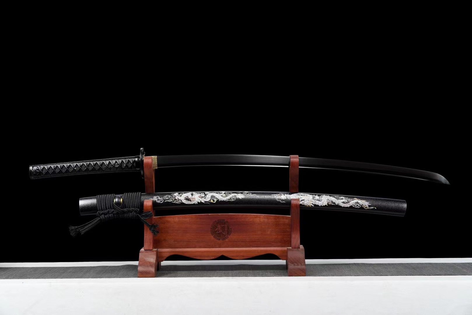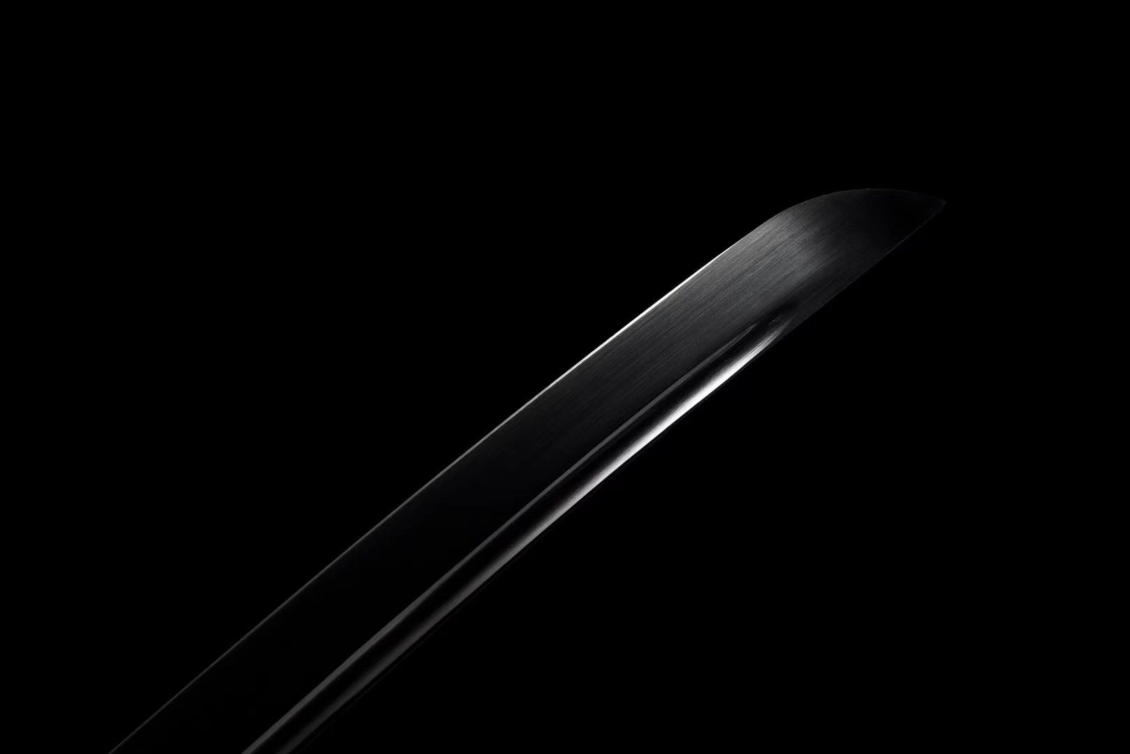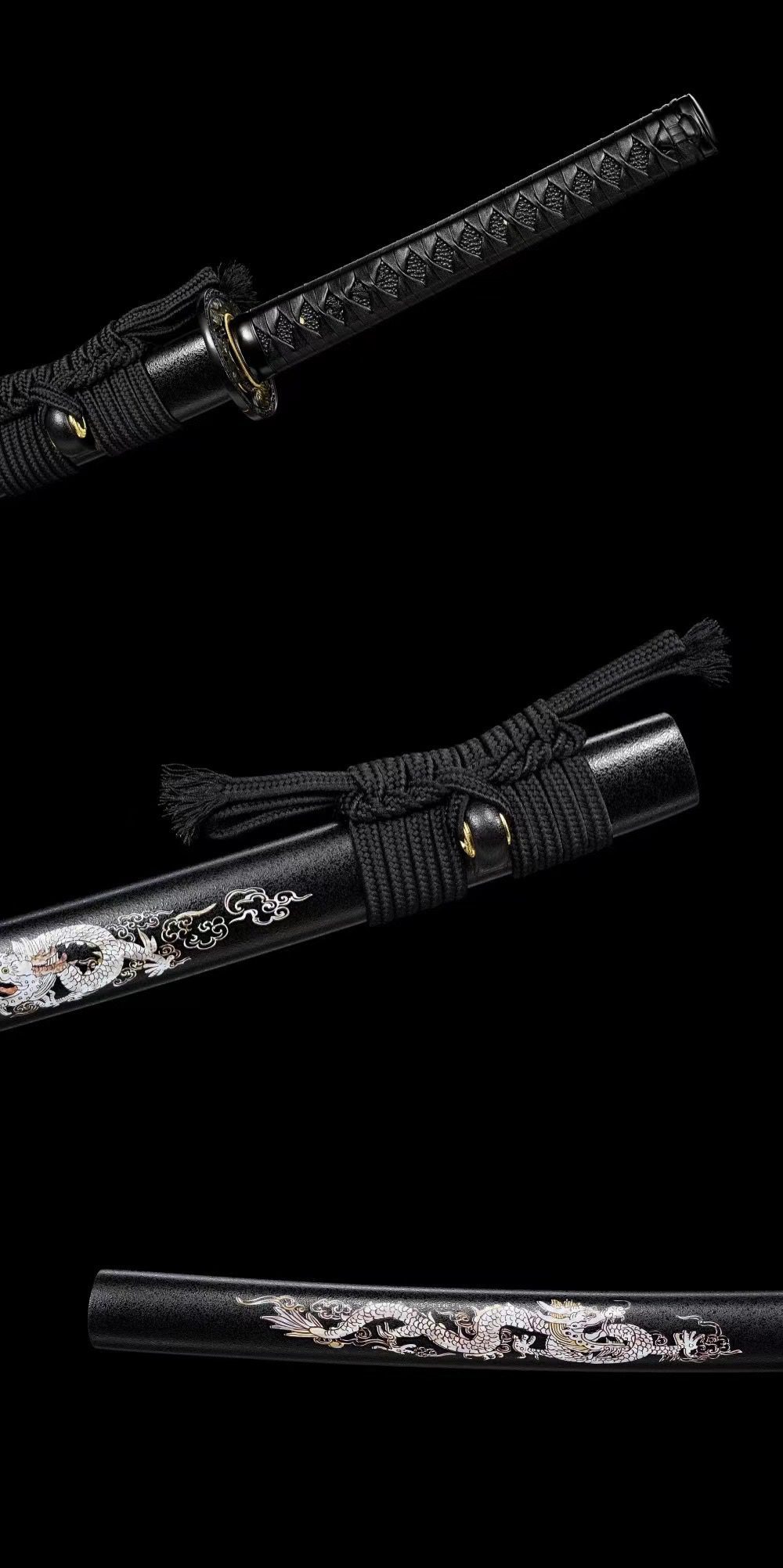 Seine Klinge aus T10-Stahl verfügt über eine mattschwarze Oberfläche, die einen schönen Kontrast zum Glanz des gebürsteten Messing-Habaki bildet. Die in den Stahl geschnitzte Bo-Hi macht die Klinge leichter und erzeugt beim Schneiden den charakteristischen pfeifenden Klang, während die runde schwarze Tsuba aus einer Legierung die geschwungenen Konturen eines um sich selbst gewundenen Drachen offenbart. Der Griff kombiniert die raue Textur von schwarzem Kunstrochenleder mit schwarzem Tsuka-ito-Geflecht in Rautenmuster und sorgt so für einen festen und eleganten Halt. Die Menuki stellen schwarze Drachen dar, die die Hand des Trägers zu bewachen scheinen, während die glatten Fuchi und Kashira aus schwarzer Legierung eine raffinierte Nüchternheit verleihen. Die körnige, schwarz lackierte Holzscheide ist mit einem weißen Drachen verziert, der sich über ihre gesamte Länge schlängelt und einen auffälligen Kontrast zum schwarzen Sageo bildet.