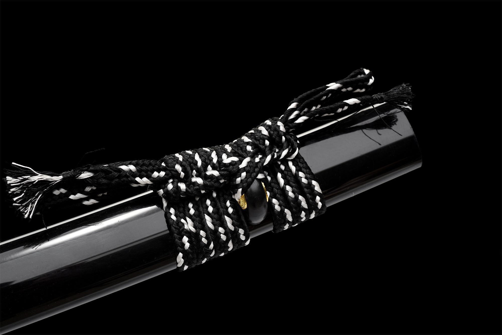 - Schwertscheide (Saya 鞘): Aus Massivholz mit schwarzer Lackierung.