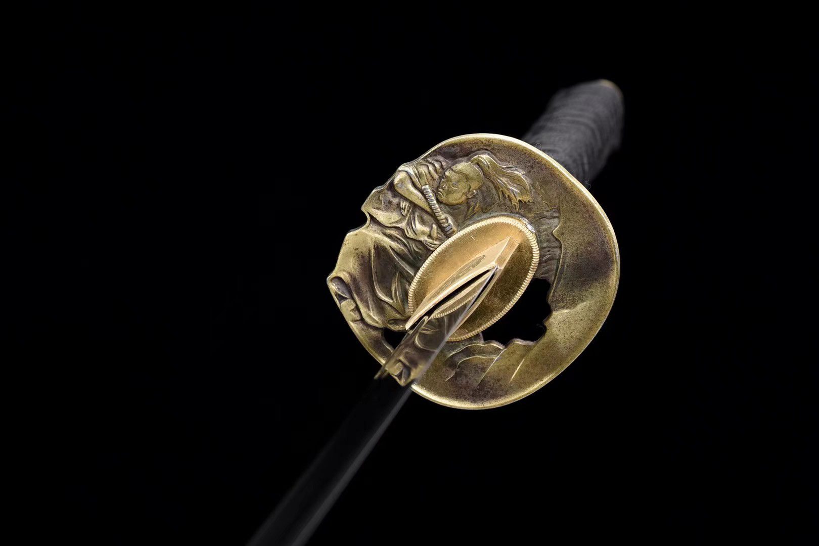 - Stichblatt (Tsuba 鍔): Prächtige, geschnitzte Messing-Stichblatt, das auf der einen Seite einen Samurai und auf der anderen Seite einen Totenkopf darstellt.
