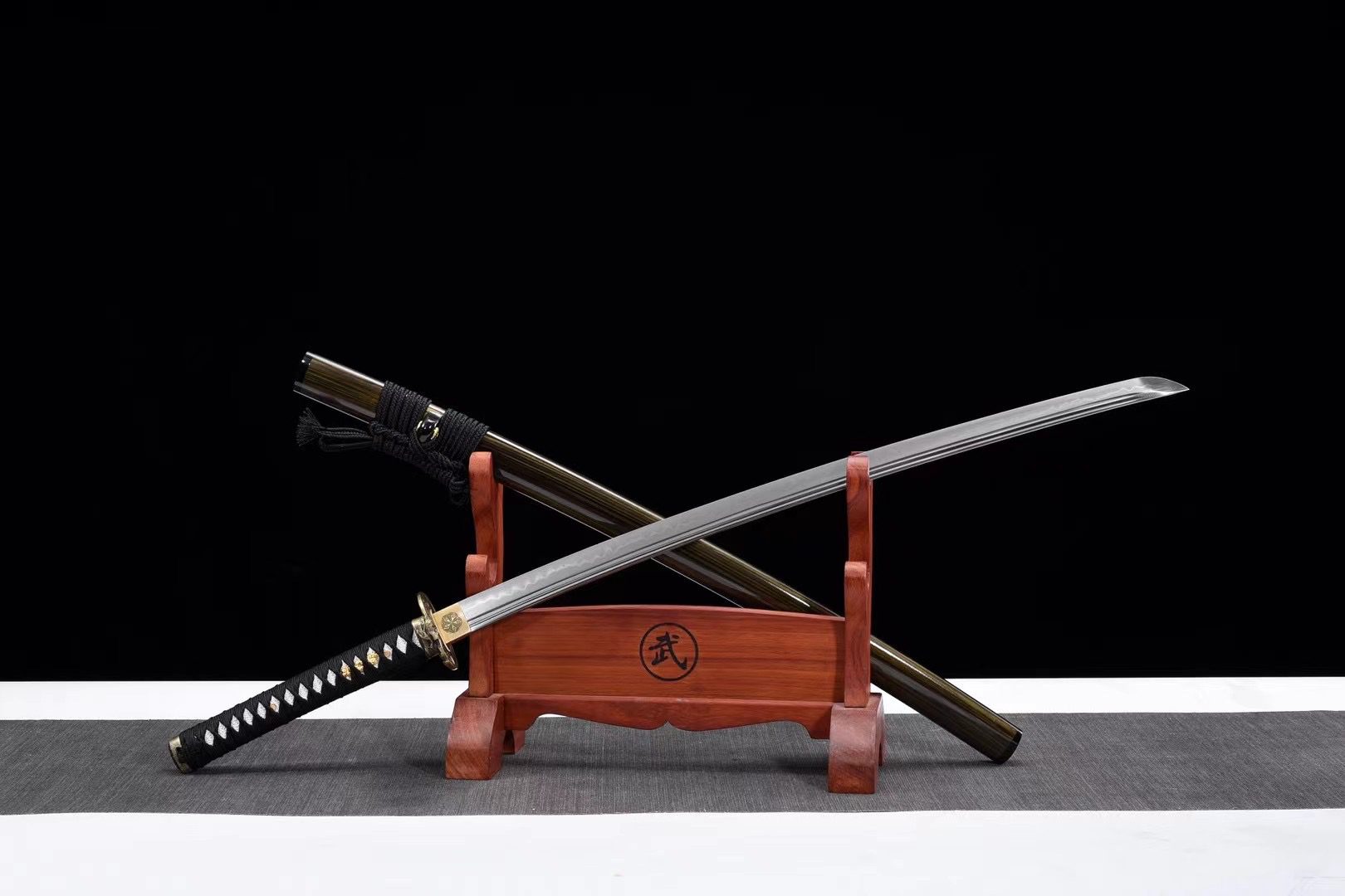 - Schwertscheide (Saya 鞘): transparentes lackiertes Holz, das die natürliche Maserung erkennen lässt, mit schwarzem Kojiri und Koiguchi.