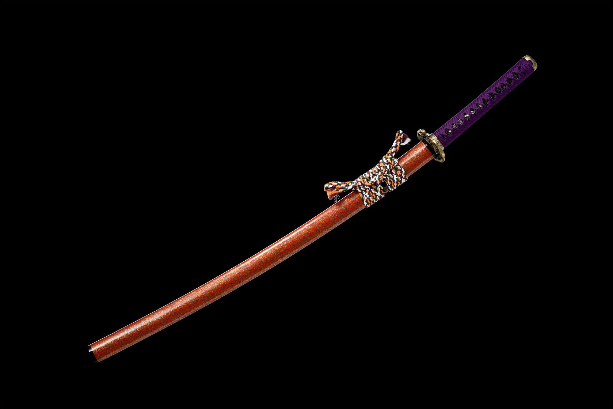 Die Klinge aus T10-Stahl weist ein authentisches Midare-Hamon mit tanzenden Flammenmustern auf, das durch unterschiedliche Härtung entsteht und dem Stahl seine außergewöhnlichen Schneideigenschaften und Widerstandsfähigkeit verleiht. Die abgerundete Messing-Tsuba ist mit einem fein ziselierten Drachen verziert, einem Symbol für östliche Kraft und Weisheit, während die passenden Fuchi und Kashira Gravuren aufweisen, die an Wellen und Wind erinnern, natürliche Elemente, die für ständige Bewegung und unsichtbare Kraft stehen. Der Griff kombiniert authentische Stachelrochenhaut (Samegawa) und Massivholz, umwickelt mit violettem Geflecht (Tsuka-Ito), das einen eleganten Kontrast zu den goldenen Menuki mit Drachenmotiven bildet. Die orangefarbene Schwertscheide mit gelben und blauen körnigen Akzenten schafft ein kräftiges Farbschema, ergänzt durch ein mehrfarbiges orangefarbenes, grünes, violettes und weißes Sageo, das dem Ensemble einen Hauch von Raffinesse verleiht.