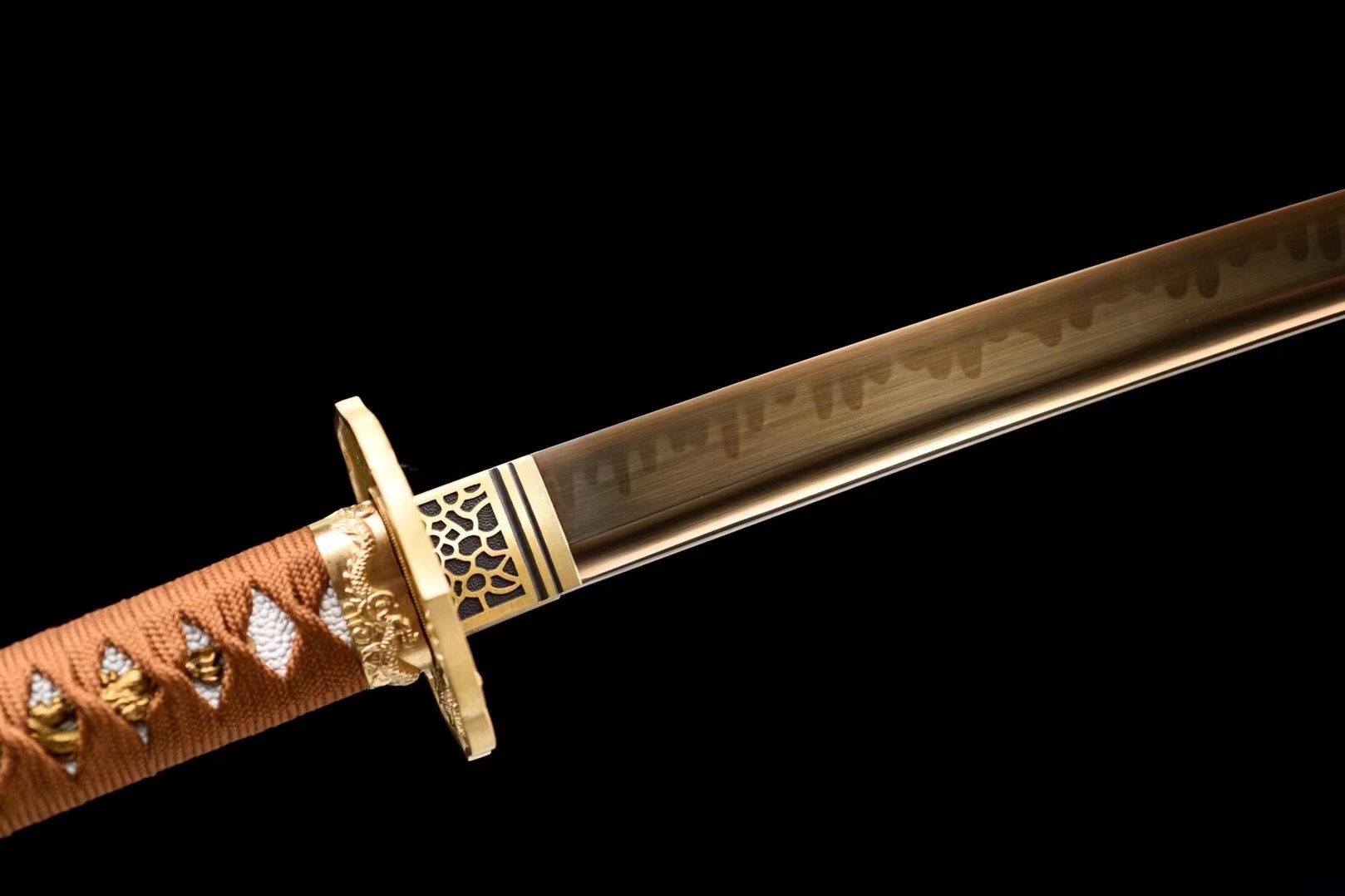 Die T10-Stahlklinge des Kōkiba-Katana-Schwertes zeichnet sich durch einen außergewöhnlichen Kupferton aus, der das Licht mit hypnotischer Intensität einfängt und reflektiert. Das echte Hamon, das durch unterschiedliche Härtung erzielt wird, bildet eine wellenförmige Linie, die Bereiche unterschiedlicher Härte voneinander trennt und einen auffälligen visuellen Kontrast auf dieser goldenen Oberfläche erzeugt. Das Bo-Hi hohlmeißelt elegant die Rückseite der Klinge, wodurch ihre Struktur leichter wird und sie beim Bewegen ihr charakteristisches Pfeifgeräusch erzeugt. Der goldene Handschutz (Tsuba) ist mit einem Drachen verziert, einem Motiv, das sich harmonisch auf dem Fuchi wiederholt, während der Kashira den Griff mit einem majestätischen Drachenkopf krönt. Der Griff offenbart die authentische Textur von weißer Stachelrochenhaut (Samegawa) unter brauner, rautenförmiger Flechtung, unterbrochen von goldenen Menuki, die Drachen darstellen. Die Schwertscheide überrascht mit ihrer transparenten Oberfläche, die die natürliche Schönheit des rohen Holzes offenbart, eingerahmt von kontrastierenden schwarzen Enden und einem zweifarbigen schwarzen und kupferfarbenen Sageo.