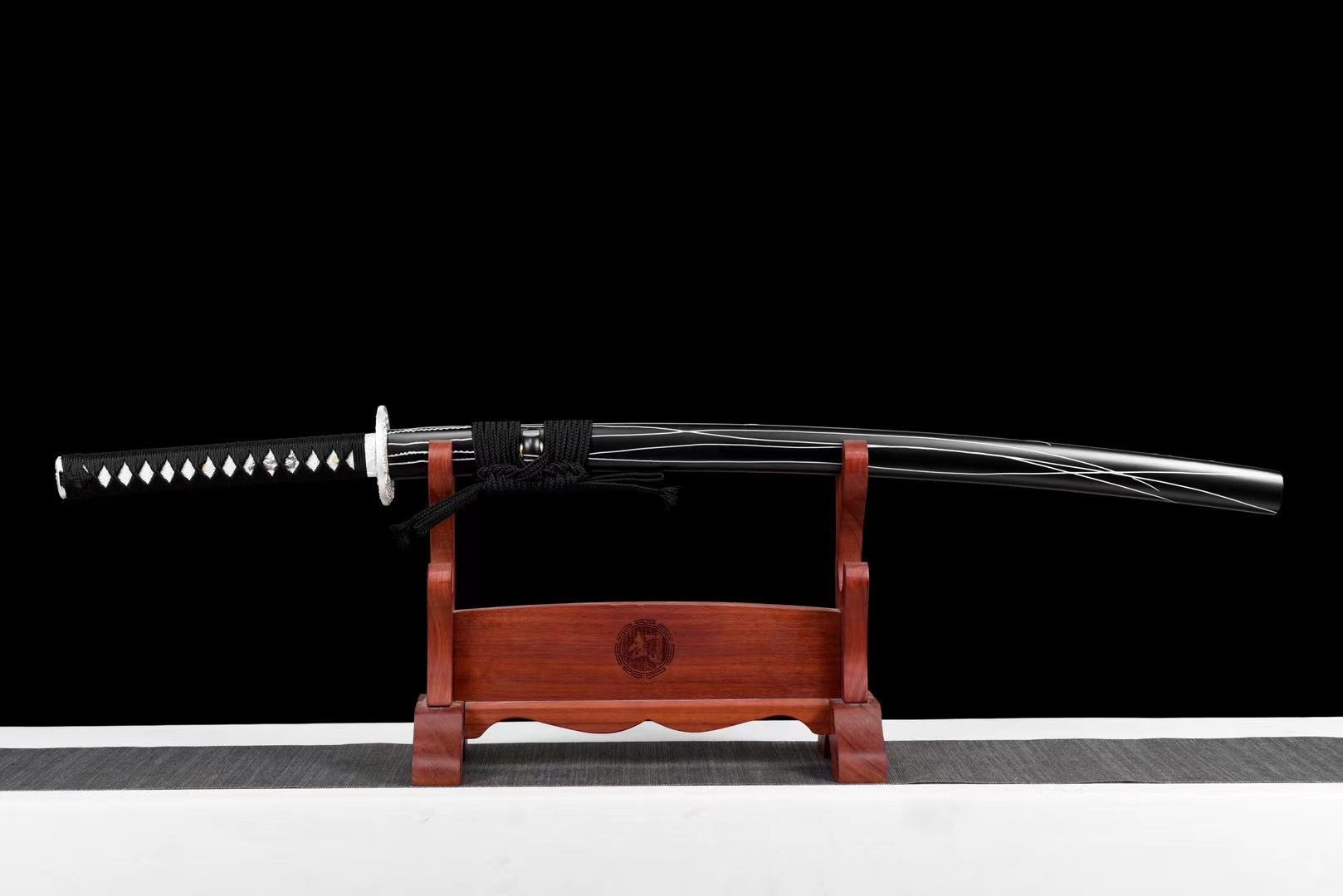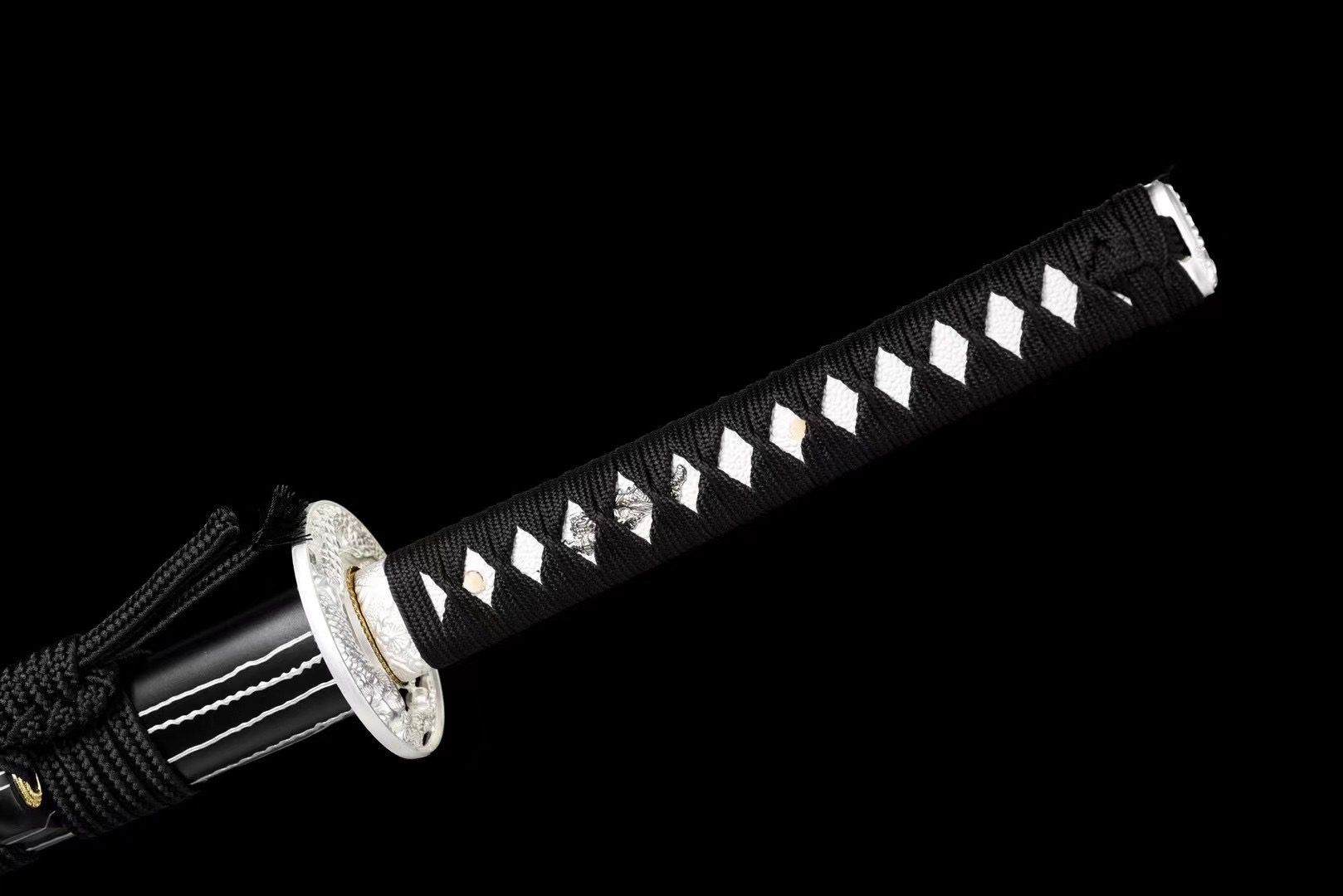 - Schwertscheide (Saya 鞘): schwarz lackiertes Holz mit langen weißen Streifen.