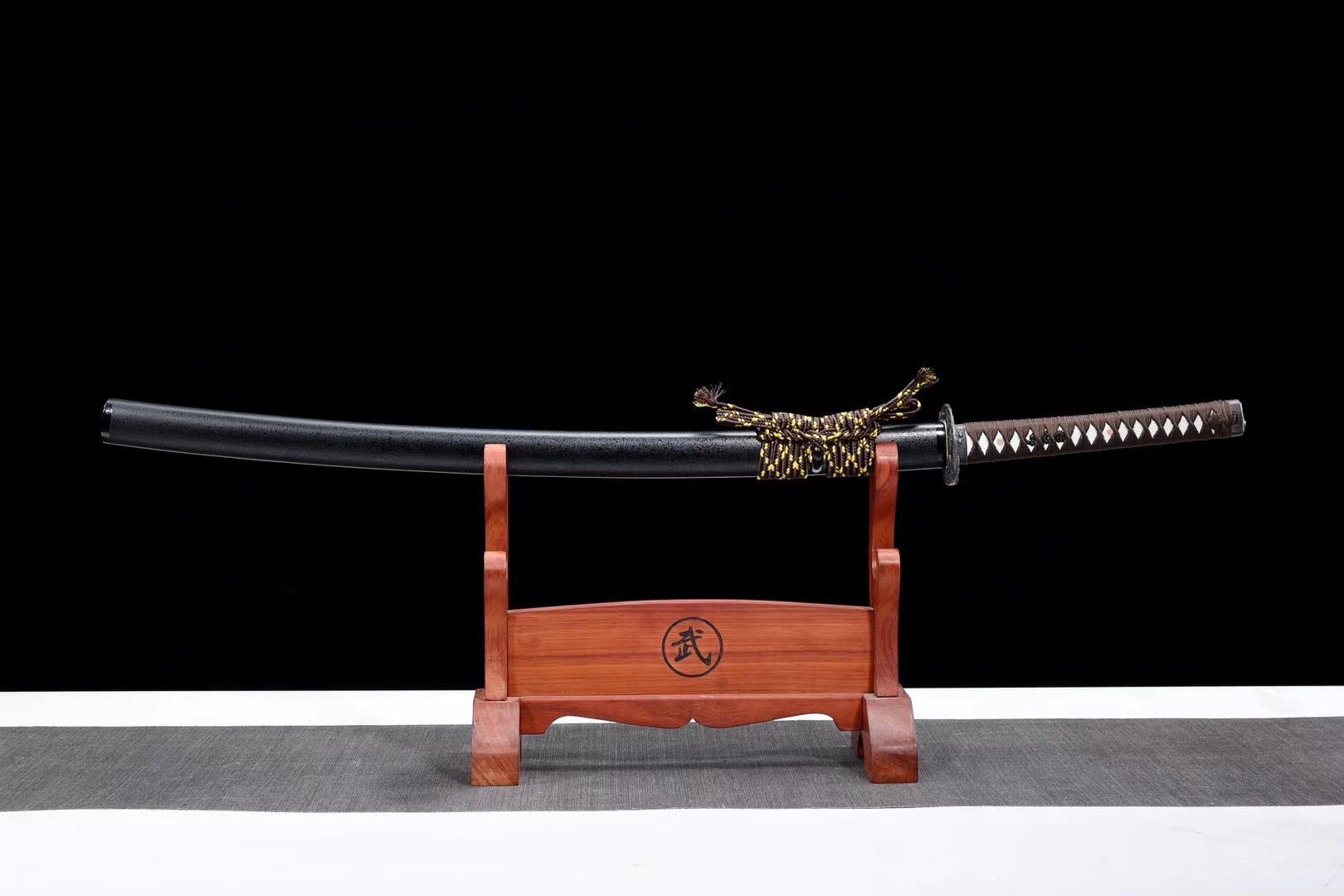 - Schwertscheide (Saya 鞘): schwarze, körnige, lackierte Holzscheide mit schwarzem Kojiri und Koiguchi.