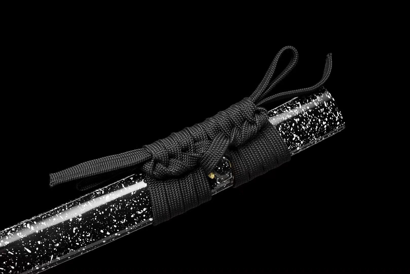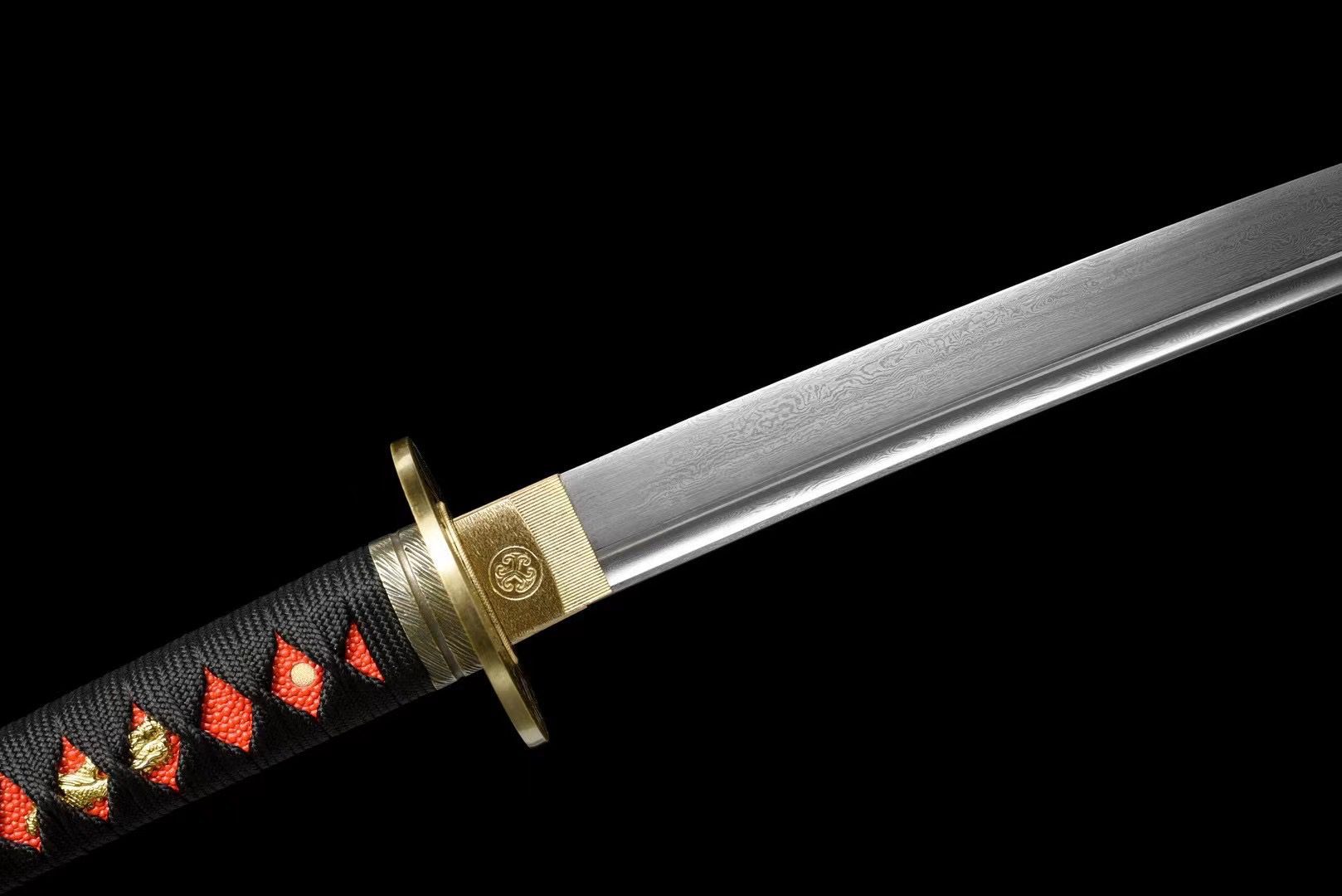 Seine Damaszenerstahlklinge zeigt wellenförmige Muster, die an die Schuppen des mythischen Drachen erinnern, während die Bo-Hi die Struktur aufhellt und beim Bewegen einen charakteristischen Pfeifton erzeugt. Die runde Tsuba aus vergoldetem Messing ist mit einer detaillierten Gravur eines Drachenkopfes verziert, dem ewigen Wächter der Klinge. Der Griff kombiniert rote Stachelrochenhaut mit schwarzem, diamantförmigem Geflecht (Tsuka-Ito) und schafft so einen auffälligen Kontrast, der einen festen und bequemen Griff gewährleistet. Die goldenen Menuki stellen Miniaturdrachen dar, während das gebürstete Kupfer Fuchi und Kashira für ein edles Finish sorgen. Die schwarz-rot lackierte Holzscheide (Saya), verziert mit weißen Zebrastreifen, erinnert an die tanzenden Flammen um den Drachen und wird durch ein dezentes schwarzes Sageo ergänzt.