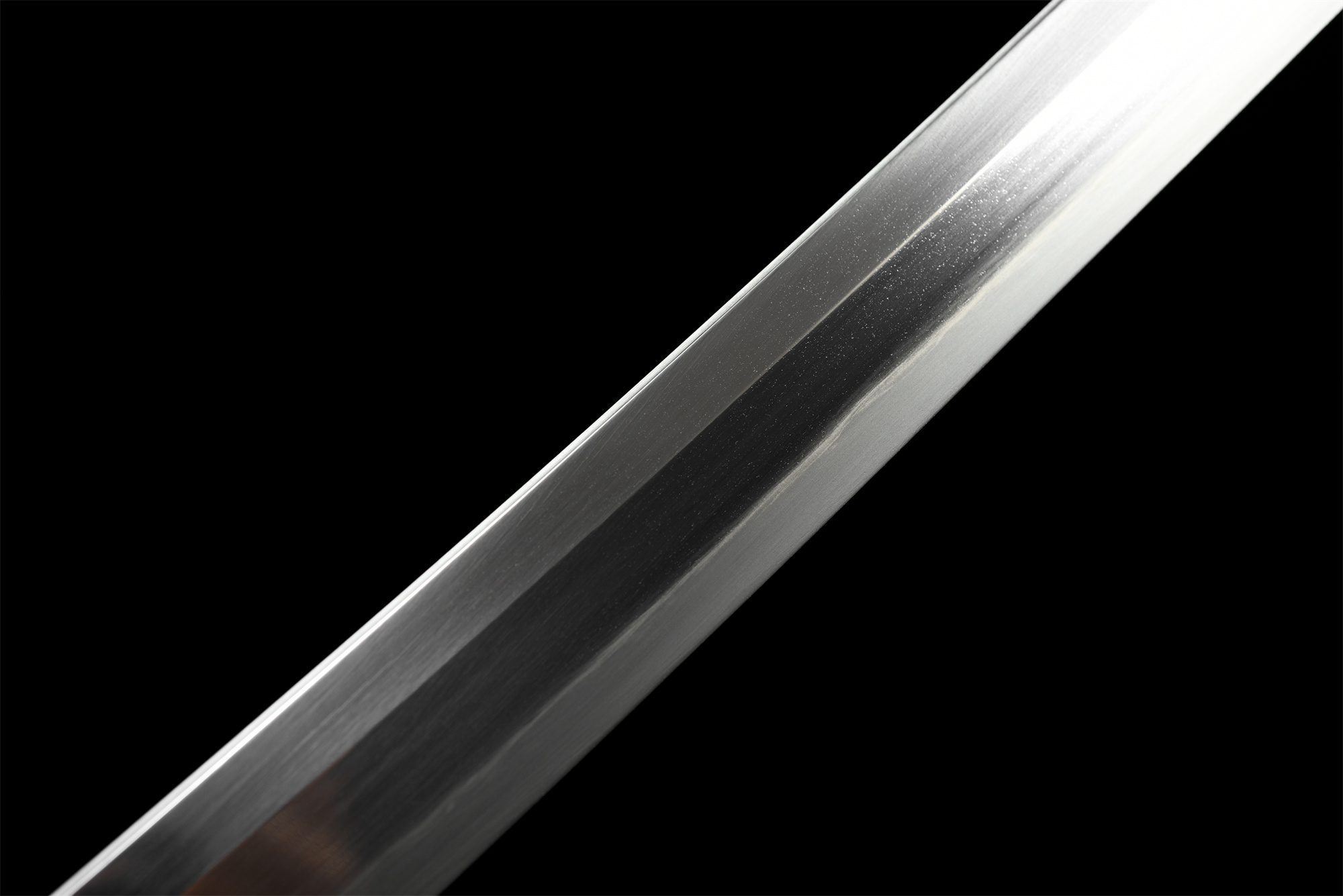 Die Klinge aus T10-Stahl zeigt ein authentisches Suguba Hamon, eine gerade Härtungslinie, die von traditioneller japanischer Handwerkskunst zeugt. Darüber hinaus weist die abgerundete Messing-Tsuba ein Spitzenmuster auf, das an Meereswellen erinnert und einen poetischen Kontrast zur terrestrischen Symbolik der Katze bildet. Der Griff kombiniert authentische Stachelrochenhaut mit schwarzem, rautenförmigem Geflecht, während die goldenen Menuki Drachen darstellen, die die mystische Ikonografie vervollständigen. Schließlich ist die schwarz lackierte Schwertscheide mit einem goldenen Katzenmotiv verziert, und der echte Horn-Koiguchi verleiht ihr einen Hauch von traditioneller Authentizität.