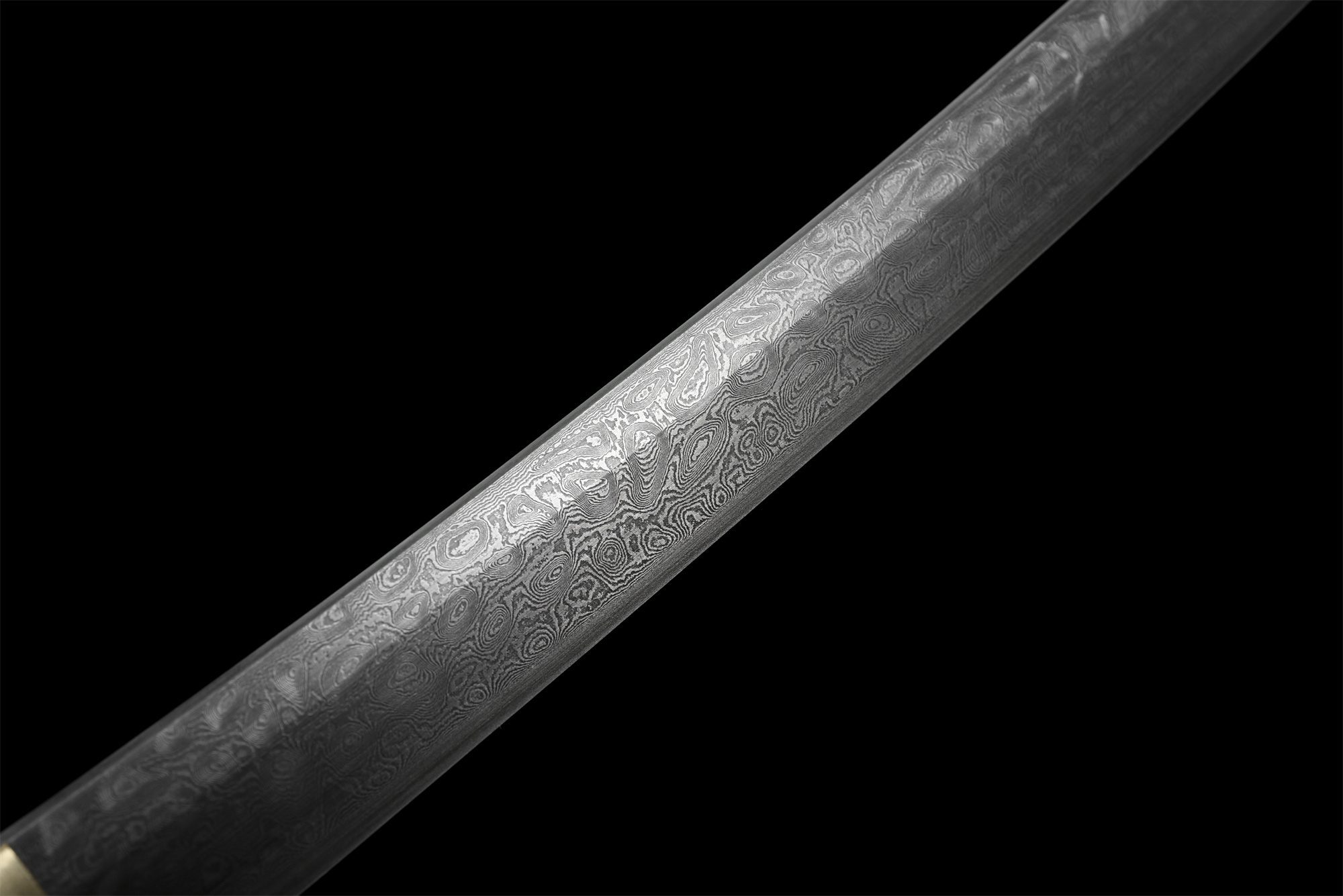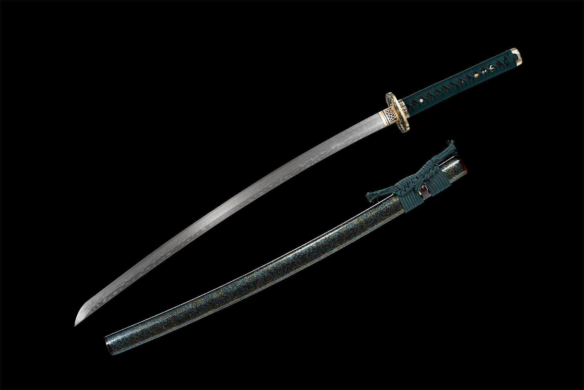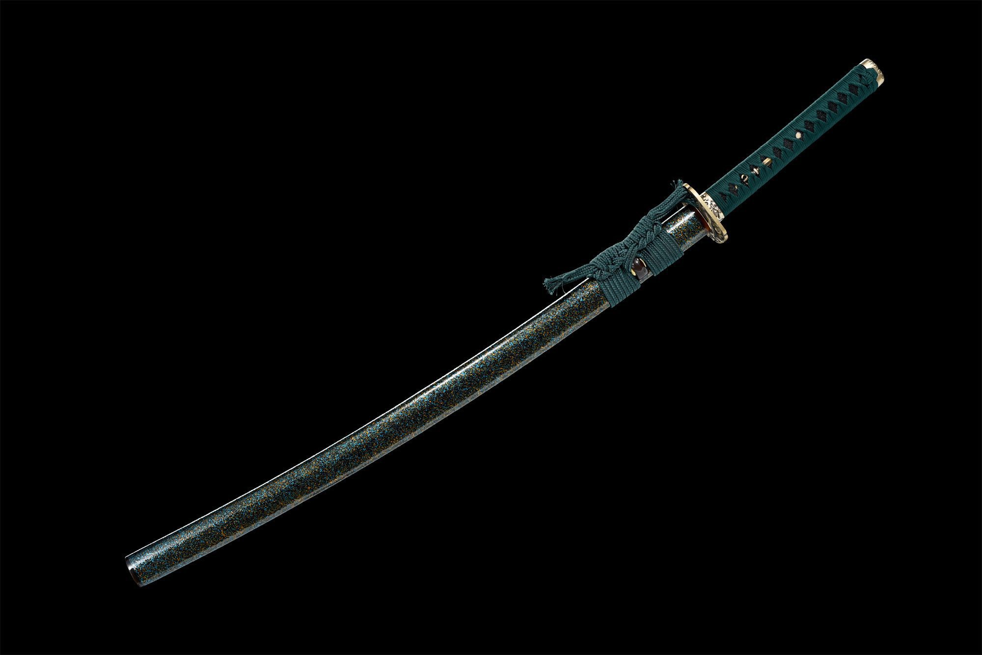 Die Klinge aus Damaszenerstahl zeigt wellenförmige Muster, die ganz natürlich an Wasserströmungen erinnern, während die natürliche Stahloberfläche das Licht einfängt und reflektiert wie die Oberfläche eines ruhigen Sees. Die rechteckige, vergoldete Kupfer-Tsuba zeigt eine beeindruckende Szene: einen Riesen, der aus den Wellen auftaucht, umgeben von stilisierten Wellen, die von japanischer Handwerkskunst zeugen. Der Griff (Tsuka) kombiniert auf harmonische Weise authentische Stachelrochenhaut mit Massivholz, überzogen mit grüner Flechtung (Tsuka-Ito) in einem Rautenmuster, das an die Schuppen eines Seedrachen erinnert. Die Menuki stellen goldene Dreizacke dar, Symbole der Macht über die Wasserelemente. Die schwarz lackierte Holzscheide (saya) ist mit sandgestrahlter Farbe in Schwarz-, Orange- und Blautönen verziert, die einen Farbverlauf erzeugen, der an einen Sonnenuntergang über dem Meer erinnert, während das echte Horn-koiguchi einen Hauch von traditioneller Authentizität verleiht.