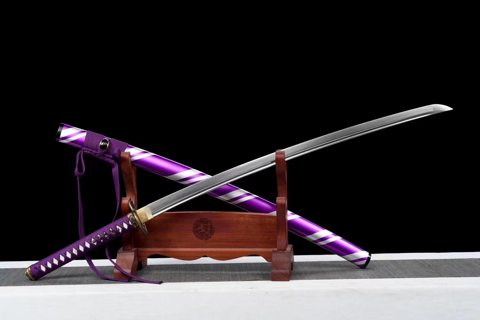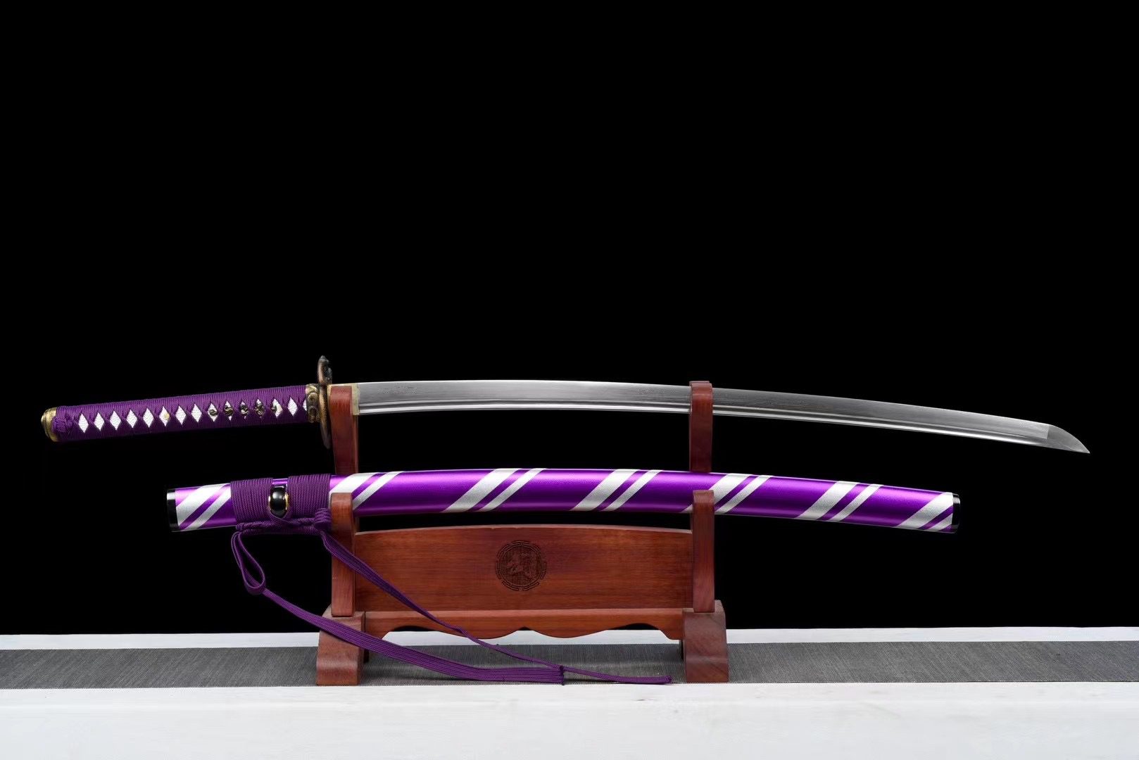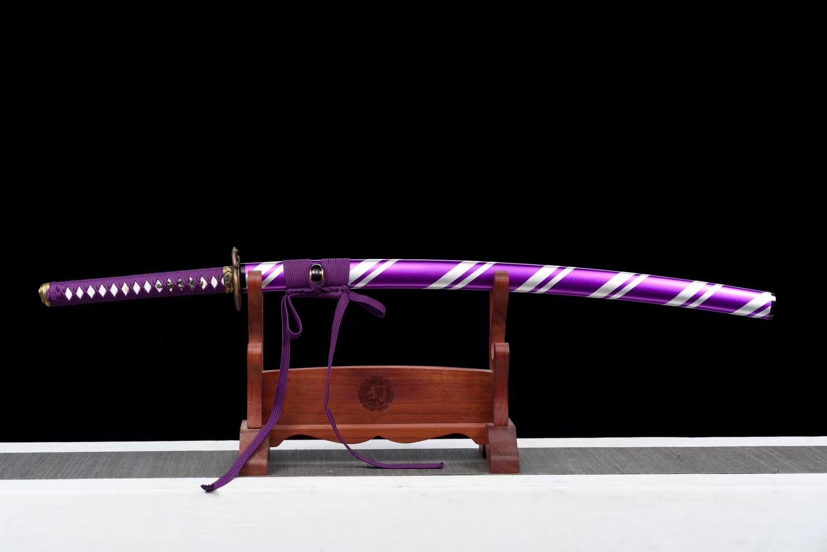 - Schwertscheide (Saya 鞘): lackiertes Holz mit abwechselnden weißen und violetten Linien, mit schwarzem Kojiri und Koiguchi.