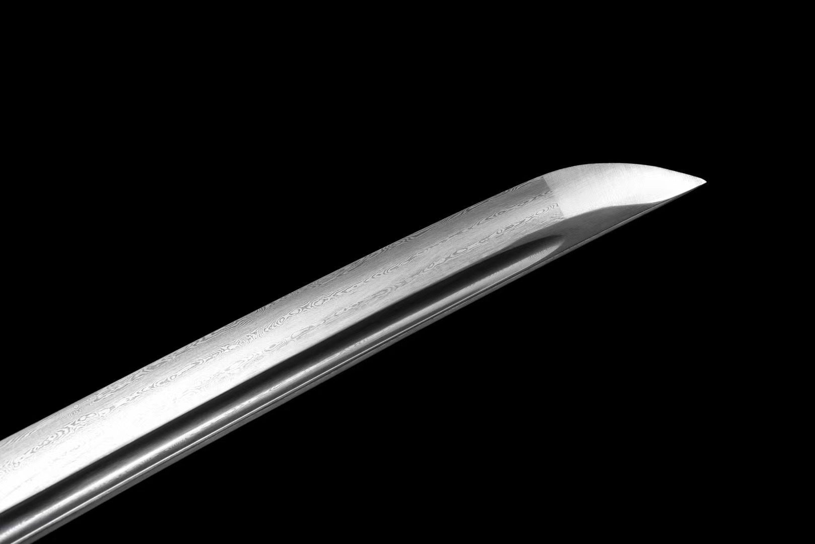Die Damaszener-Stahlklinge zeigt wellenförmige Muster, die an Schuppen einer Schlange erinnern, während die Bo-Hi den Gesamteindruck auflockert und beim Schwingen des Schwertes einen charakteristischen Pfeifton erzeugt. Die kupferfarbene Tsuba zeigt eine gewundene Schlange, ein Motiv, das sich auf der Fuchi und der Kashira wiederholt. Der Griff kombiniert die raue Textur von weißem Samegawa mit violettem, rautenförmigem Geflecht und bietet einen festen und eleganten Halt. Die Menuki stellen einen schwarzen Drachen dar. Die lackierte Schwertscheide wechselt subtil zwischen weißen und violetten Linien, die einen Kontrast zu den schwarzen Enden bilden, während das violette Sageo das Ensemble vervollständigt.