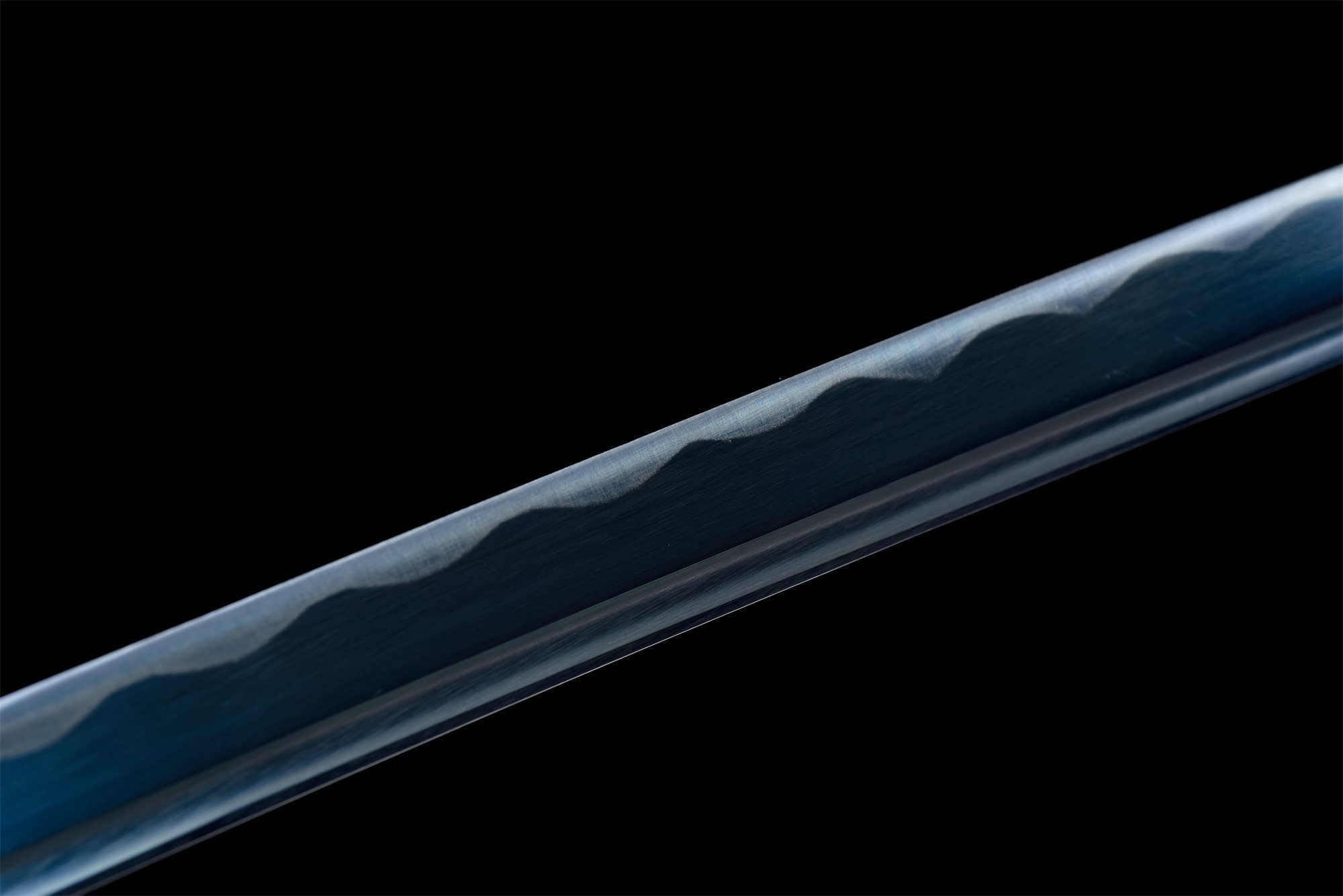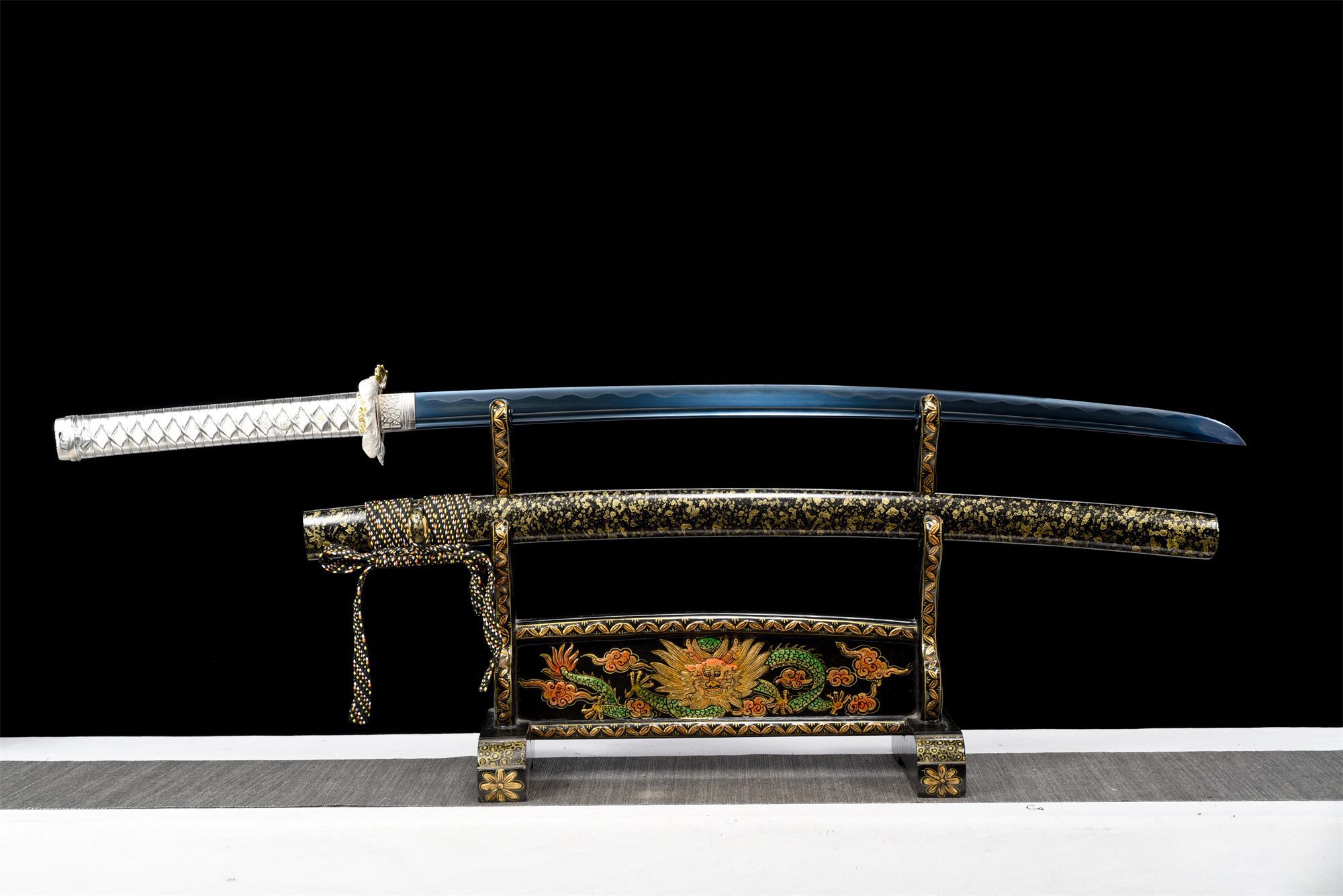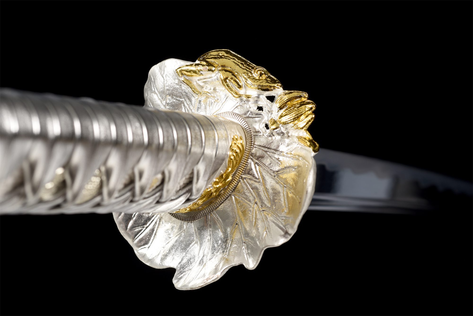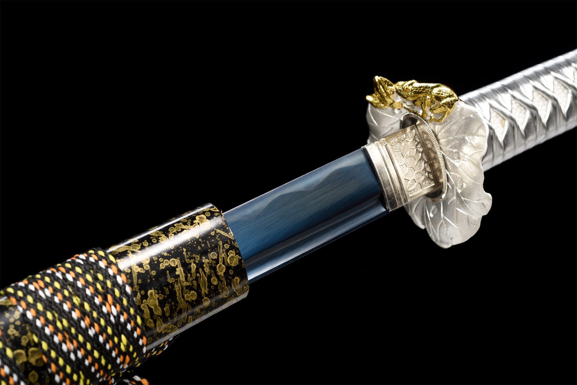 Die Klinge aus 1060er Stahl hat einen charakteristischen blauen Farbton, der das Licht wie die Oberfläche eines ruhigen Teiches einfängt, während das echte Hamon Notare dank traditioneller Differentialhärtung subtile Wellen entlang der Schneide erzeugt. Das Bo-Hi macht die Klinge leichter und erzeugt bei Bewegungen einen charakteristischen pfeifenden Klang. Der Tsuba-Schutz hat die Form eines Silberblatts mit einer goldenen Kröte darin, einem Symbol für Wohlstand und Verwandlung in der japanischen Kultur. Der Tsuka-Griff kombiniert weiße Stachelrochenhaut mit silbernem Kunstledergeflecht in einem Rautenmuster und sorgt so für einen festen und eleganten Halt. Die Fuchi- und Kashira-Verzierungen aus Silberlegierung sind mit goldenen Blumen verziert, die an Kirschblüten erinnern, während die schwarz lackierte Saya-Schwertscheide mit goldenen Wassertropfen verziert ist, die wie Sterne funkeln.