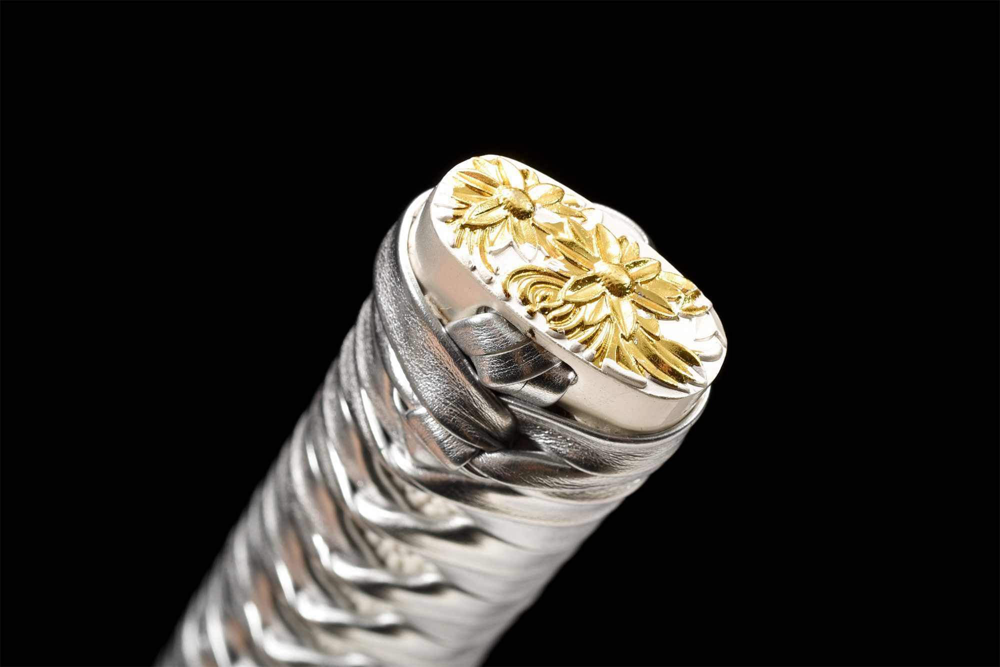 - Kashira (頭): Silberlegierung, verziert mit goldenen Blumen.