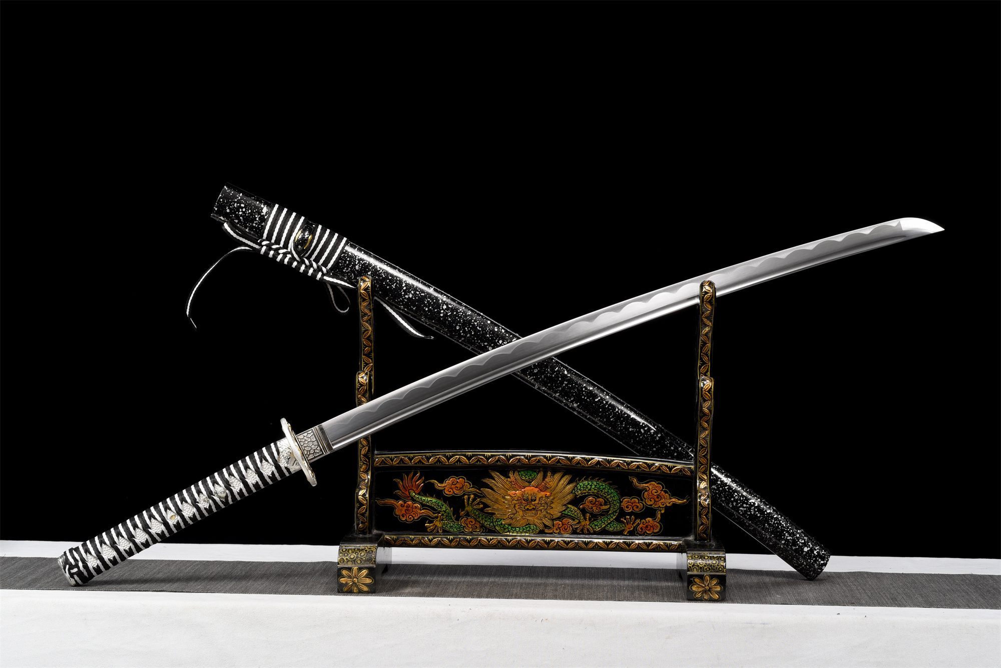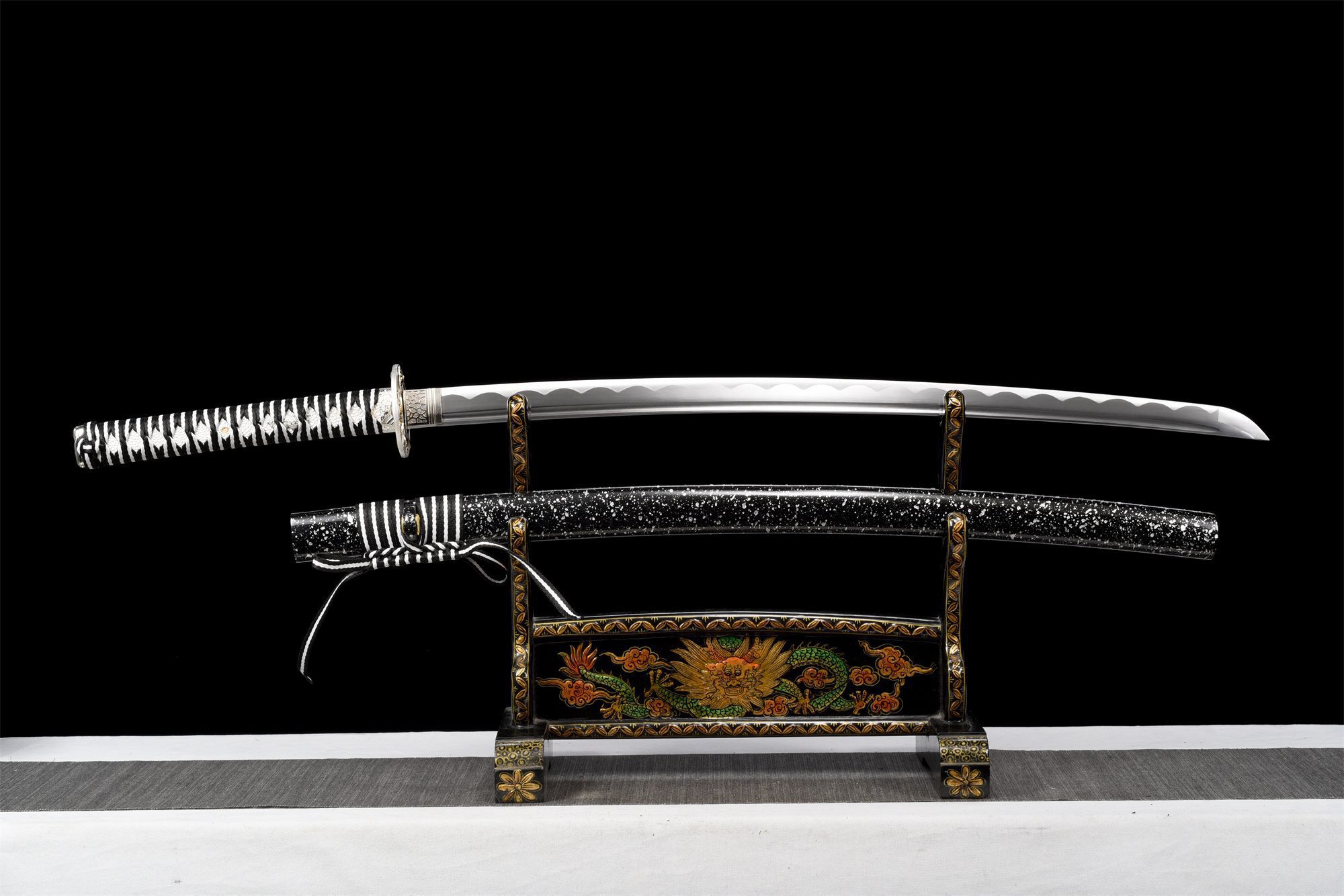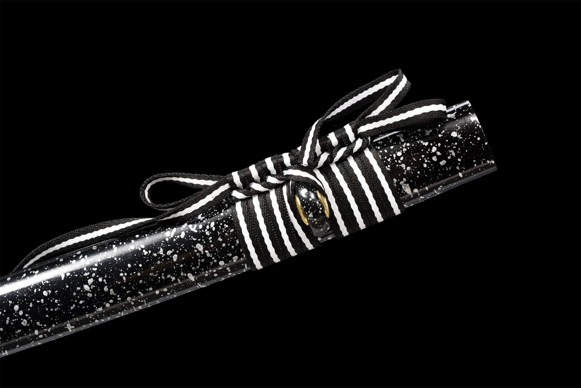 - Schwertscheide (Saya 鞘): Schwarz lackiertes Holz mit silbernen Wassertropfen.