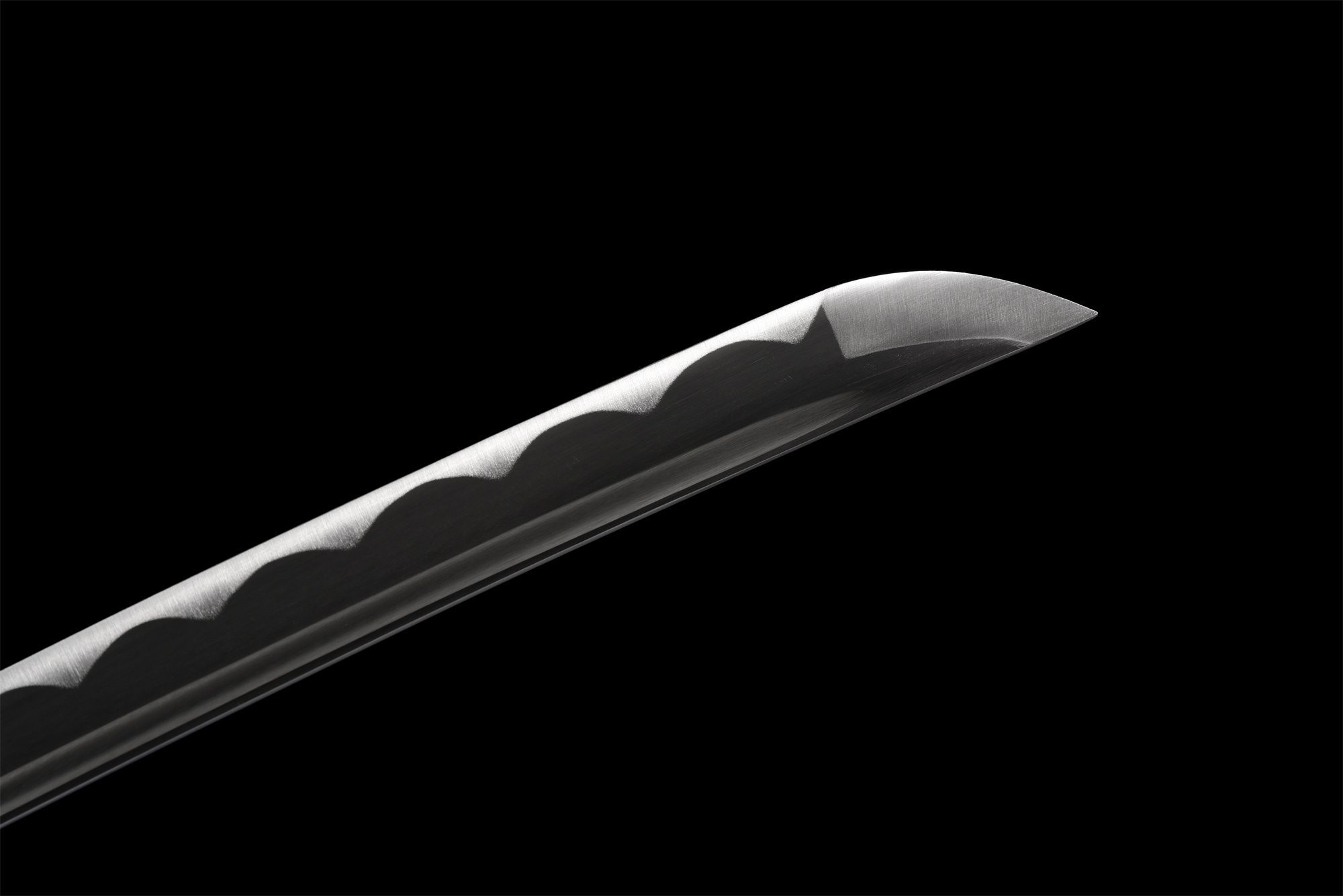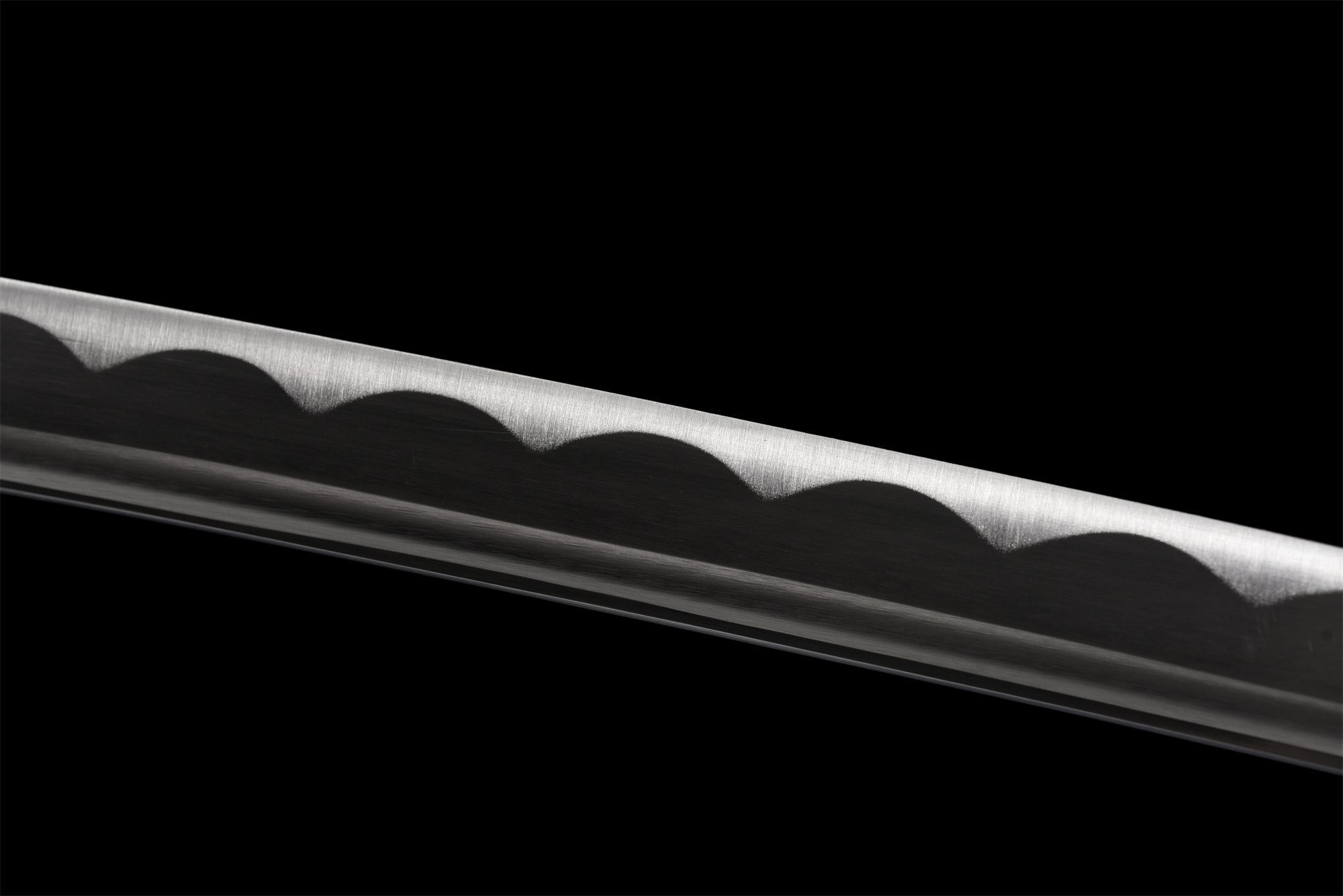 Seine Klinge aus 1060er Stahl verfügt über eine tiefschwarze Oberfläche, die an mondlose Nächte erinnert, in denen Piraten die Meere befuhren, während das durch unterschiedliche Härtung erzielte echte Notare Hamon silberne Wellen entlang der Schneide erzeugt. Die Bo-Hi hohliert die Klinge aus, um das Gewicht zu verringern, und erzeugt gleichzeitig einen charakteristischen Pfeifton, wenn sie bewegt wird. Die abgerundete silberne Tsuba ist mit goldenen Totenköpfen verziert, einem ikonischen Symbol der Piraterie, eingerahmt von silbernen Fuchi und Kashira mit raffinierten Blumenmotiven. Der Griff kombiniert traditionelles weißes Kunstrochenleder mit schwarz-weißem Tsuka-Ito-Geflecht im Rautenmuster, wodurch ein auffälliger Kontrast entsteht, der durch silberne Menuki noch verstärkt wird. Die schwarz lackierte Holzscheide ist mit silbernen Wassertropfen verziert, die an Gischt erinnern, und wird durch ein schwarz-weißes Sageo ergänzt.