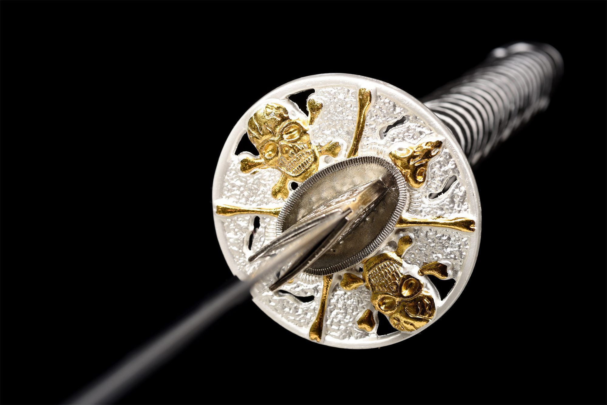 - Stichblatt (Tsuba 鍔): Abgerundet und silbern mit goldenen Totenköpfen.
