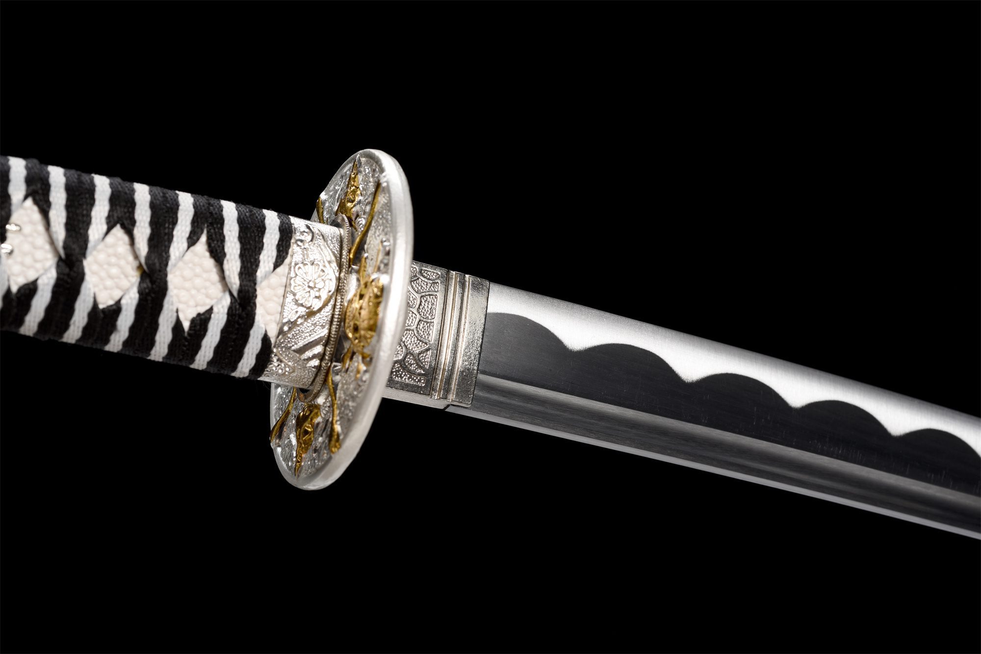 - Tsuka-ITO (柄糸): Schwarz-weiß geflochten über dem Griff in einem Rautenmuster.