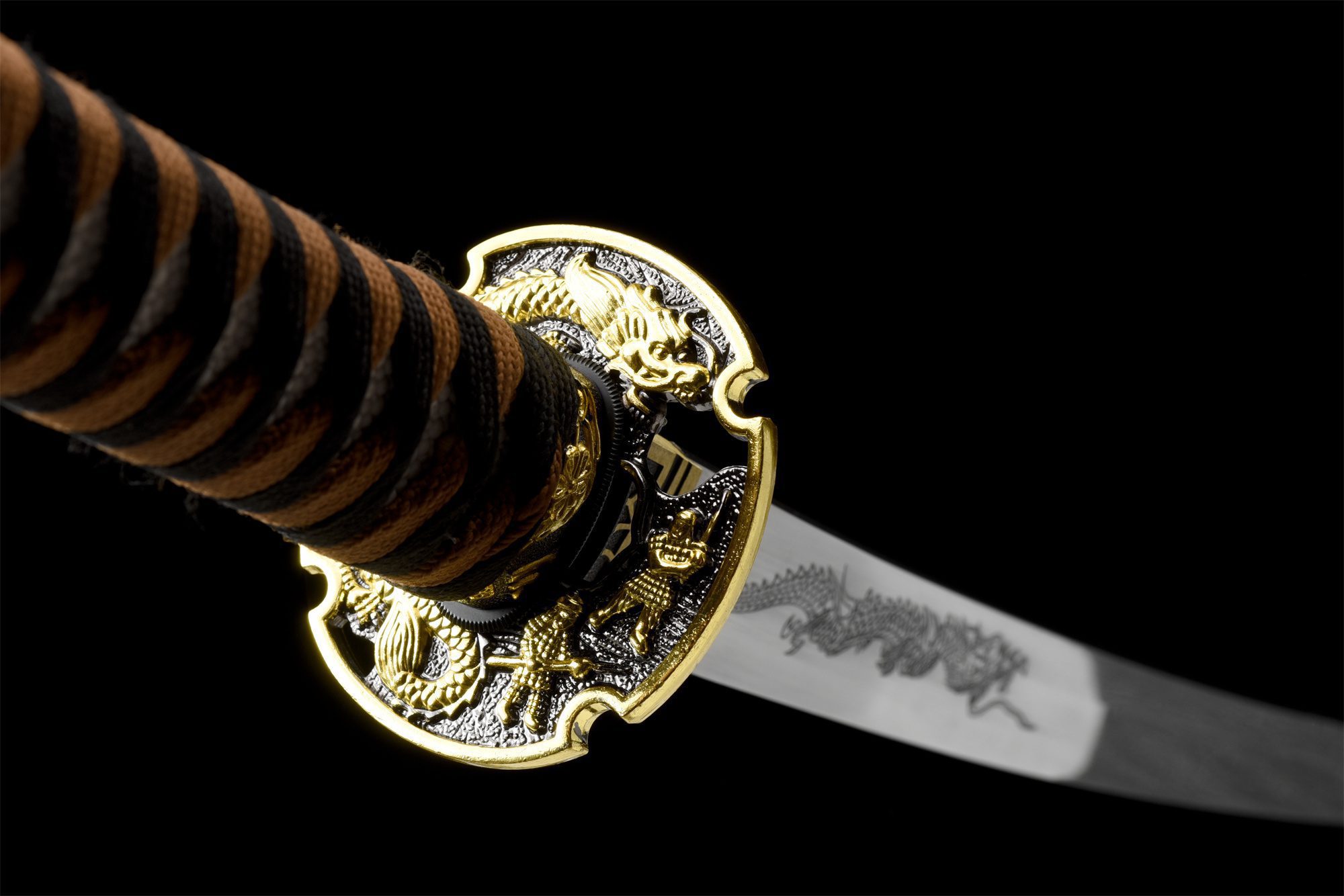 - Stichblatt (Tsuba 鍔): Abgerundetes Kreuz, vergoldet und schwarze Legierung mit Drachen um das Stichblatt.