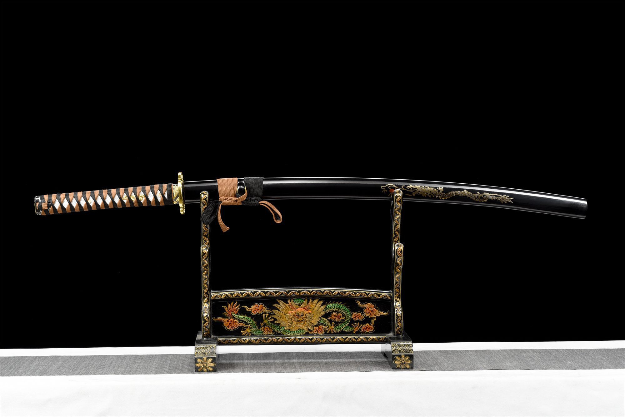 - Schwertscheide (Saya 鞘): Schwarz lackierte Holzscheide mit goldenem Drachen.