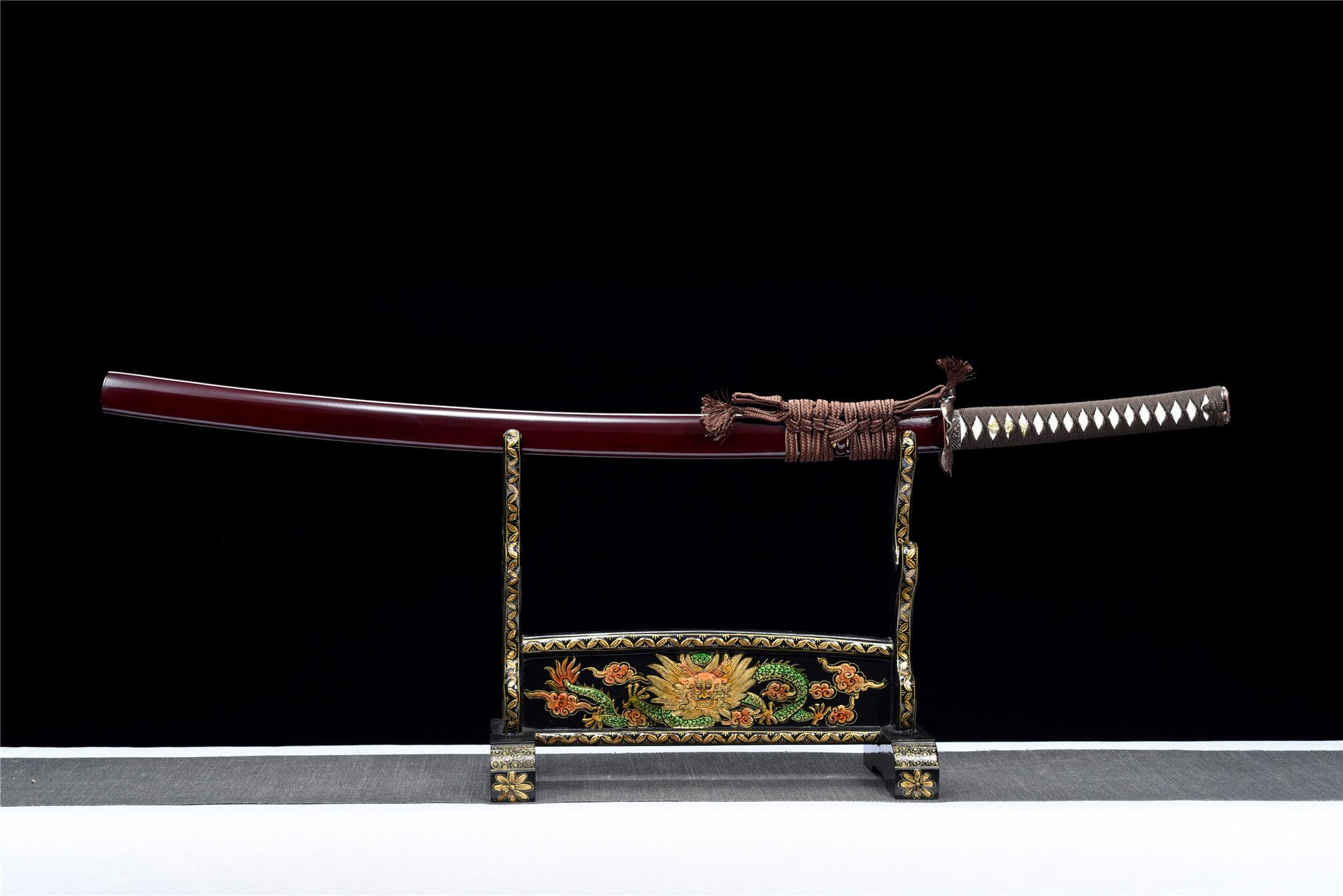- Schwertscheide (Saya 鞘): Rot lackiertes Holz.