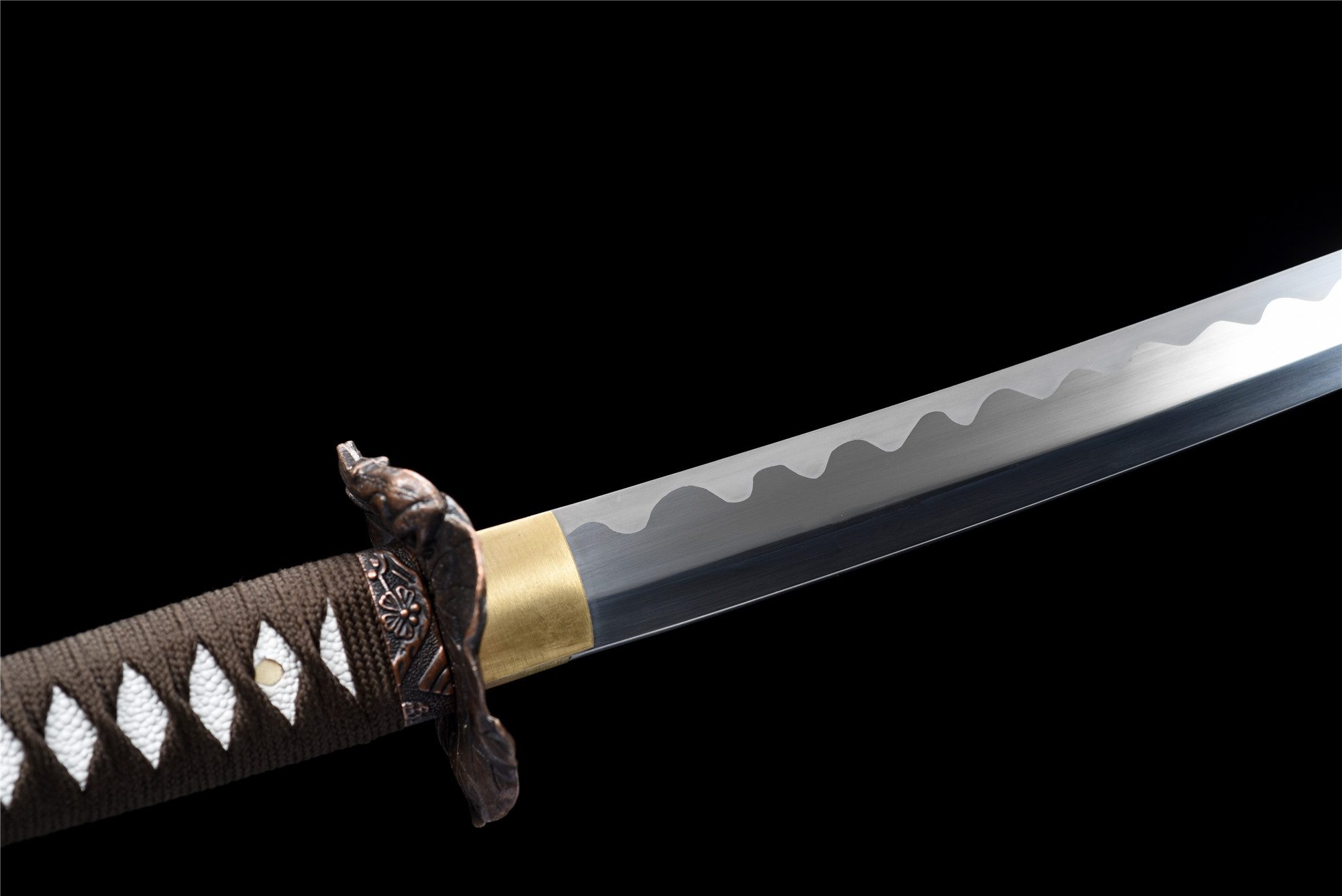 Die Klinge aus Manganstahl weist ein echtes Hamon auf, das Ergebnis einer traditionellen unterschiedlichen Härtung, die subtile Wellen entlang der Schneide erzeugt. Die bronzerne Tsuba ist mit einem Blattmotiv in Relief verziert, das harmonisch zu den floralen Verzierungen auf Fuchi und Kashira passt und eine raffinierte dekorative Einheit schafft. Der Griff kombiniert die Textur von weißem Kunstrochenleder mit braunen, rautenförmigen Flechtungen, während die goldenen Menuki einen Hauch von zurückhaltender Eleganz verleihen. Die rot lackierte Schwertscheide bildet einen schönen Kontrast zum braunen Sageo und sorgt für ein ausgewogenes Farbschema.