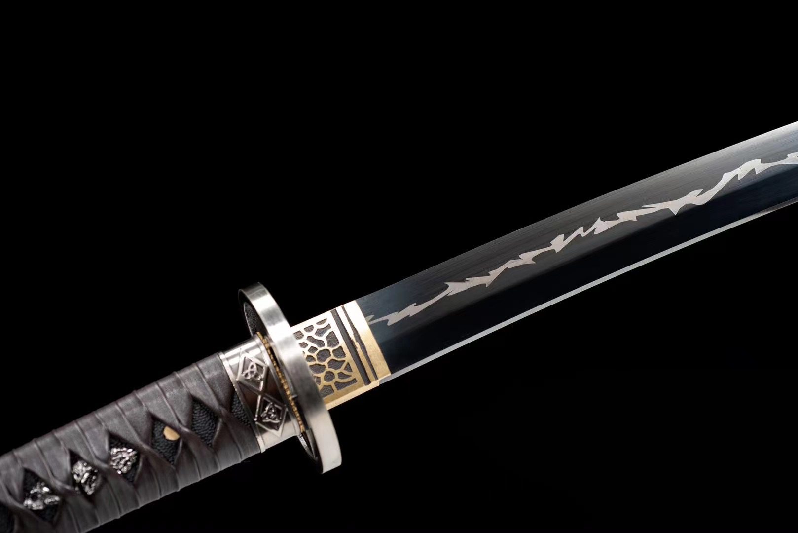 Seine schwarze Klinge aus T10-Stahl ist mit einem prächtigen Blitz verziert, während seine polierte Oberfläche subtile Reflexionen offenbart, die an elektrische Blitze erinnern. Die runde Tsuba aus Silberlegierung ist mit einer präzise gravierten Gravur eines Dreifusses des Lebens verziert, einem alten Symbol für das Gleichgewicht zwischen den drei grundlegenden Kräften des Universums. Der Griff kombiniert schwarzes Kunstrochenleder mit traditionellem Holz und ist mit schwarzem Tsuka-Ito-Geflecht mit Rautenmustern überzogen, die an Drachenschuppen erinnern. Die Menuki stellen schwarze Drachen dar, mythische Wächter der Weisheit und Verwandlung. Die braune Schwertscheide verleiht dem Schwert einen Hauch von irdischer Eleganz, ergänzt durch das passende Sageo, das das traditionelle Tragen erleichtert.