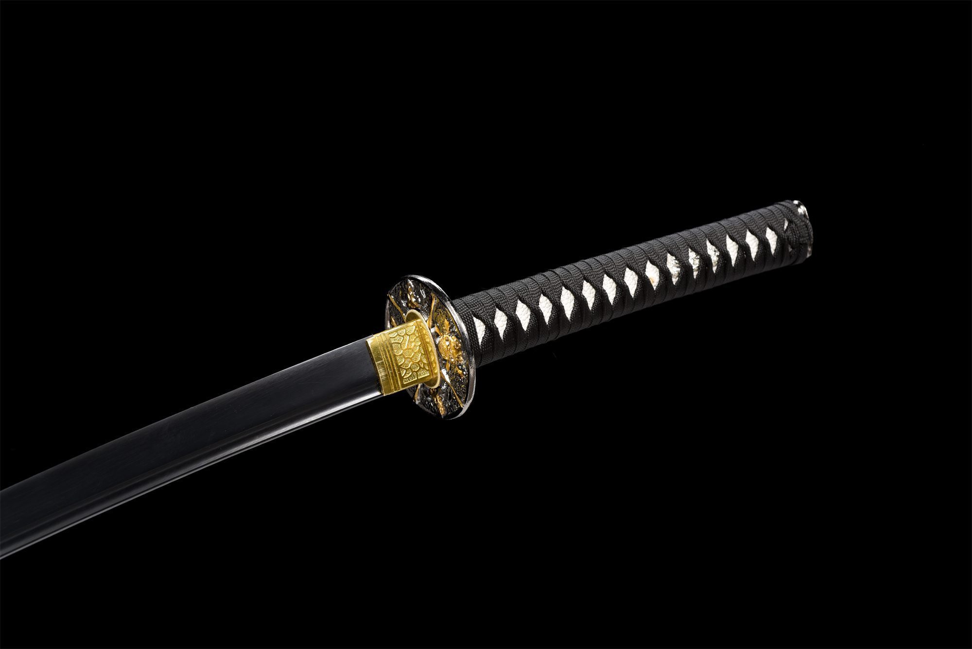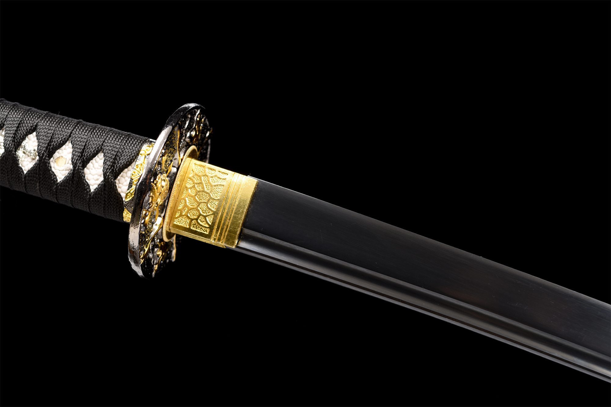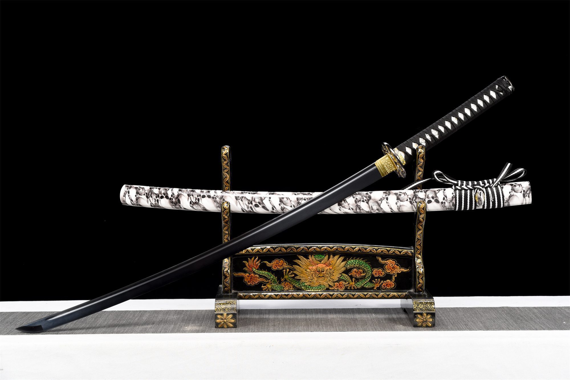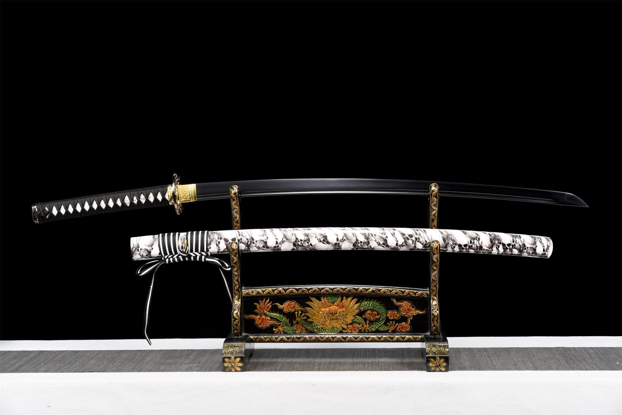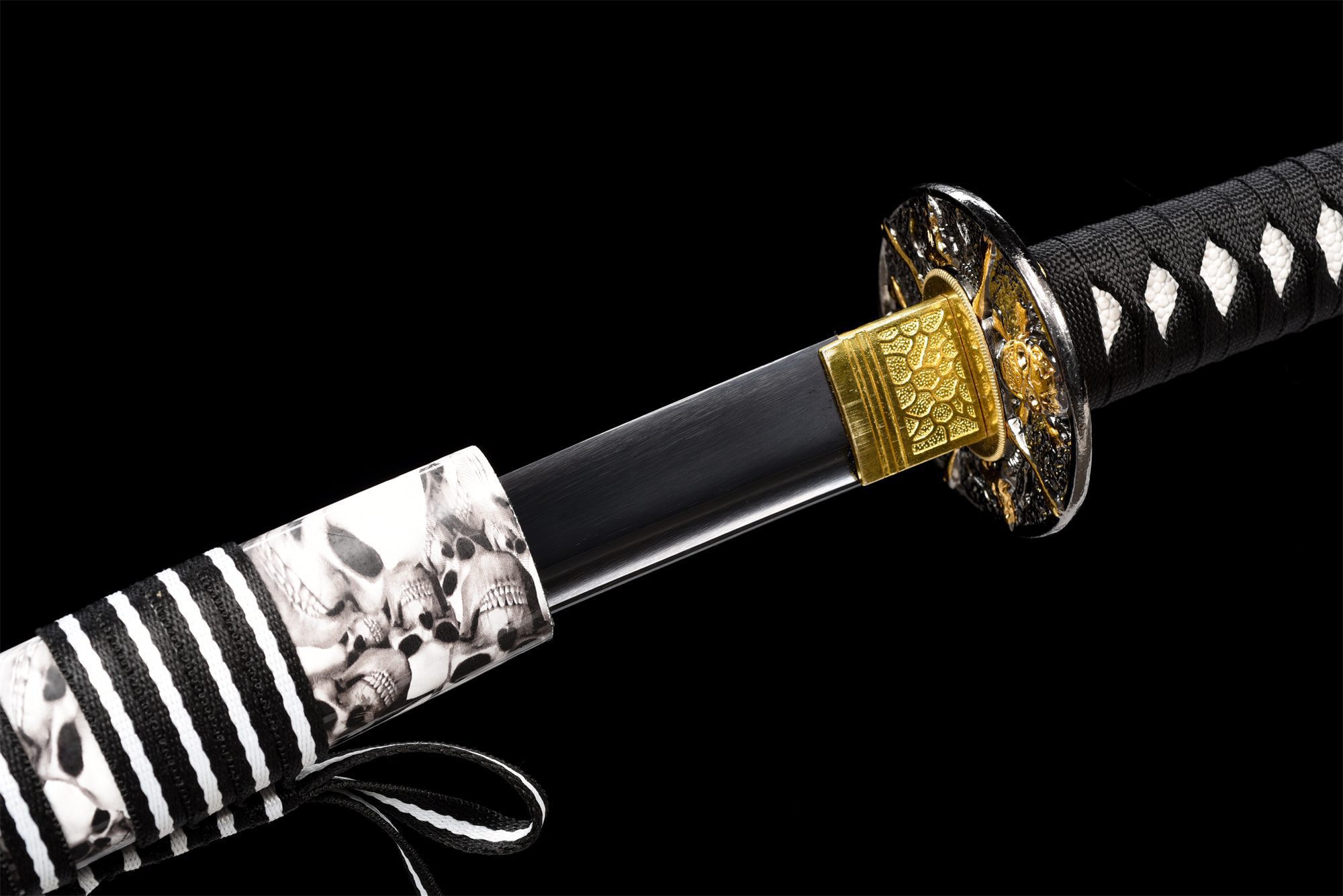 Die Klinge aus 1060er Stahl verfügt über eine tiefschwarze Oberfläche, die das Licht absorbiert und der Waffe eine geheimnisvolle Aura verleiht. Die in den Stahl geschnitzte Bo-Hi lockert die Struktur auf und erzeugt beim Bewegen einen charakteristischen Pfeifton. Die runde schwarze Tsuba aus Legierung zeichnet sich durch ihren zentralen goldenen Totenkopf aus, ein universelles Symbol für die Sterblichkeit. Der Griff kombiniert harmonisch weiße Kunstrochenhaut und schwarzes, rautenförmiges Geflecht und schafft so einen auffälligen Kontrast, der durch die silbernen Menuki noch verstärkt wird. Die schwarz lackierte Holzscheide zeigt weiße Totenköpfe, die aus der Dunkelheit hervortreten, während das zweifarbige schwarz-weiße Sageo das Gleichgewicht zwischen Licht und Dunkelheit symbolisiert.