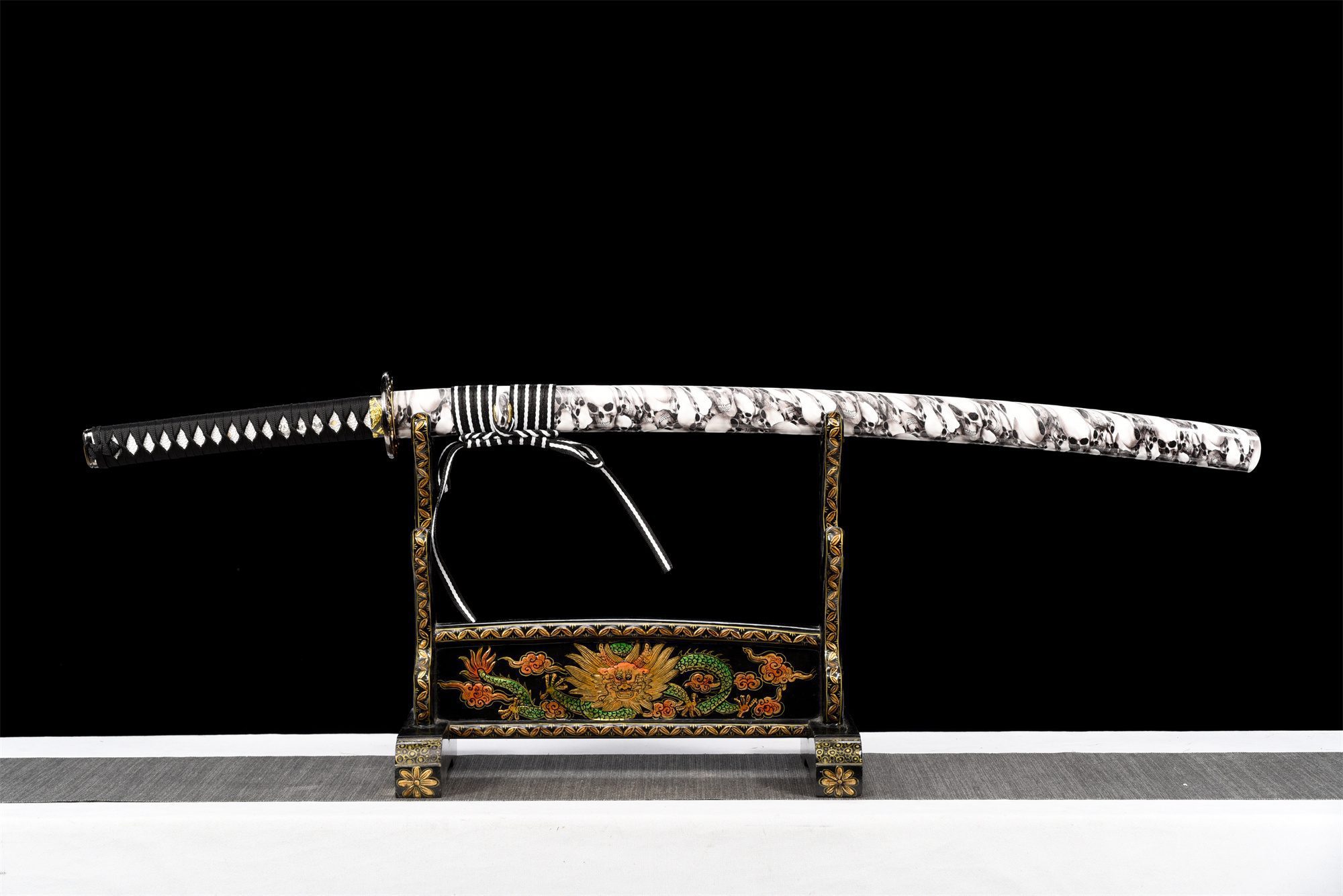 - Schwertscheide (Saya 鞘): Schwarz lackiertes Holz, verziert mit weißen Totenköpfen.