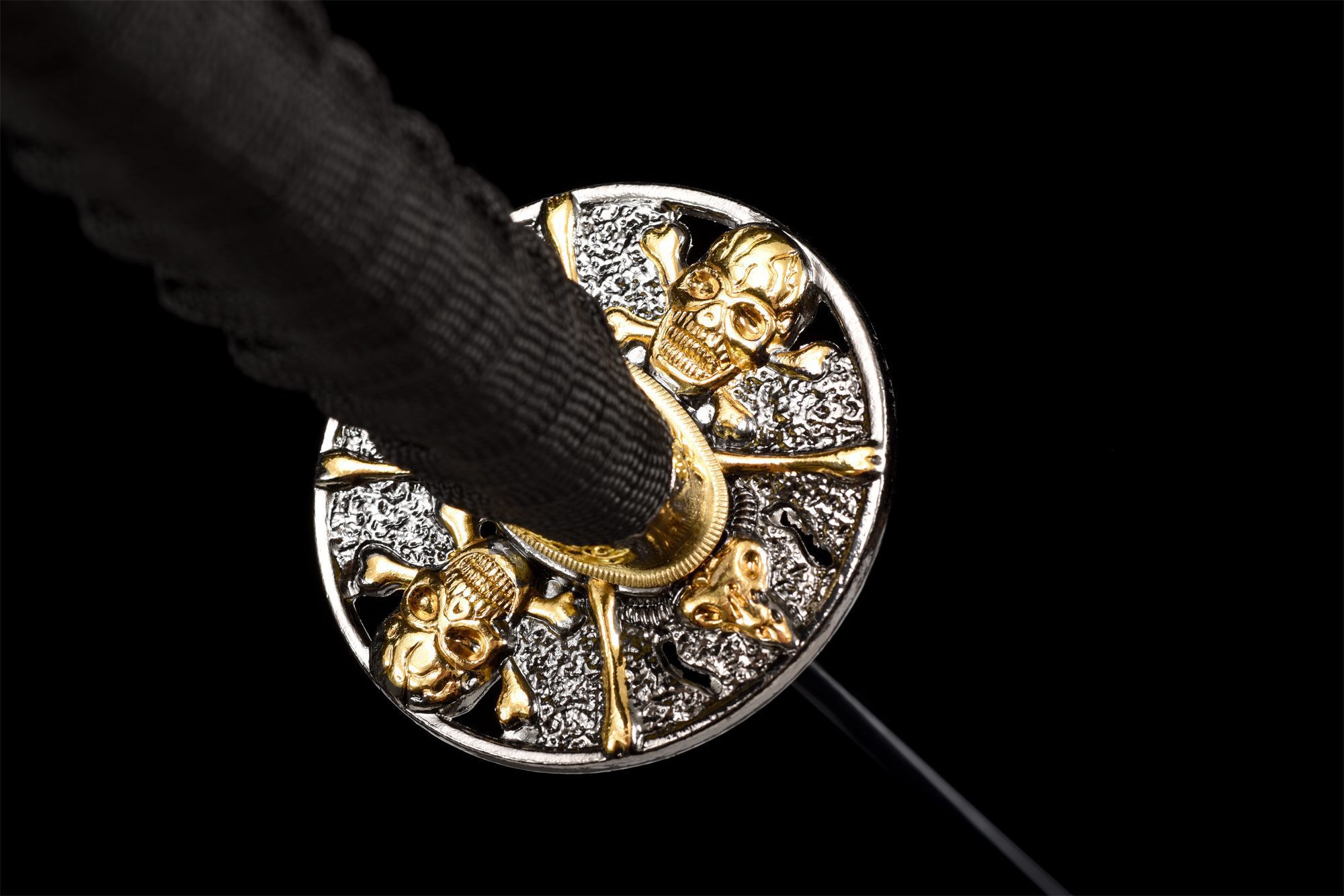 - Stichblatt (Tsuba 鍔): Runde schwarze Legierung mit goldenem Totenkopf.