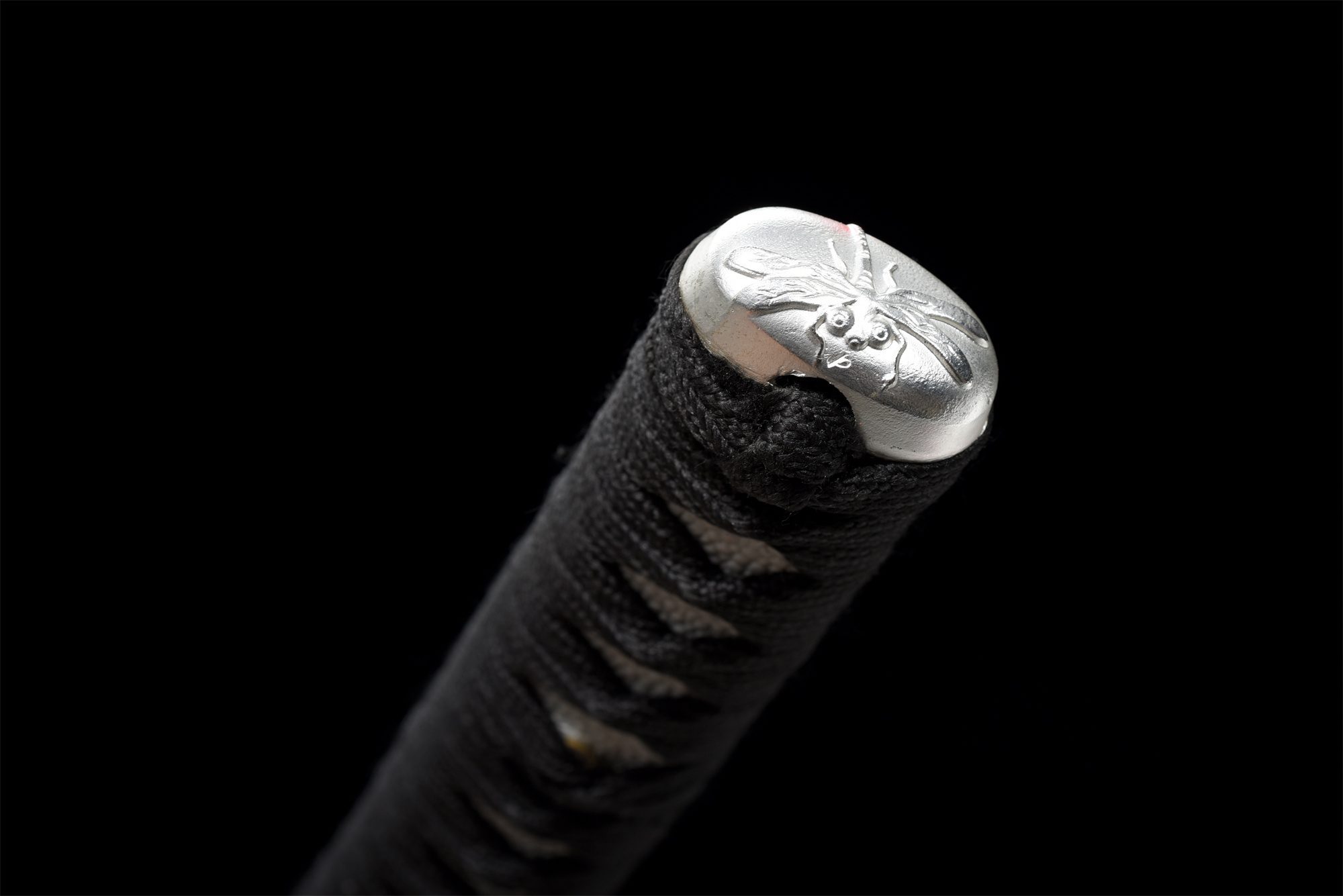 - Stichblatt (Tsuba 鍔): Quadratische Form mit abgerundeten Kanten aus versilberter Legierung, mit einer Gravur mit einem Libellenmotiv versehen.