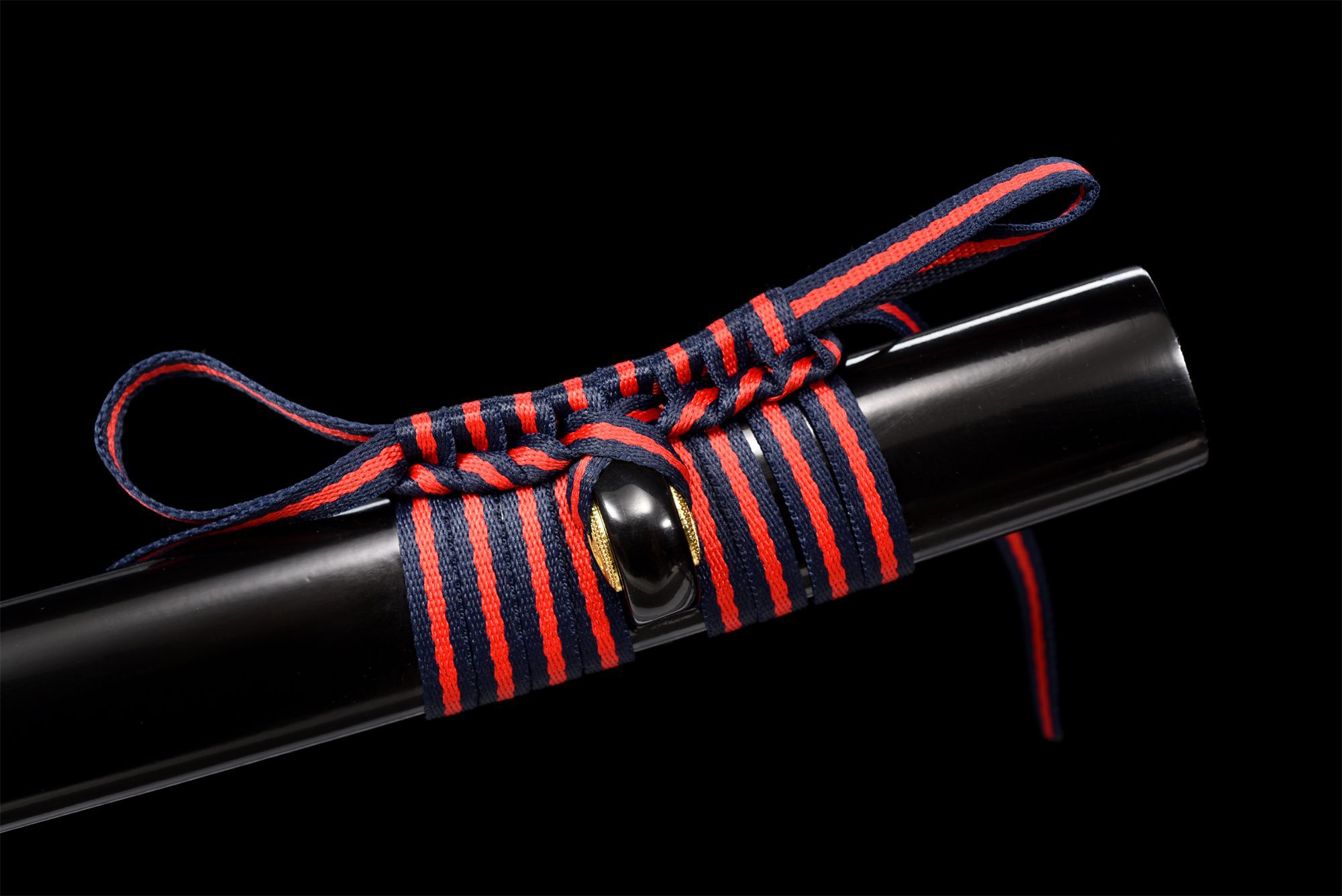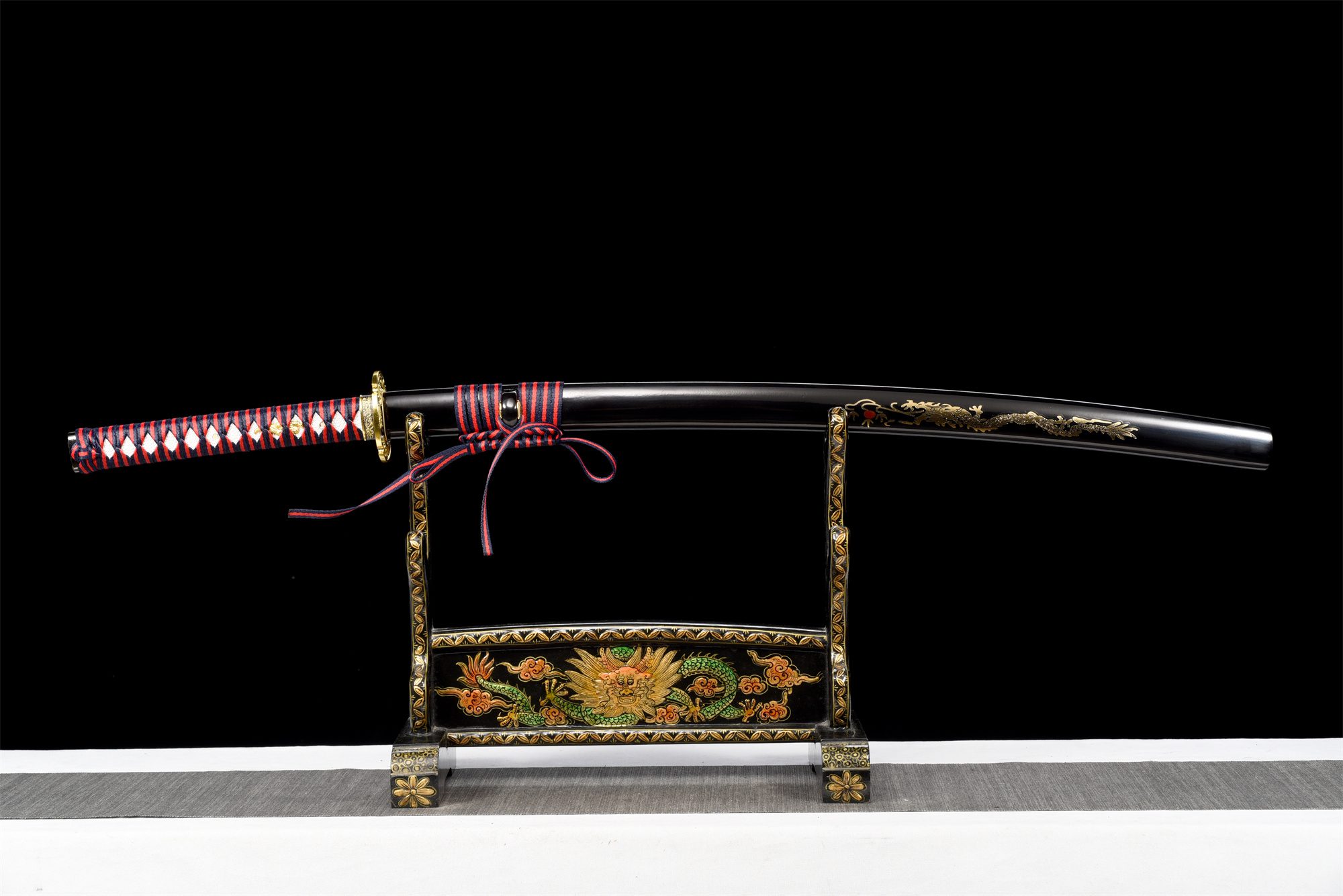 Die Klinge aus 1060er Stahl verfügt über eine tiefschwarze Oberfläche, die einen schönen Kontrast zum echten Notare Hamon bildet, der durch traditionelles Differentialhärten hergestellt wurde. Der Bo-Hi hohlschneidet die Klinge auf subtile Weise, wodurch ihre Struktur leichter wird und sie bei Bewegungen den charakteristischen pfeifenden Klang erzeugt. Die Tsuba aus Goldlegierung verfügt über ein abgerundetes Kreuz, das mit einer fein gravierten Gravur eines Drachen verziert ist, während die Fuchi eine präzise gemeißelte Seeschlange zeigt. Der Griff kombiniert einen Holzsockel, der mit weißer Stachelrochenimitation überzogen und mit blauem und rotem Tsuka-ito umwickelt ist, wodurch ein elegantes Rautenmuster entsteht. Die goldenen Menuki unterstreichen diese harmonische Komposition, und die schwarz-goldene Kashira ist mit zarten Blumenmotiven verziert. Die schwarz lackierte Holzscheide ist mit einem goldenen Drachen verziert, der sich über ihre gesamte Länge schlängelt, ergänzt durch einen Sageo in Blau und Rot, der zum Griff passt.