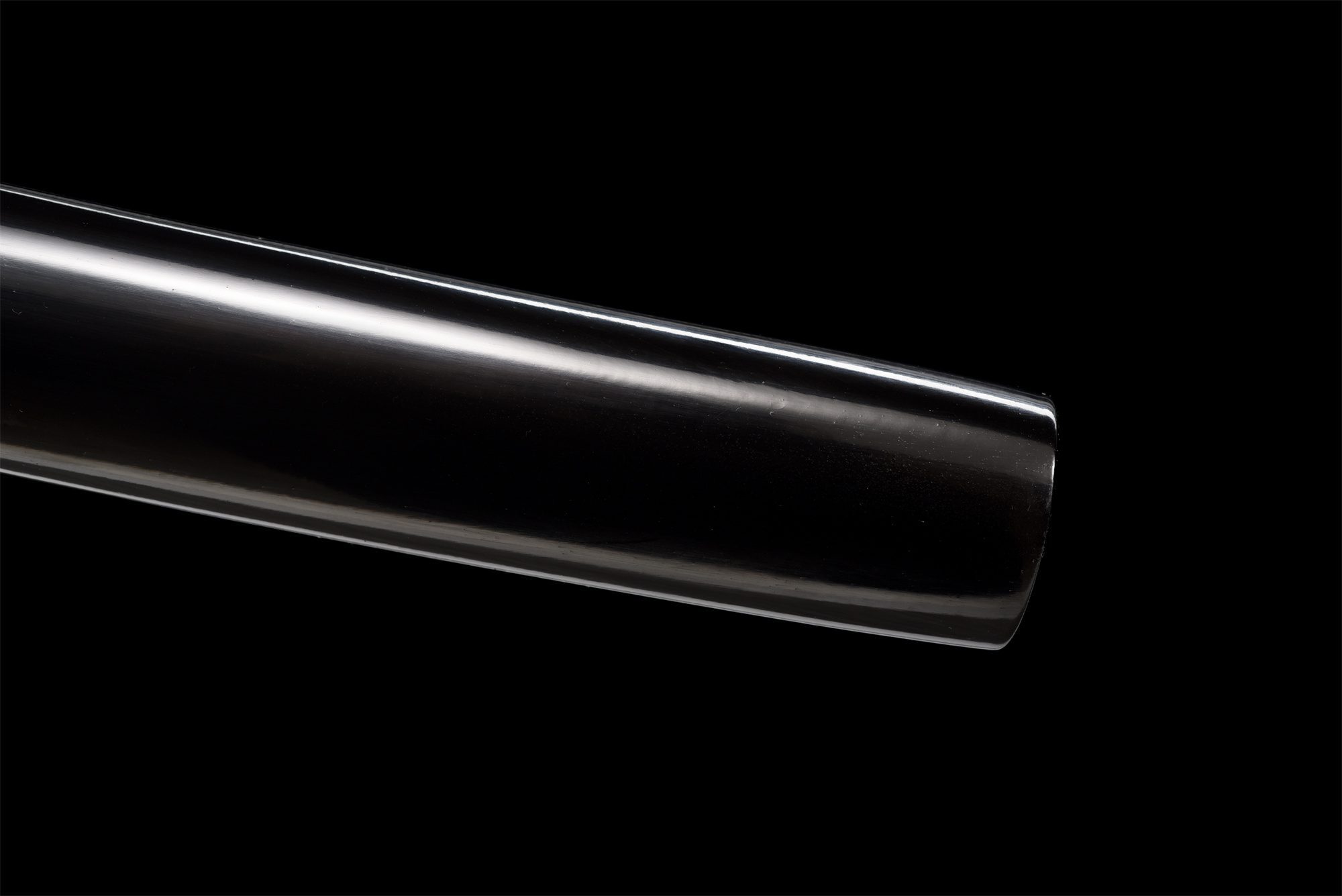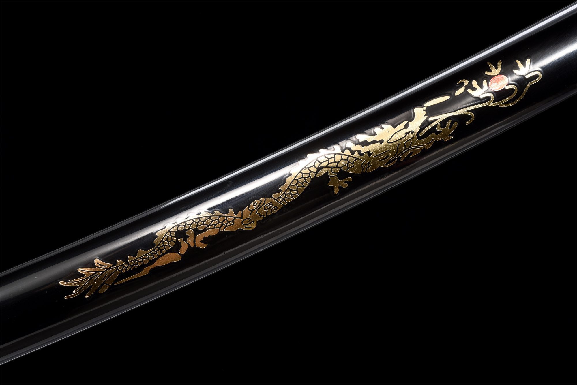 - Schwertscheide (Saya 鞘): Schwarz lackiertes Holz, verziert mit einem goldenen Drachen.
