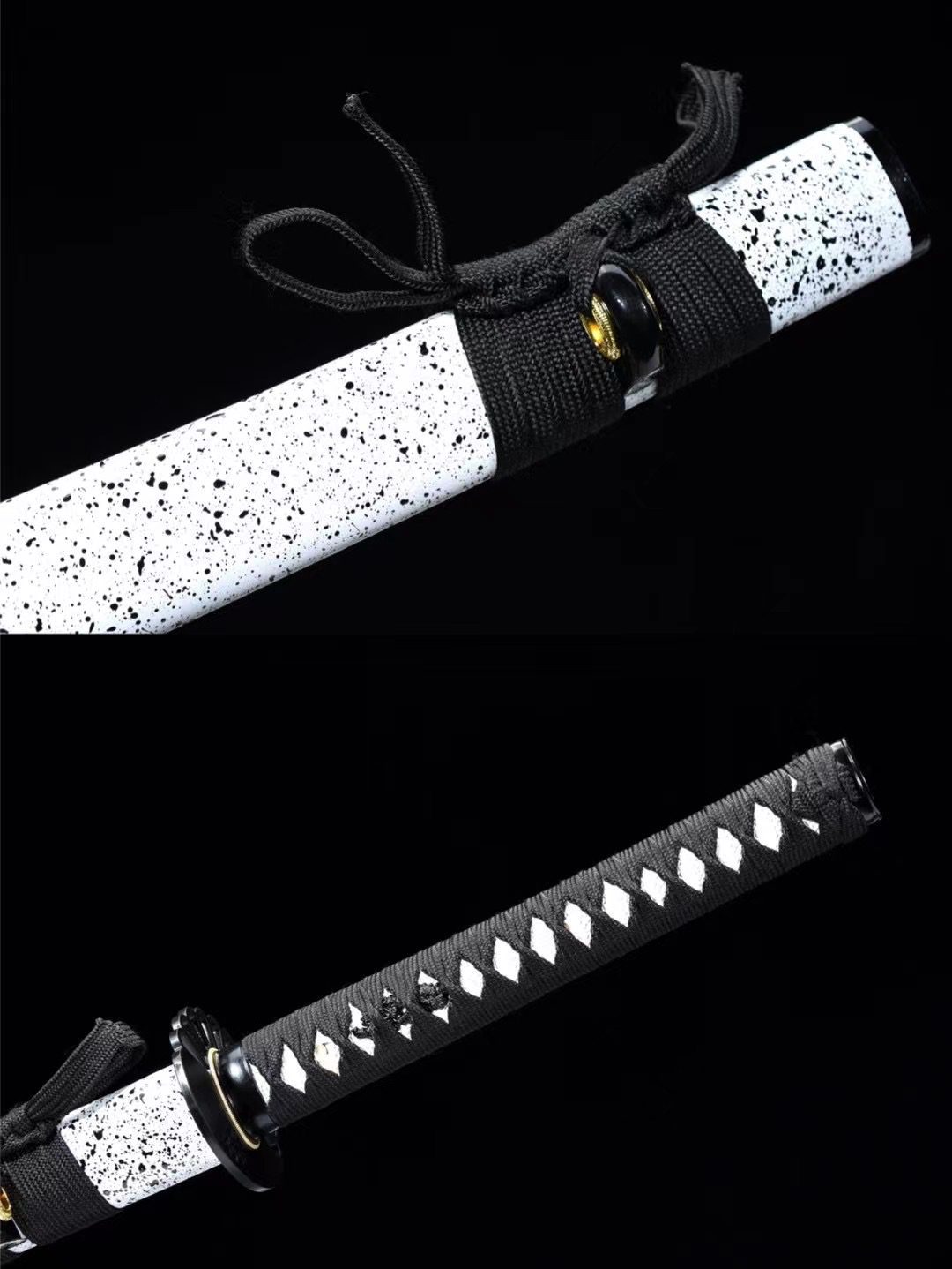 - Schwertscheide (Saya 鞘): weiß lackiertes Holz mit schwarzen Punkten, schwarze Enden (Kojiri und Koiguchi).