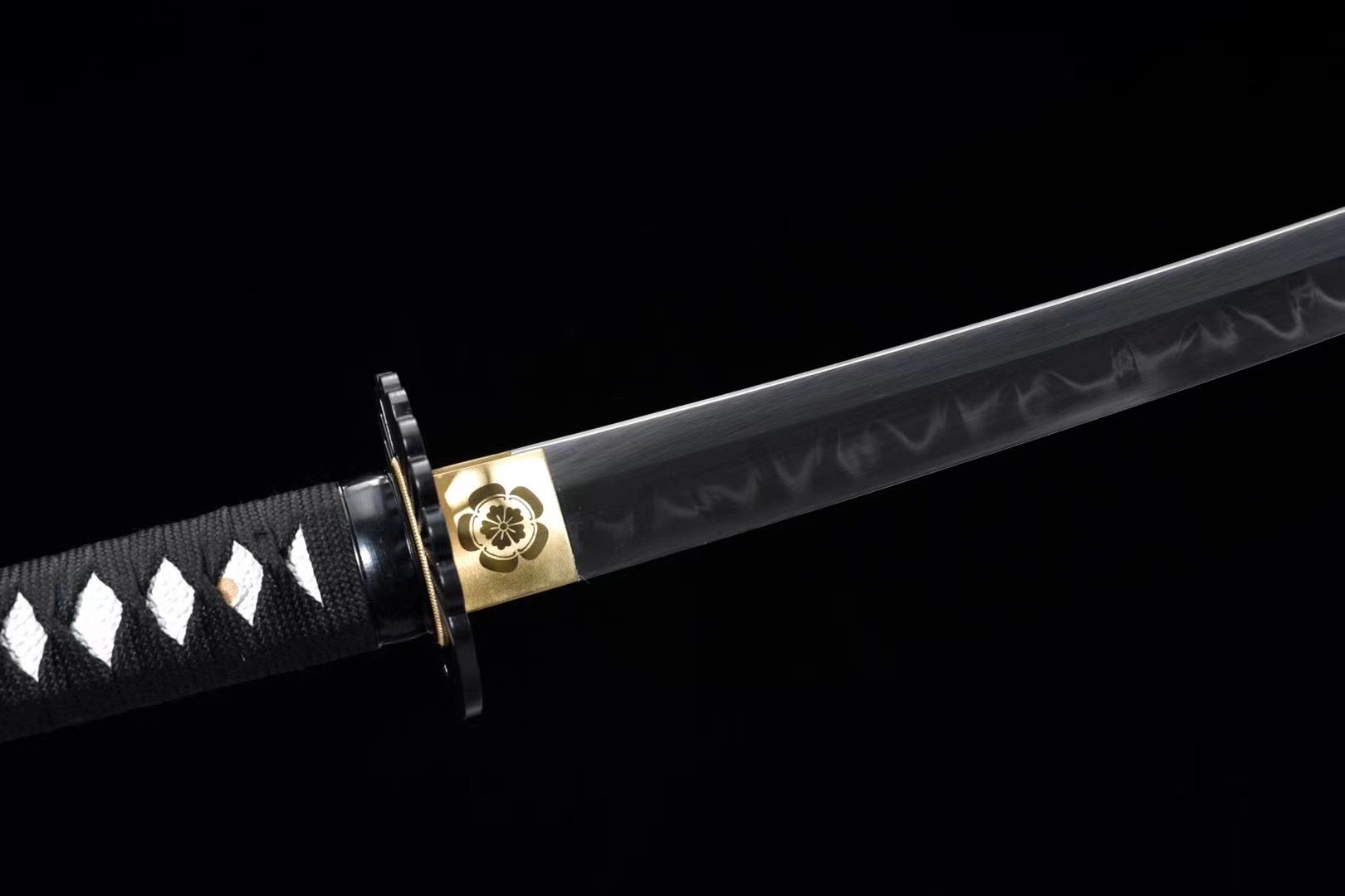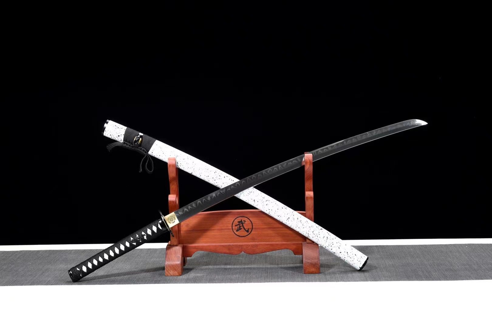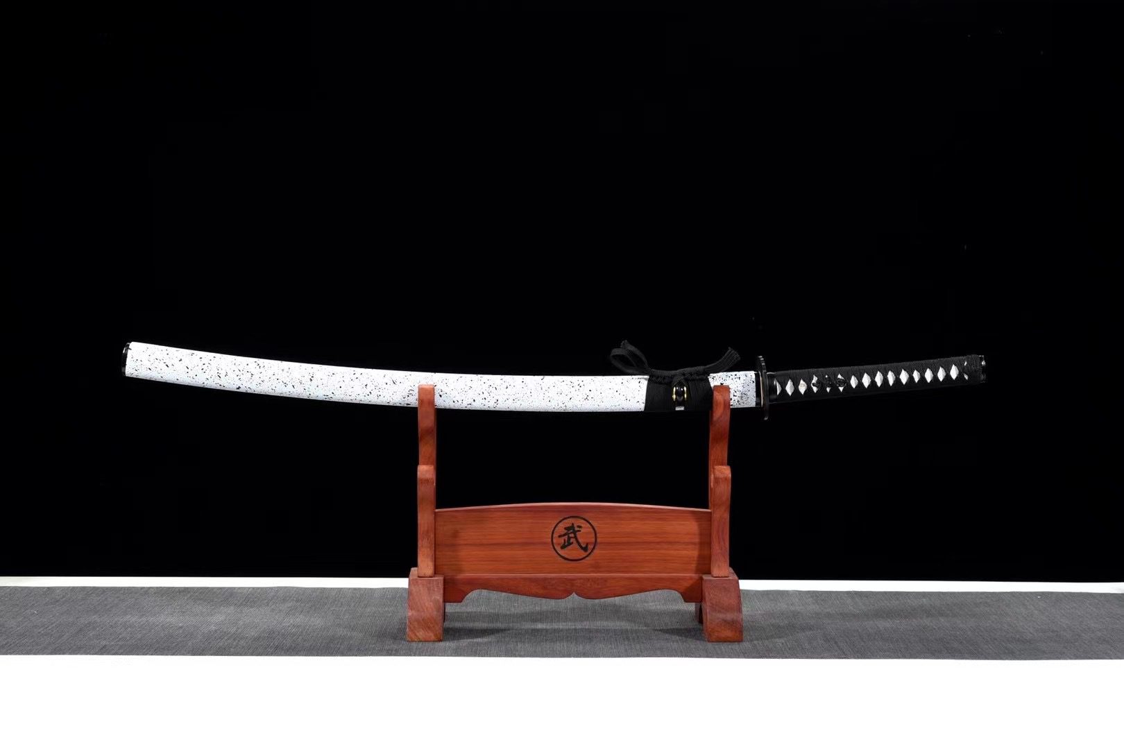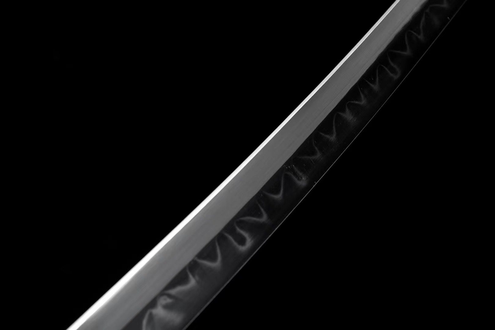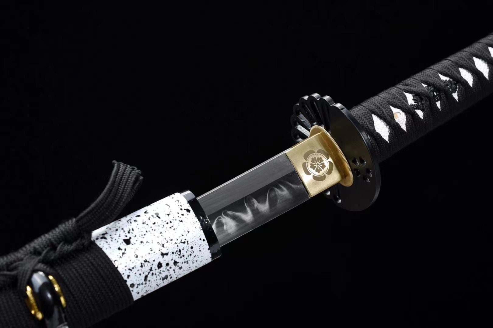 Die Klinge aus T10-Stahl hat eine natürliche Stahloberfläche, die das echte Chōji Hamon hervorhebt, das durch unterschiedliche Härtung erzielt wird und wellenförmige Muster erzeugt, die an Blütenblätter erinnern. Die schwarze Tsuba aus Legierung, rund und zu 80 % massiv, zeichnet sich durch sechs fein geschnitzte Blütenblätter auf der Mune-Seite und eine gemeißelte Blume in der Mitte aus. Der Griff kombiniert authentische weiße Stachelrochenhaut (Samegawa) mit schwarzem Tsuka-ITO-Geflecht in Rautenmuster, während die Menuki einen schwarzen Drachen darstellen, der Schutz symbolisiert. Die weiß lackierte Holzscheide (Saya) mit schwarzen Punkten bildet einen auffälligen Kontrast zu den schwarzen Enden von Kojiri und Koiguchi und wird durch ein schwarzes Sageo ergänzt.