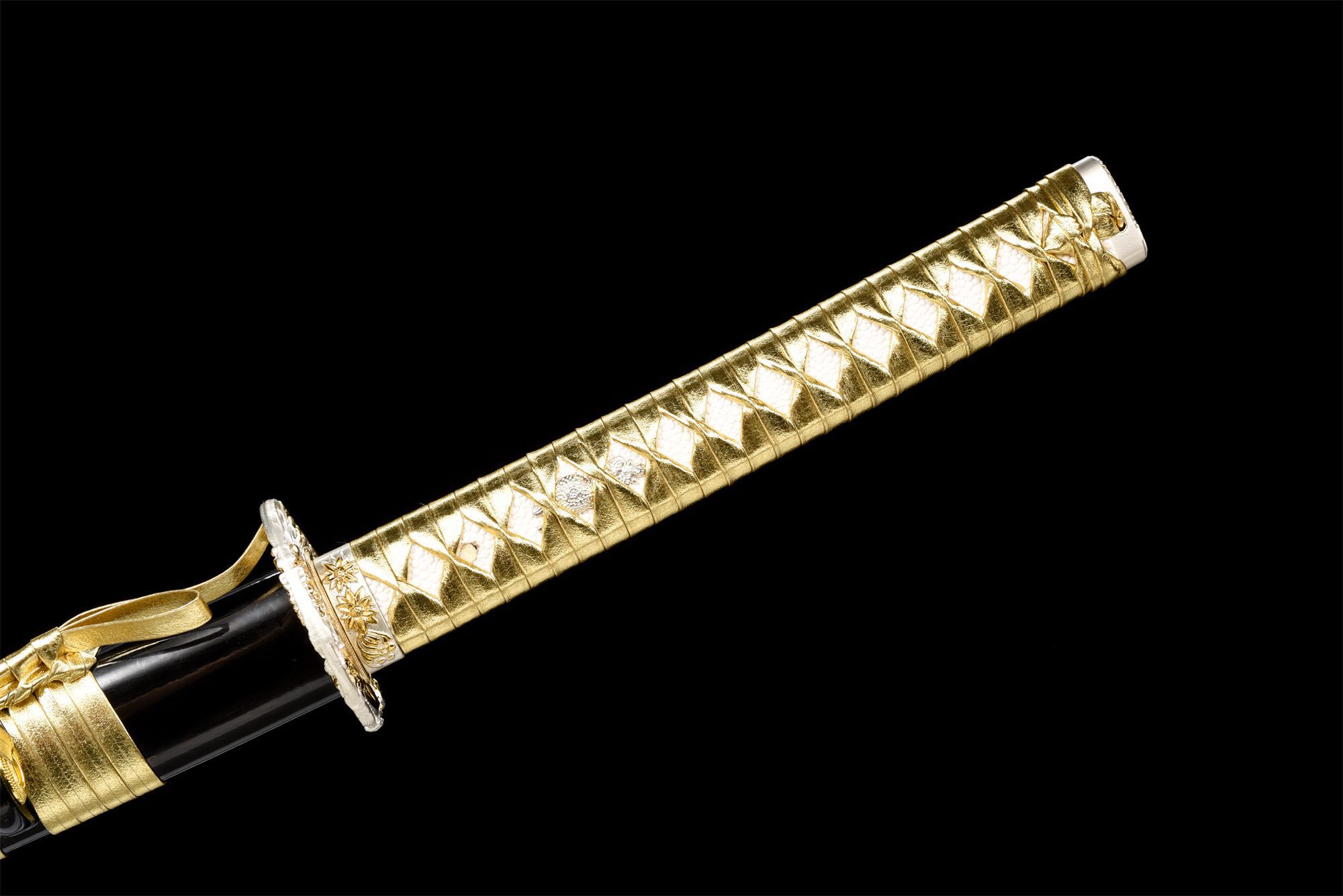 Die Klinge aus 1060er Stahl verfügt über eine tiefschwarze Oberfläche, die einen schönen Kontrast zu den goldenen Akzenten bildet, während das durch unterschiedliche Härtung erzielte echte Hamon Notare wellenförmige Muster entlang der Kante erzeugt. Das Bo-hi höhlt die Klinge elegant aus, wodurch ihr Gewicht reduziert wird, während ihre strukturelle Integrität erhalten bleibt. Die abgerundete Tsuba aus einer Weiß-Gold-Legierung weist zarte Blumenmuster auf, die sich harmonisch auf Fuchi und Kashira wiederholen und eine bemerkenswerte ästhetische Konsistenz schaffen. Der Griff kombiniert weiße Kunstrochenhaut mit goldenen Lederflechtungen in einem Rautenmuster und bietet einen sicheren Halt und ein luxuriöses Aussehen. Die schwarz-gold lackierte Holzscheide vervollständigt dieses raffinierte Ensemble, das durch ein goldenes Sageo ergänzt wird, das einen letzten Hauch von Eleganz verleiht.