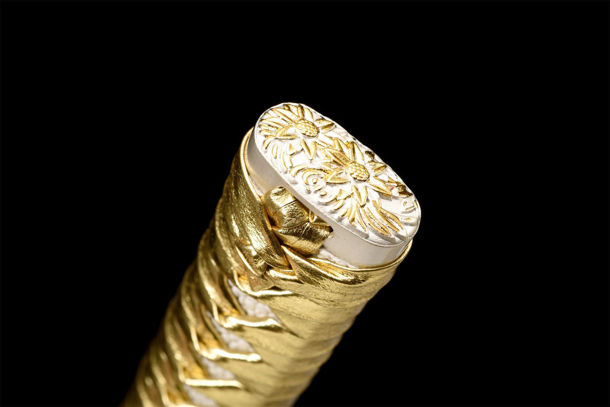 - Kashira (頭): Weiß-Gold-Legierung mit Blumenmotiven.