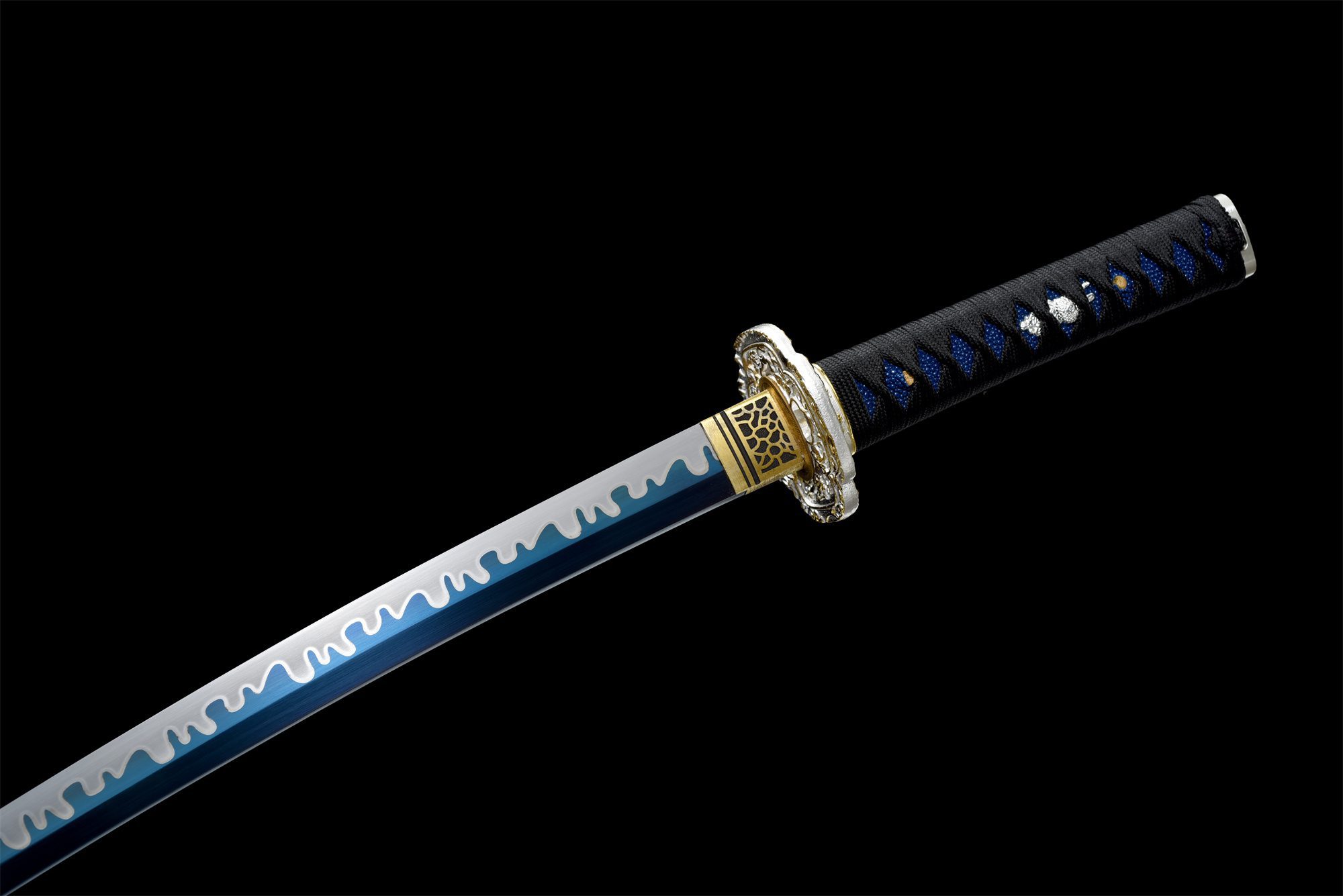 Die Klinge aus Manganstahl besticht durch einen prächtigen Blauton, der an die kalten Flammen eines schlafenden Vulkans erinnert, während das sichtbare Hamon wellenförmige Linien entlang der Schneide zeichnet. Die kreuzförmige Tsuba, fein ziseliert in Silber- und Goldtönen, bildet einen eleganten Kontrast zu dieser azurblauen Klinge. Der Griff aus Massivholz, überzogen mit blauem Kunstrochenleder, bietet einen sicheren und bequemen Halt, der durch die schwarze, diamantförmige Flechtung des Tsuka-ito noch verstärkt wird. Die Menuki mit silbernen Drachenmotiven verleihen dem Ganzen eine mystische Dimension, während die zur Tsuba passenden Fuchi und Kashira für visuelle Harmonie sorgen. Die Schwertscheide aus Massivholz, lackiert in einem Farbverlauf von Schwarz zu Blau, vervollständigt diese eisige Ästhetik mit ihrem zweifarbigen Sageo.